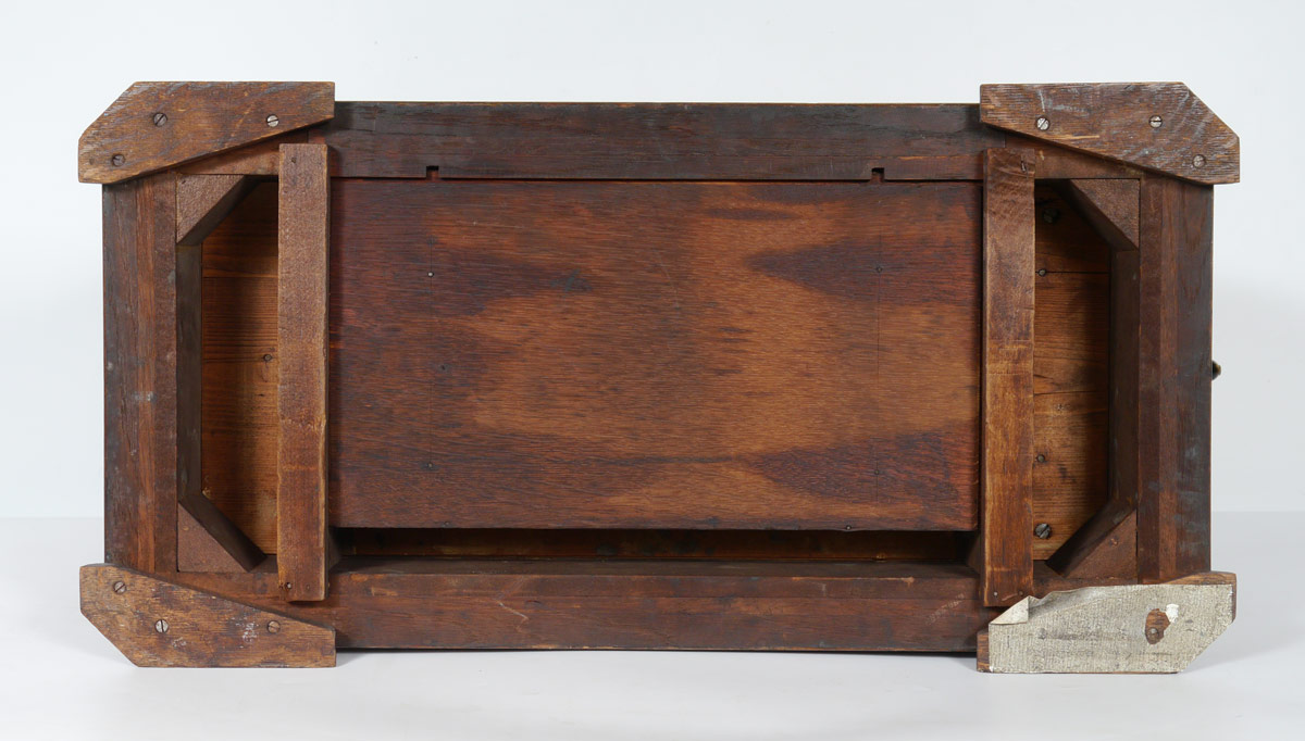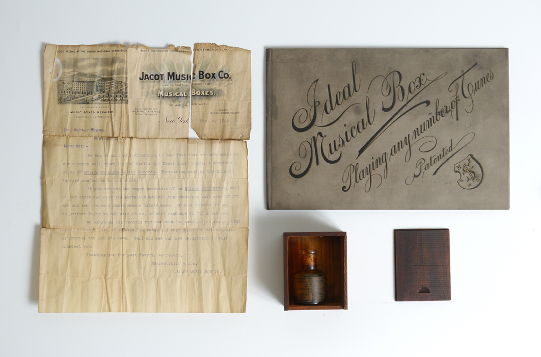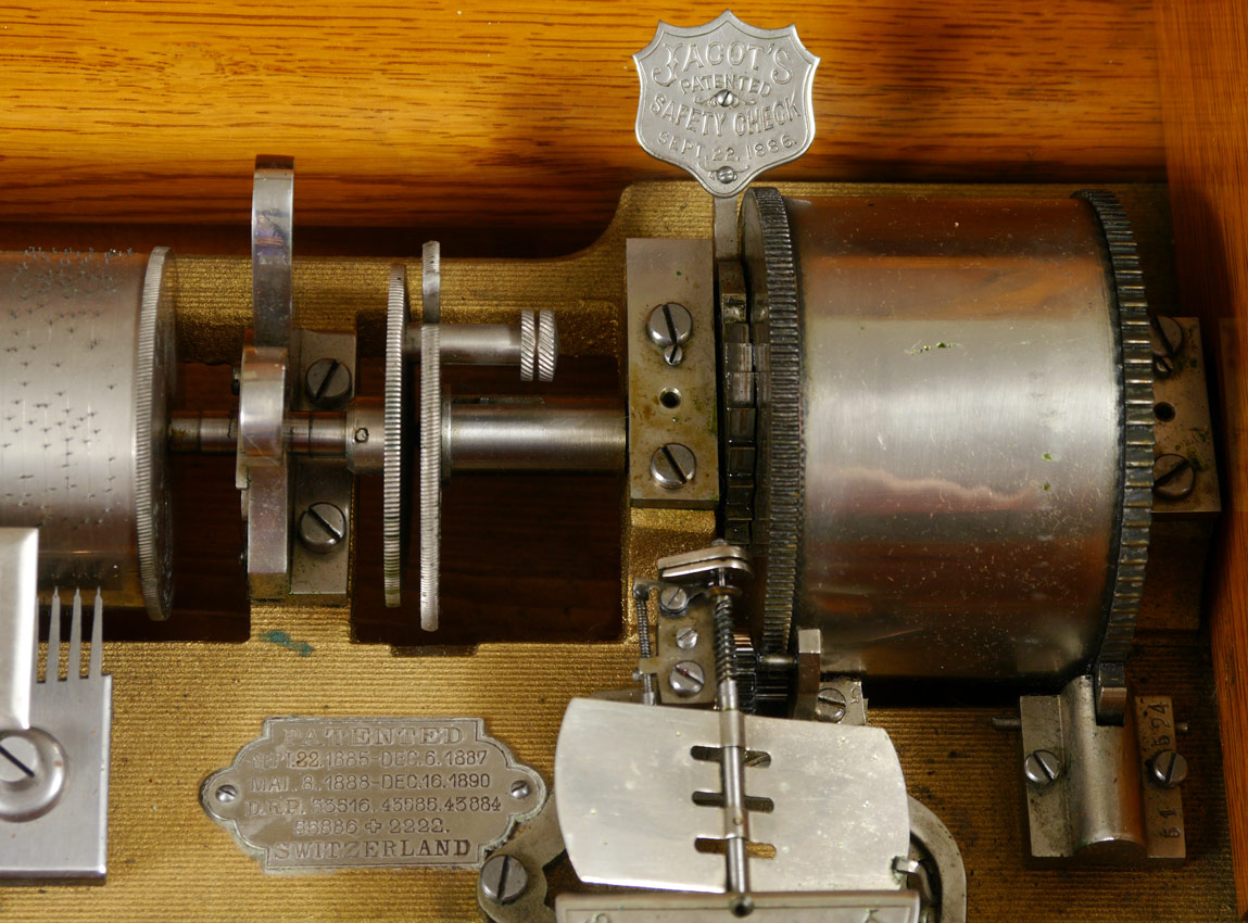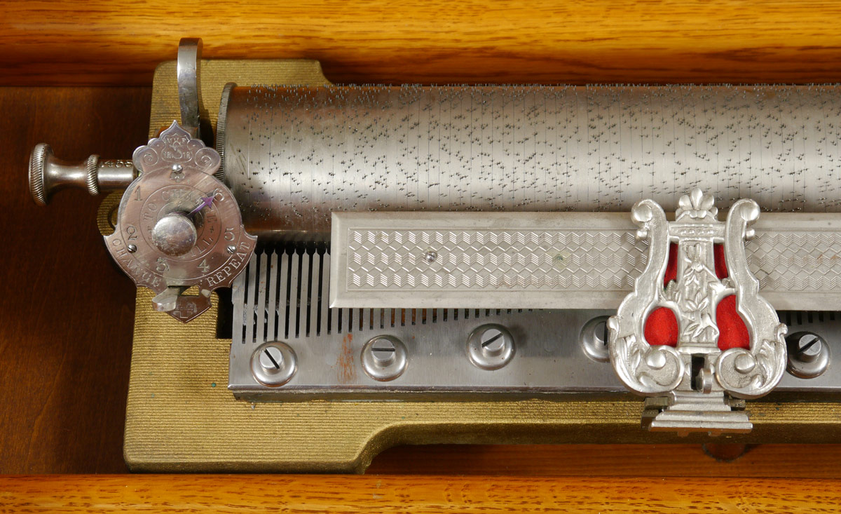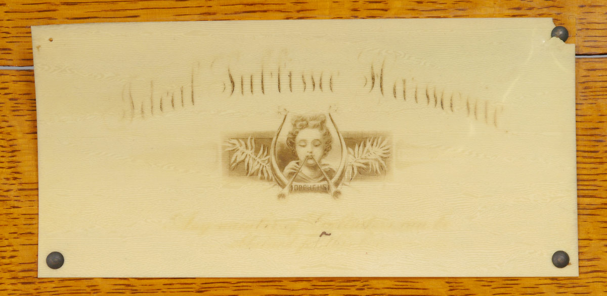 JACOT & SON SWISS CYLINDER MUSIC BOX: Tiger oak case with applied metal decoration including bust of Orpheus. Celluloid tag under lid reads Ideal Sublime Harmonie over Orpheus over illegible writing. Retailed by Jacot & Sons, 298 Broadway, New York. Clean movement, serial number 1458, with all teeth. Lower lockable shelf opens with original Jacot advertisement and empty Jacot bottle of music box oil. Key and crank in office. Measures 10 3/4'' h. x 30 1/4'' x 15 3/4''.