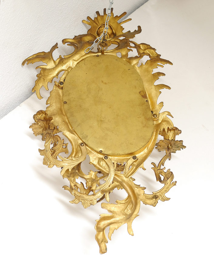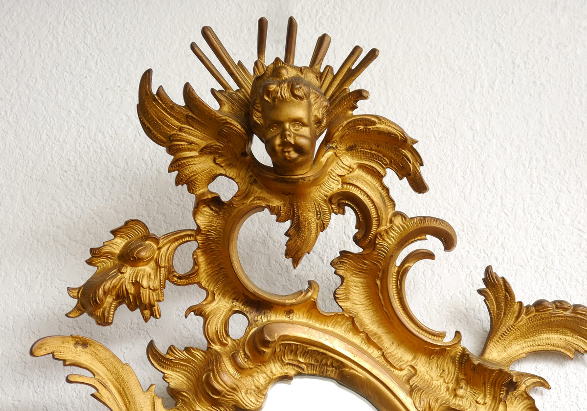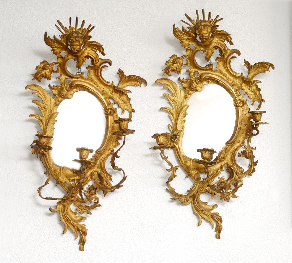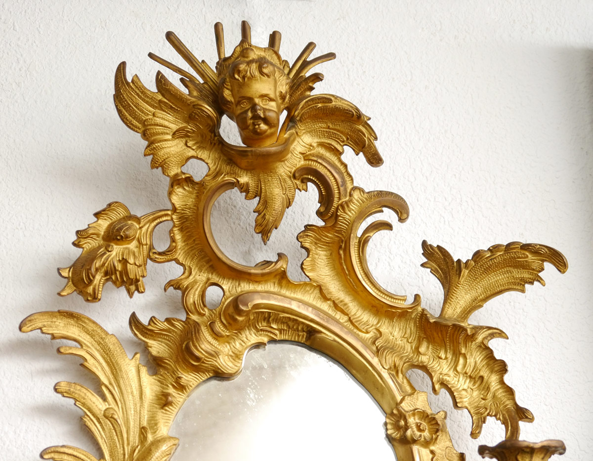PAIR ROCAILLE MIRRORED GILT METAL SCONCES: Figural putti bust final, foliate scroll, shaped mirror, 3 light candelabra. Unmarked as to maker. Overall 25 1/2'' h. x 13 1/4'' x 5''.