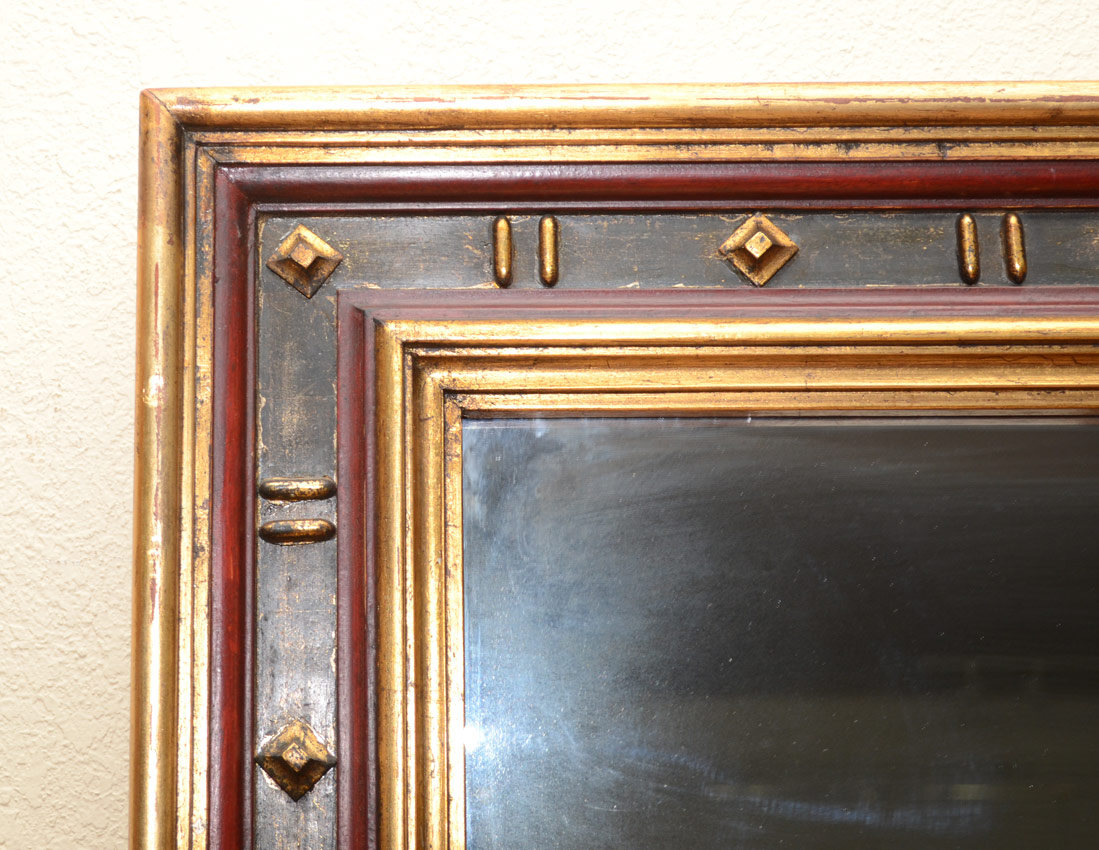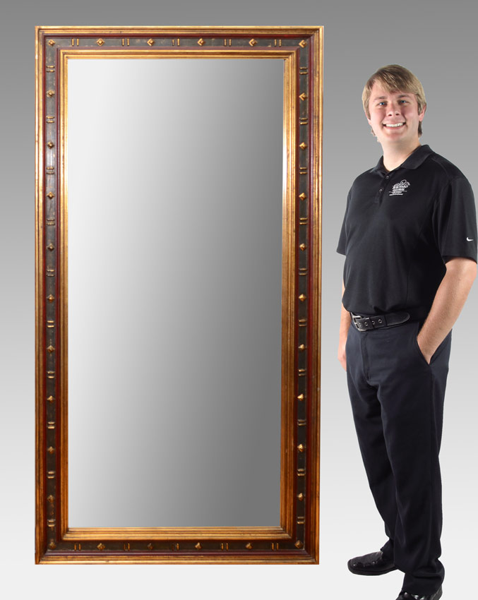 PAINTED AND GILT WOOD FRAMED WALL MIRROR: Frame with applied carved decoration, gilt accented. 79'' h. x 39 1/2'' x 2 3/4''.