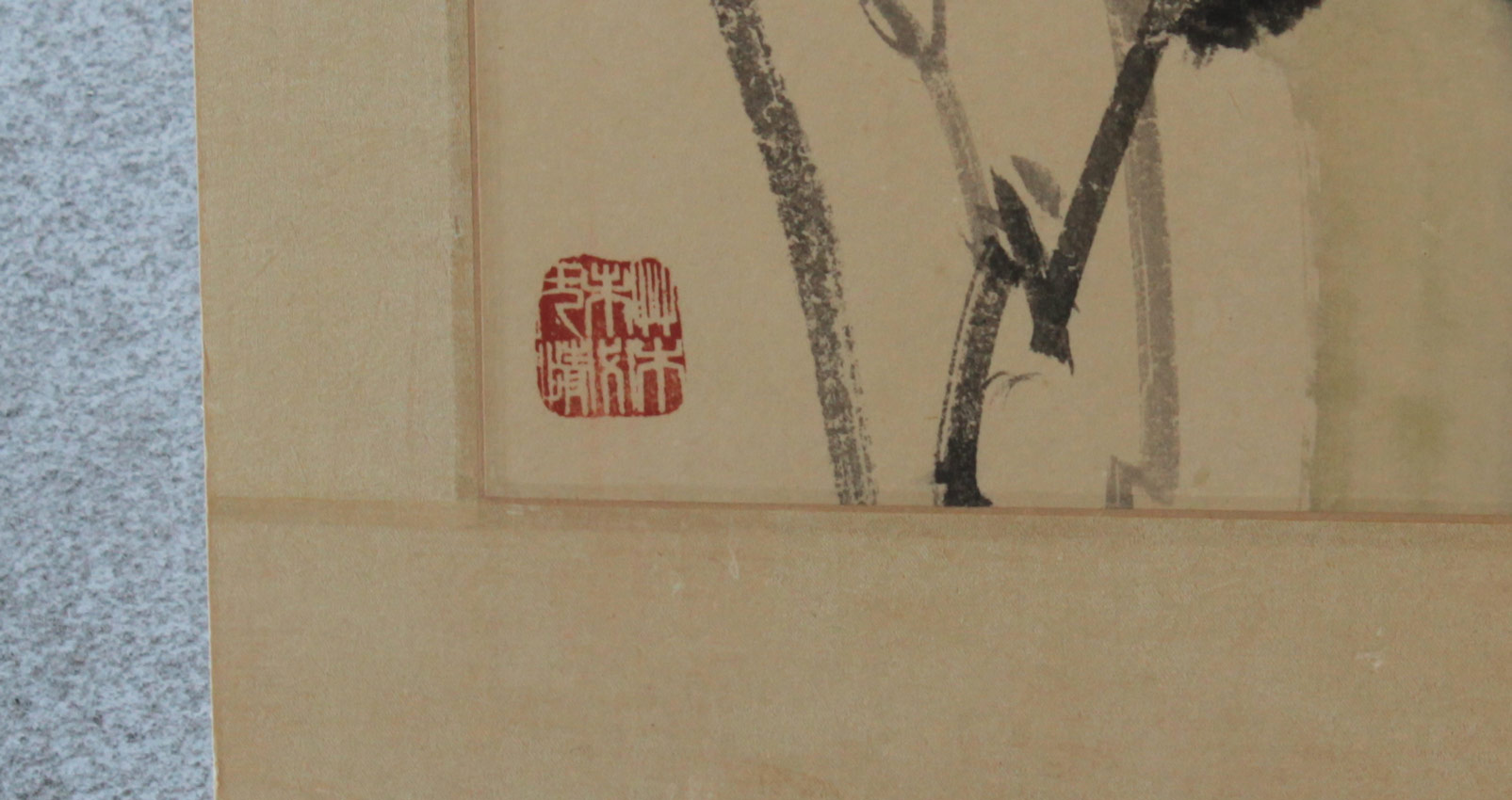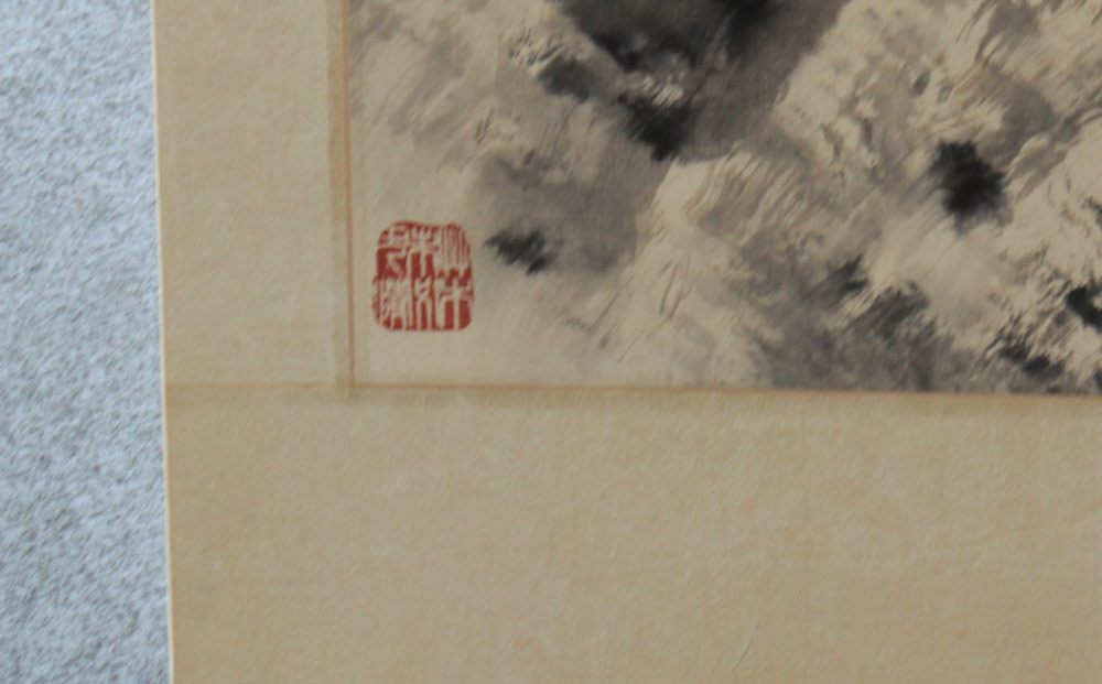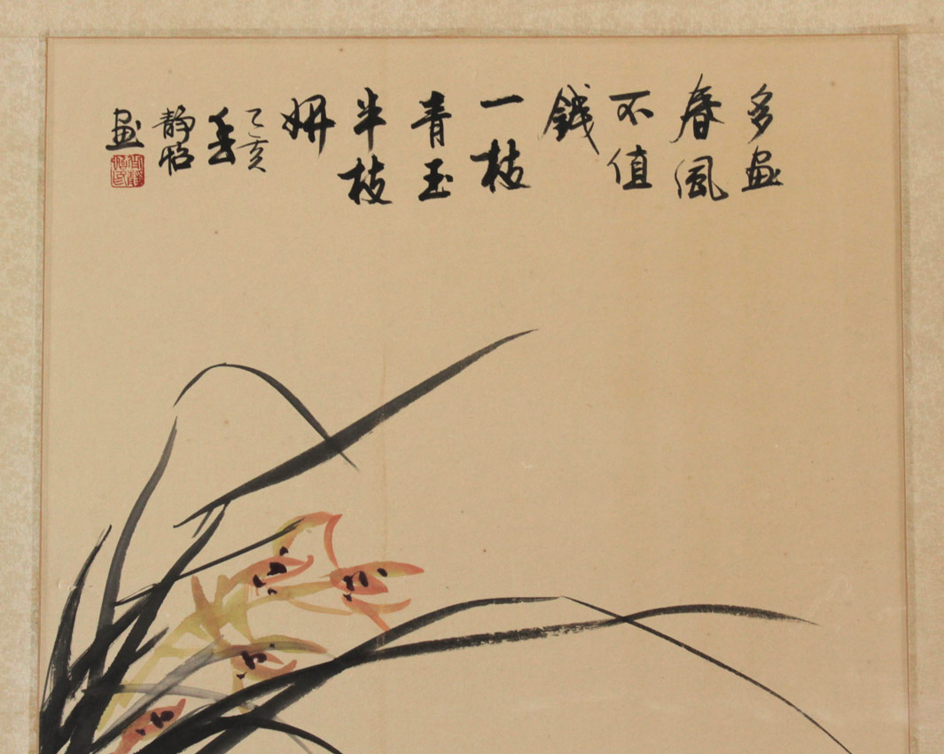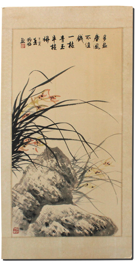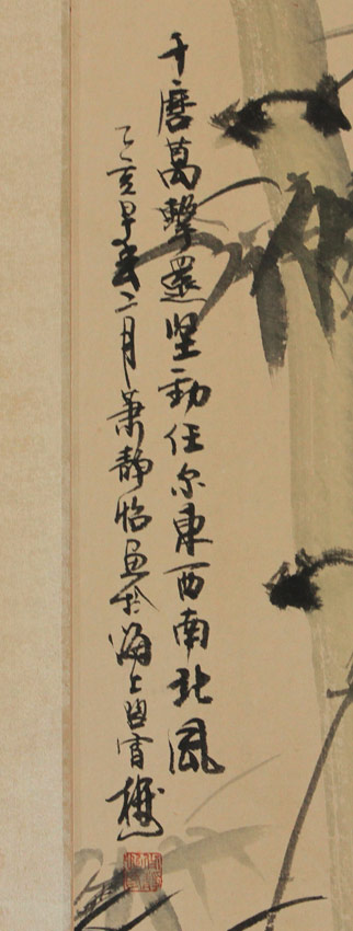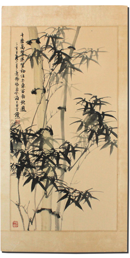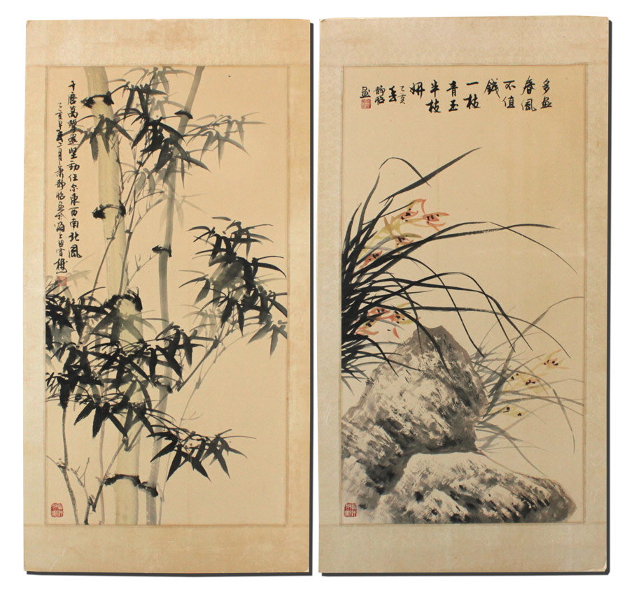 2 LARGE ORIENTAL CHINESE WATERCOLORS: Study of Reeds in Landscape& Study of Bamboo, both have red seals and black ink signatures, image size approximately 35'' x 18 1/4'', Watercolors/laid down on acid free board, with a floral print silk matting, unframed overall measurement 42 1/2'' x 22''.