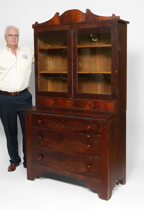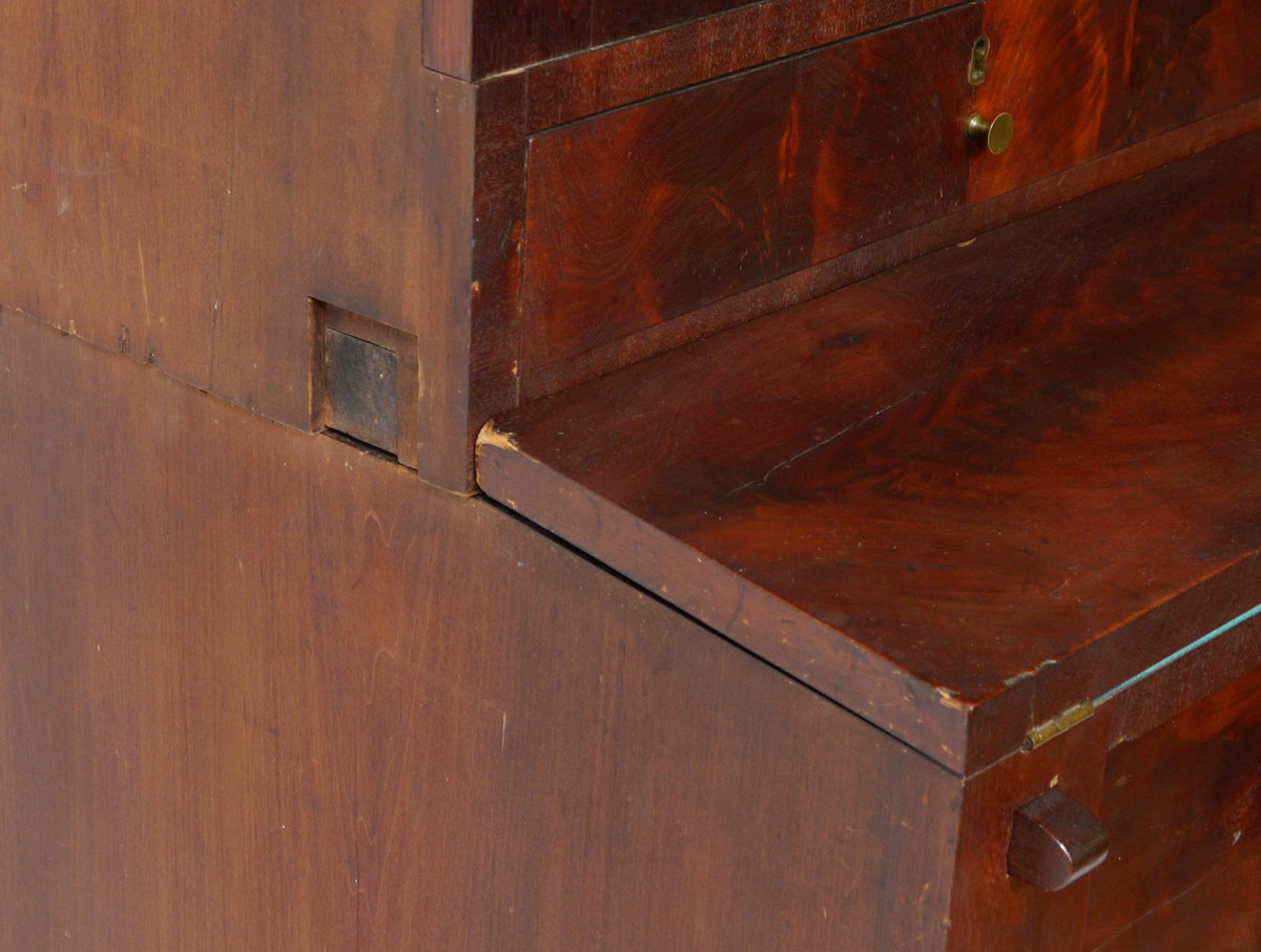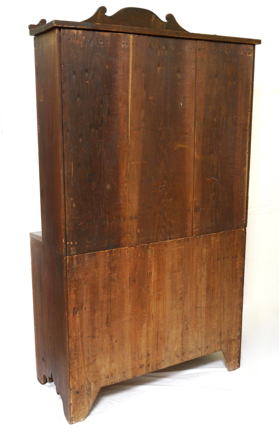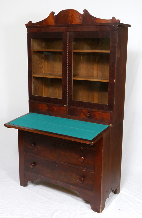 EMPIRE PERIOD STEPBACK SECRETARY BOOKCASE CHINA CABINET: Shaped pediment over 2 glass doors with 2 shelves over 2 half drawers. Base with secretary top with replacement green felt surface, 3 graduating drawers, wood pulls. Overall 75'' h. x 40 1/4'' x 19''.