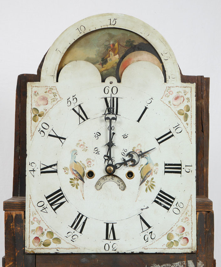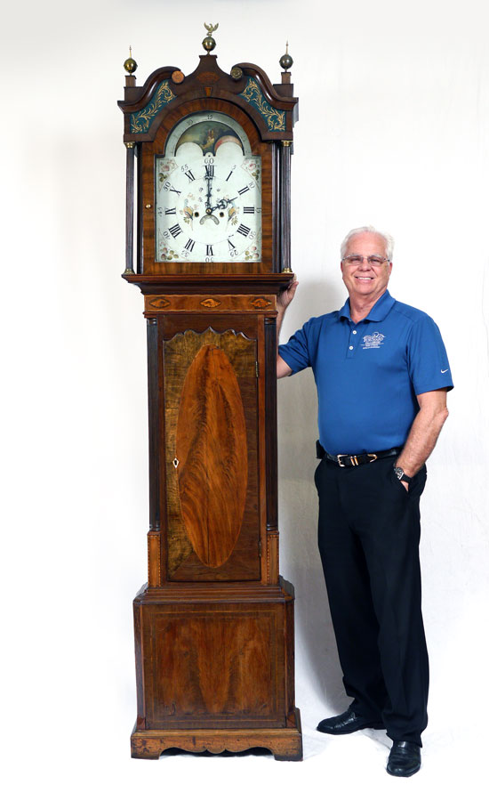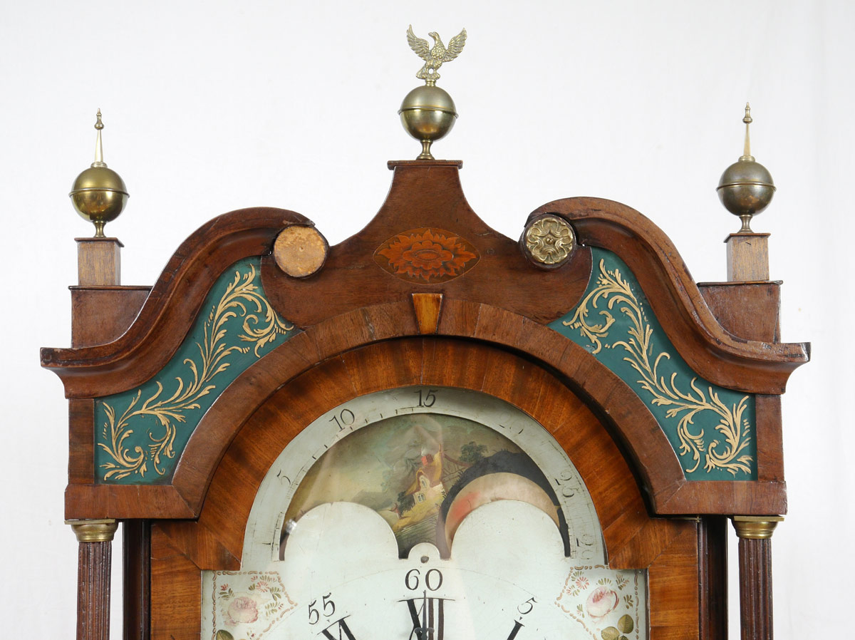 GEORGIAN GEORGE MONKS PRESCOT LONG CASE CLOCK: Late 18th Century, bonnet with broken arch pediment, 3 finials, gilt decorated glass inserts, inlaid rosette and single brass rosette. Fluted full column supports. Case with 3 marquetry inlaid shell and parquetry designs. Shaped front door, fluted quarter columns, shaped skirt. Hand painted metal dial marked Geo. Monks, Prescot, Roman and Arabic numerals, moonphase dial, subsidiary second and date aperture. Key and crank in office. Overall 95 3/4'' h. x 33'' x 22 1/4''.