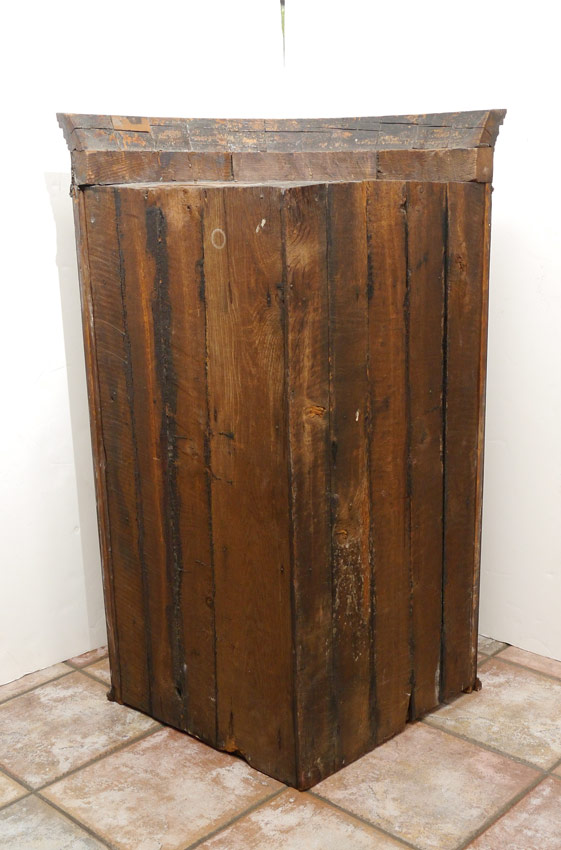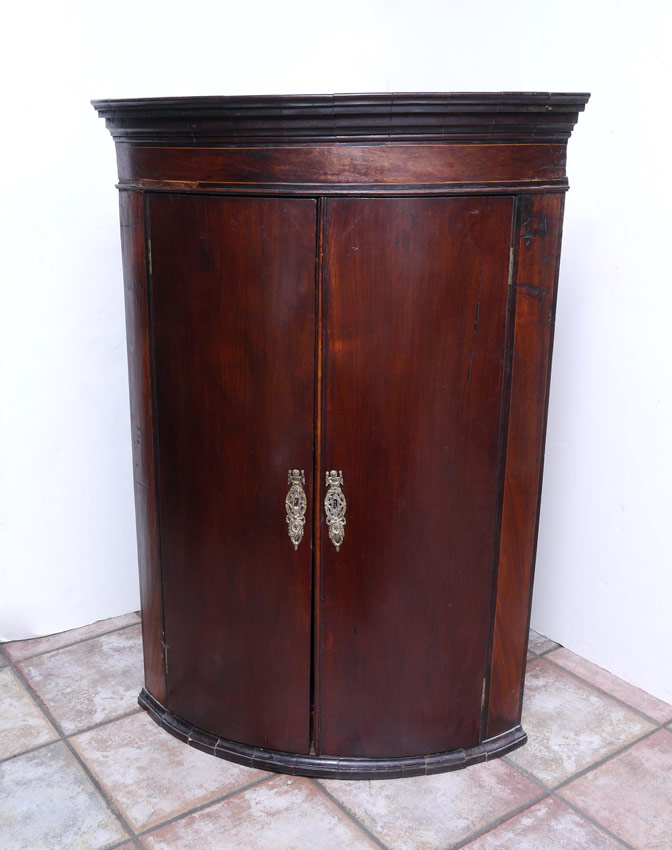 GEORGIAN MAHOGANY WALL MOUNT CORNER CUPBOARD: Barrel front with string inlay. 2 doors open to 3 shelves and 3 drawers. Overall 40'' x 30 1/4'' x 15''.