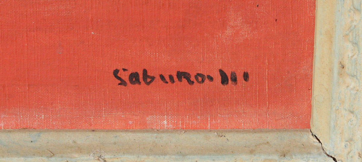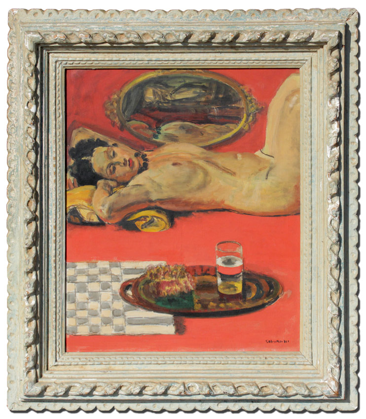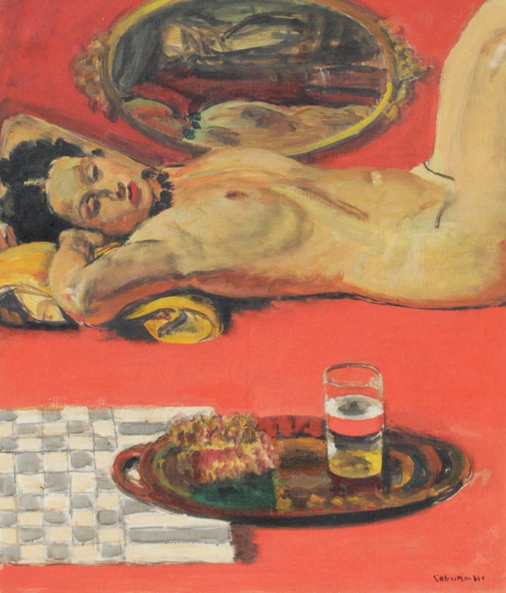 MIYAMOTO, Saburo, (Japanese, 1905-1974): Female Nude Reclining with Serving Tray and Beverage, Oil/Canvas, 28 1/2'' x 23 3/4'', signed lower right, encased in period hand carved and painted frame with wear and damage in the upper corner, 40'' x 35''.
