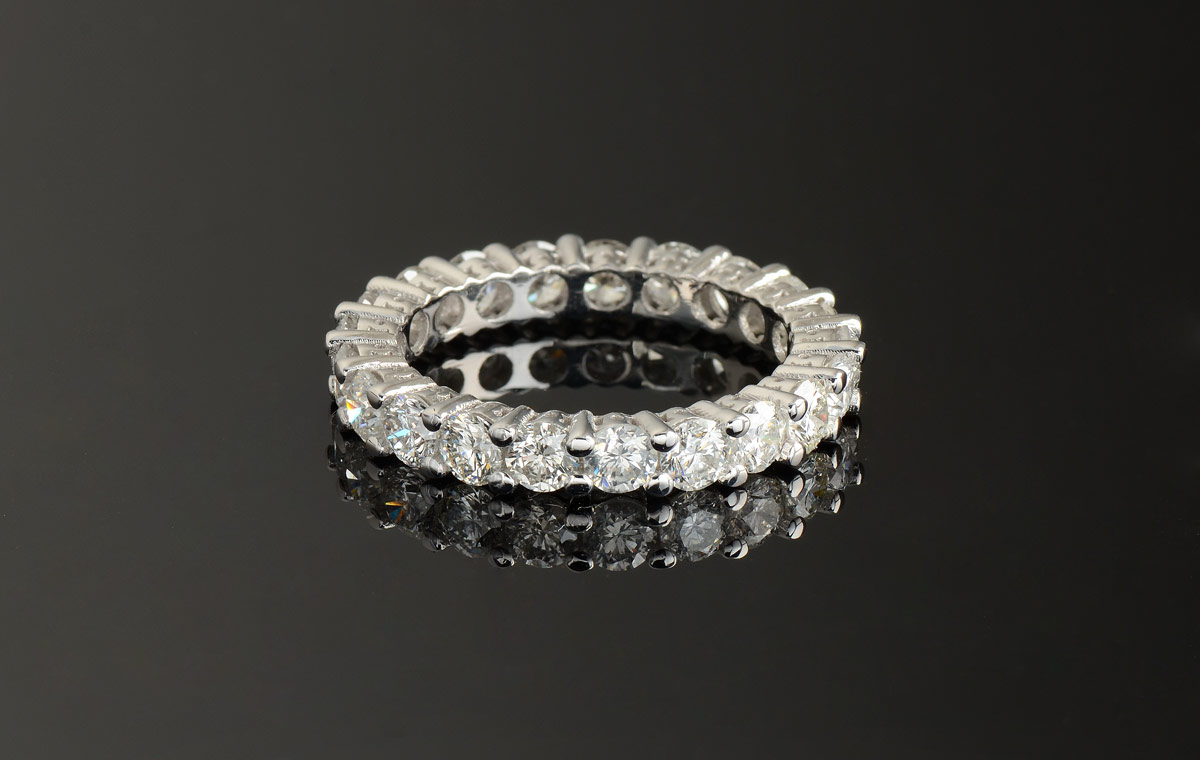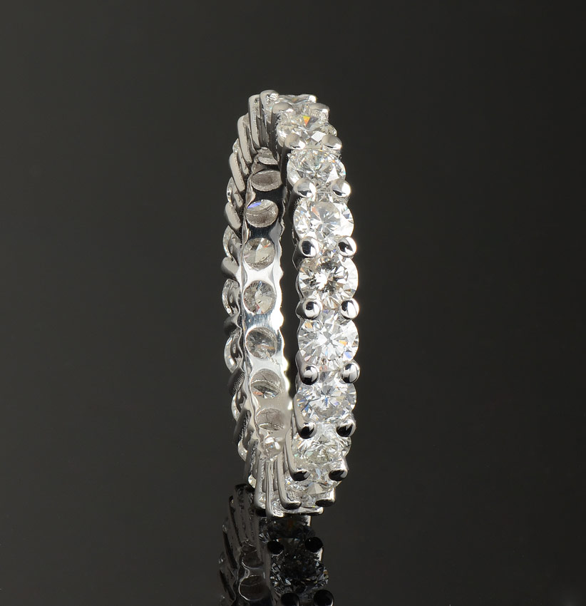 18K DIAMOND ETERNITY WEDDING BAND: 18K white gold ring 22 round brilliant diamonds totaling approx. 2.25 Ct., rated SI in clarity and G-H-I color. Size 6. Weight 3 grams. Sold with current Florida Diamond Appraisers GIA graduates appraisal for $4,500.