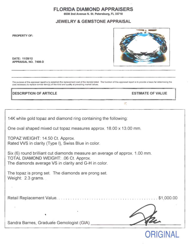 14.50 CT SWISS BLUE TOPAZ & DIAMOND RING: Contemporary floral filigree 14k white gold ring with a solitaire oval mixed cut blue topaz, approx. 14.50 Ct., rated VVS in clarity. The 6 diamonds total approx. .06 Ct. Size 6.5. Weight 2.3 grams.
