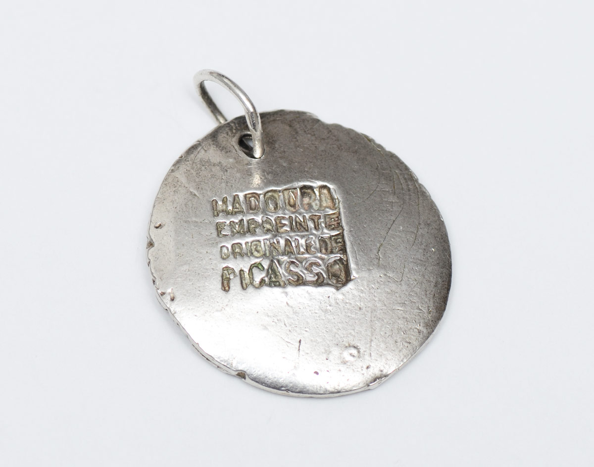 PABLO PICASSO VISAGE SILVER PENDANT: Manufactured by Madoura stamped ''Madoura Impreinte Originale Picasso''. Measures 1.5'' dia.
