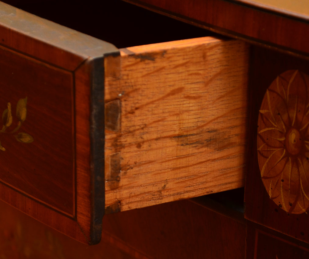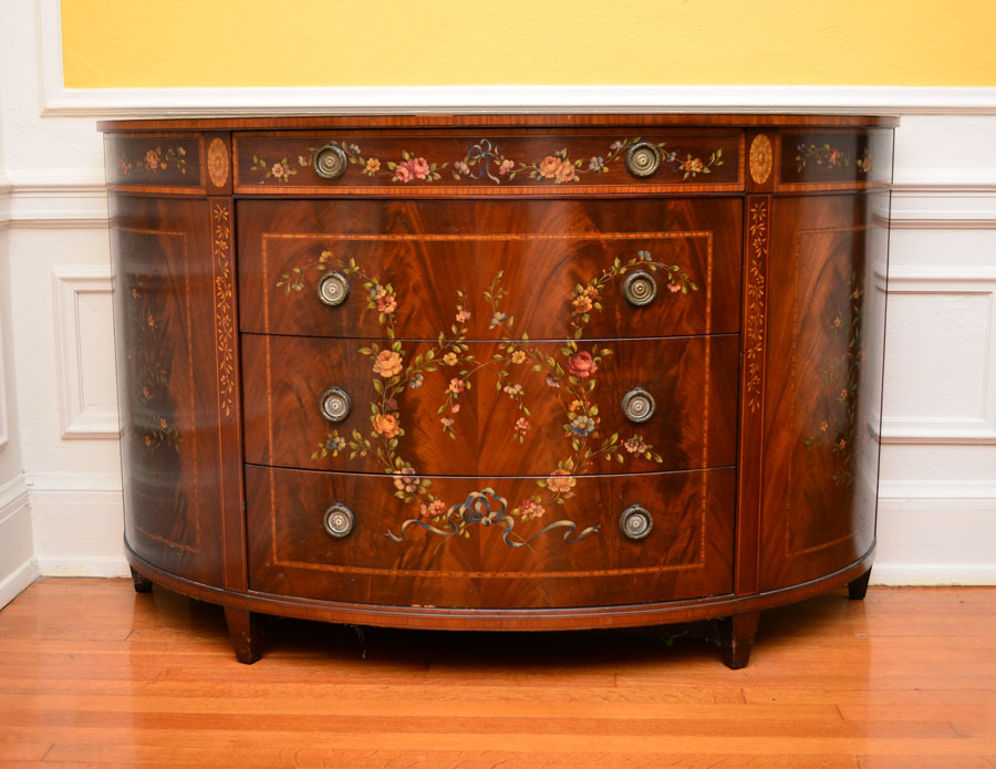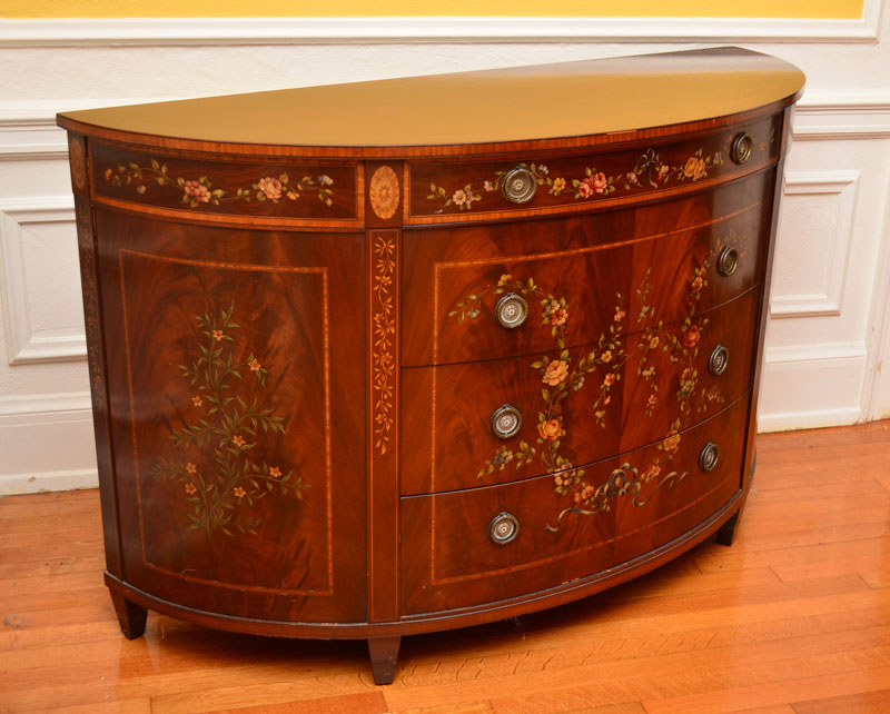 PAINT DECORATED MAHOGANY DEMI COMMODE: Four drawer bowed front chest with string inlay, banding and paint decoration over richly grained mahogany. Early to mid-20th C. Measures approx. 34'' tall x 55'' x 20''.