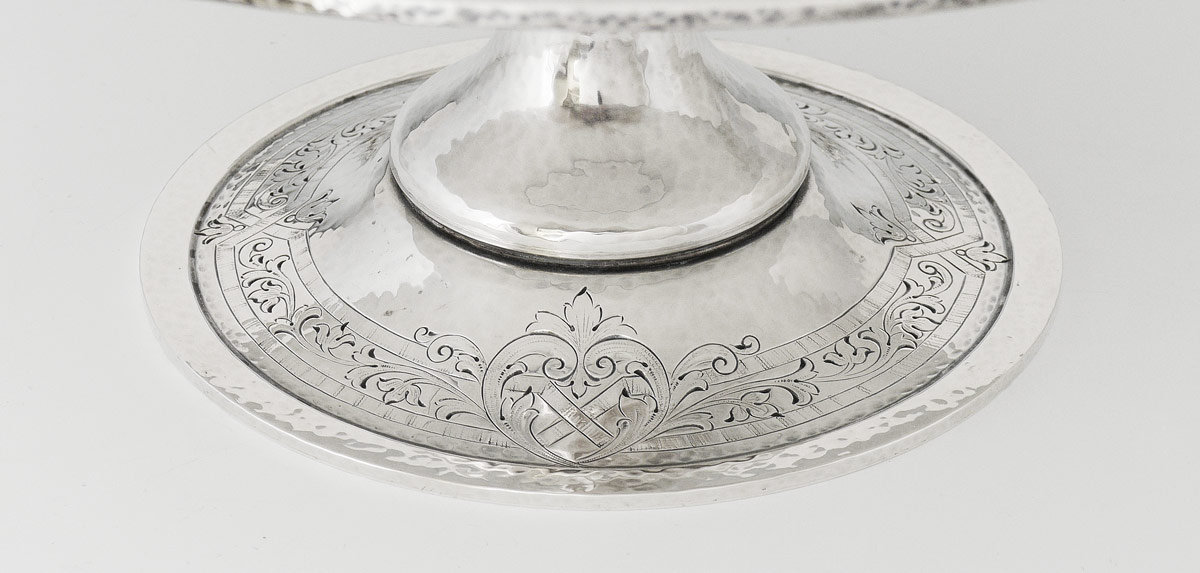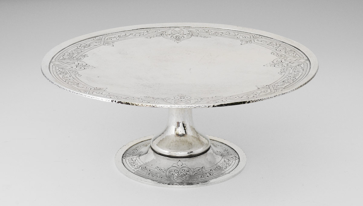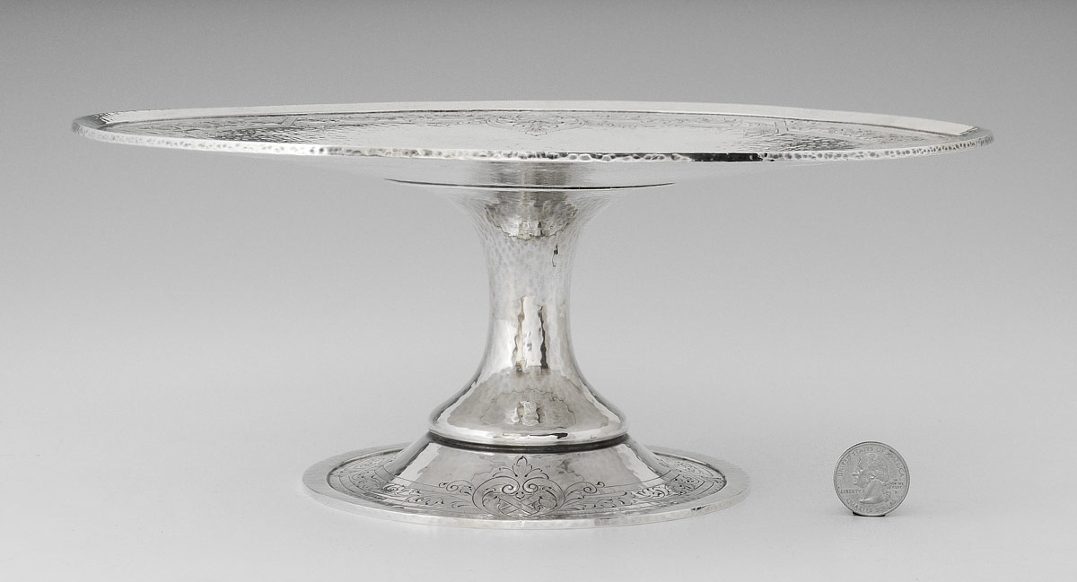 1914 GORHAM STERLING PEDESTAL CAKE PLATE: Hand hammered and engraved designs, marked with Gorham hallmarks, 1355A, and 1914 date mark. 4 3/4'' h. x 12'' dia.. Approx. 32.1 troy oz.