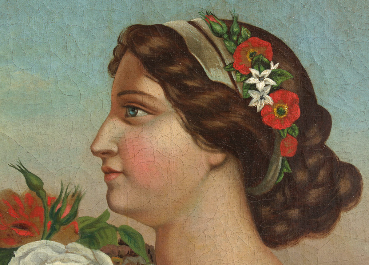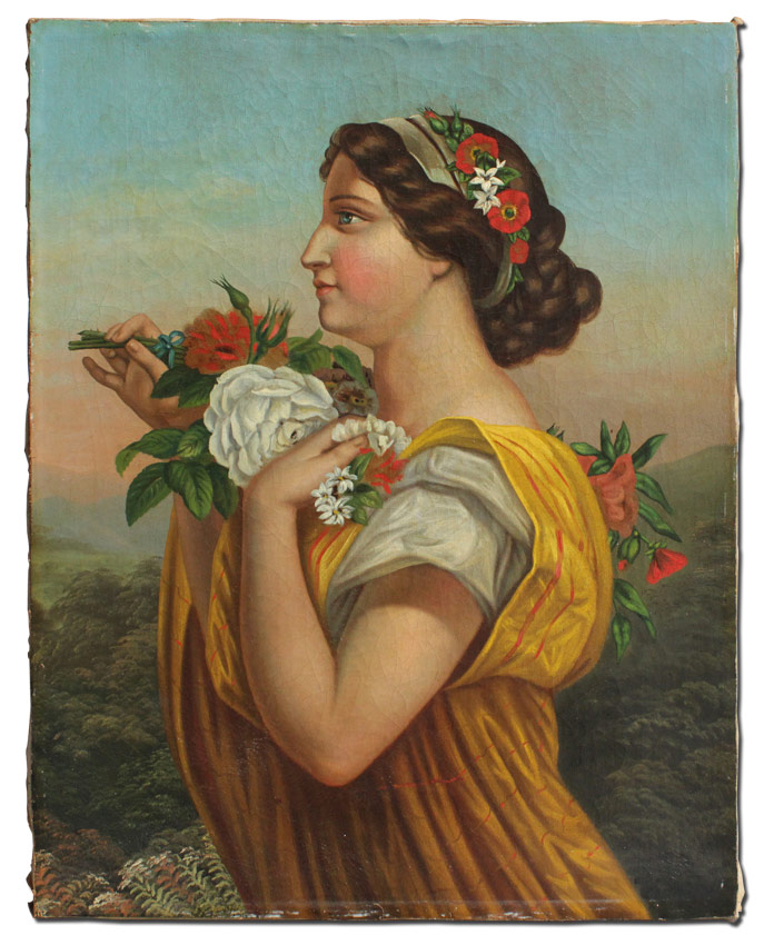 FRENCH SCHOOL 19TH CENTURY PORTRAIT OF A MAIDEN: Depicts a Young Beauty in a Lush Mountainous Landscape Holding a Bouquet of Flowers, Oil/Canvas, 28'' x 22 1/4'', framed 37'' x 31''.