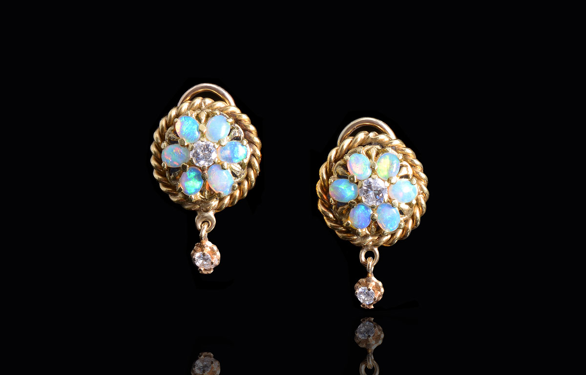 14K OPAL & DIAMOND EARRINGS: 14K yellow gold earrings with 12 cabochon cut opals totaling approx. 2.00 Ct. and 4 round brilliant cut diamonds totaling approx. .50 Ct., rated SI in clarity and H in color. Hinged clips. Weight: 8.7 grams.