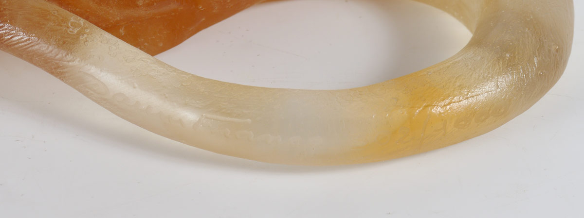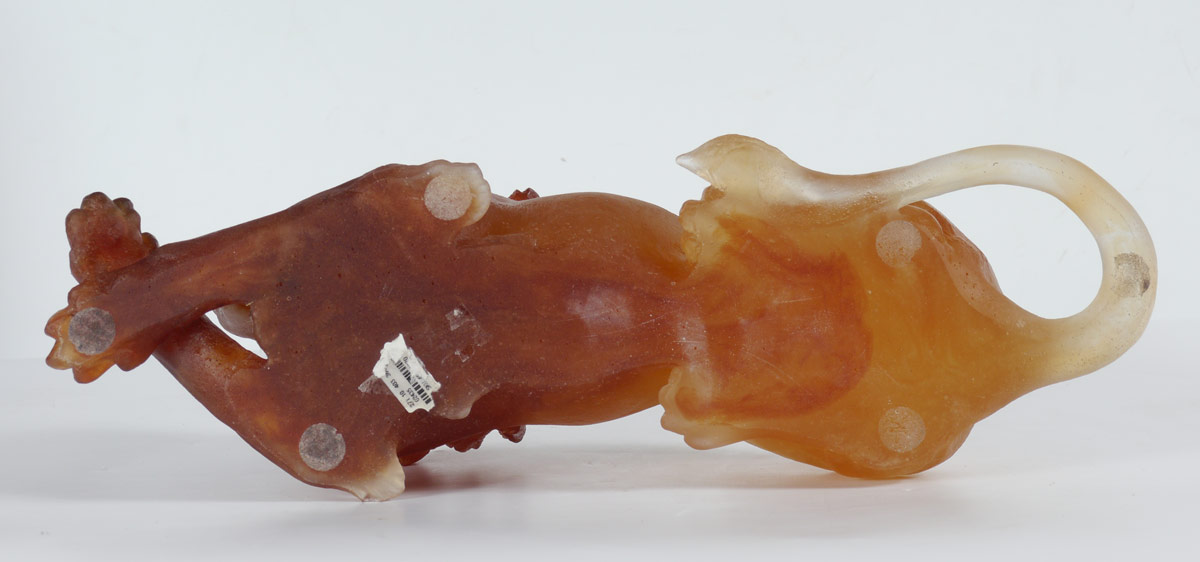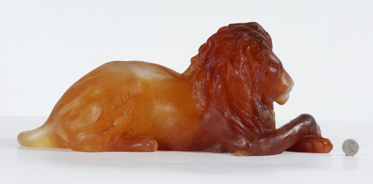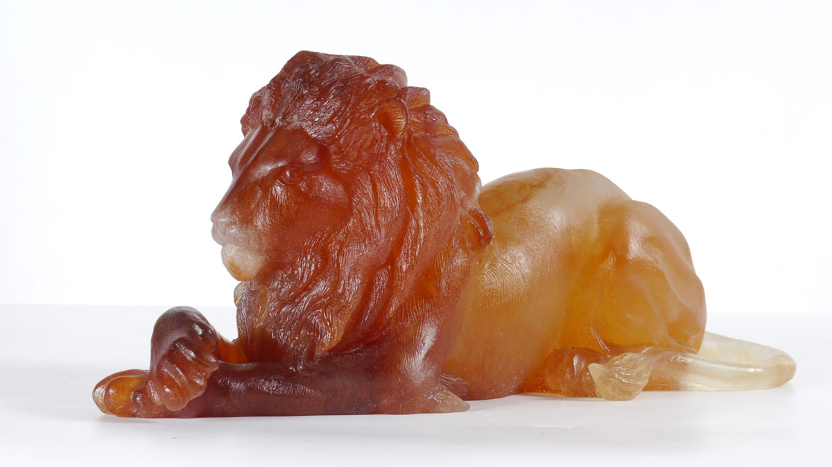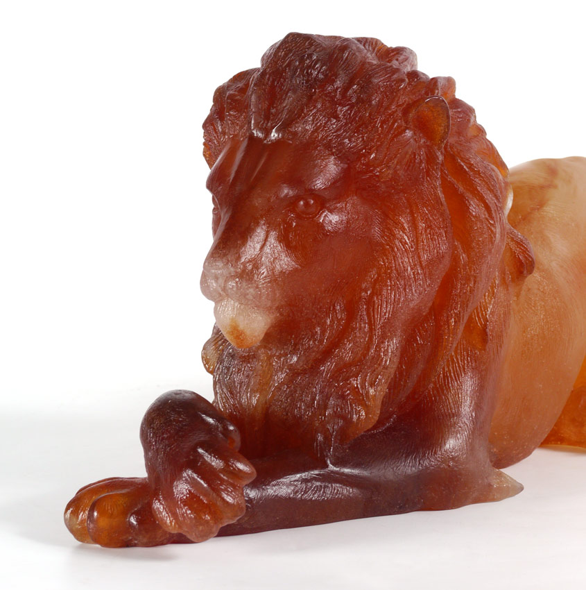 DAUM PATE DE VERRE AMBER RECUMBENT LION: Limited Edition 302/1000, amber tones, signed on tail Daum, France, 7 1/2''h. x 18'' x 5 approx.