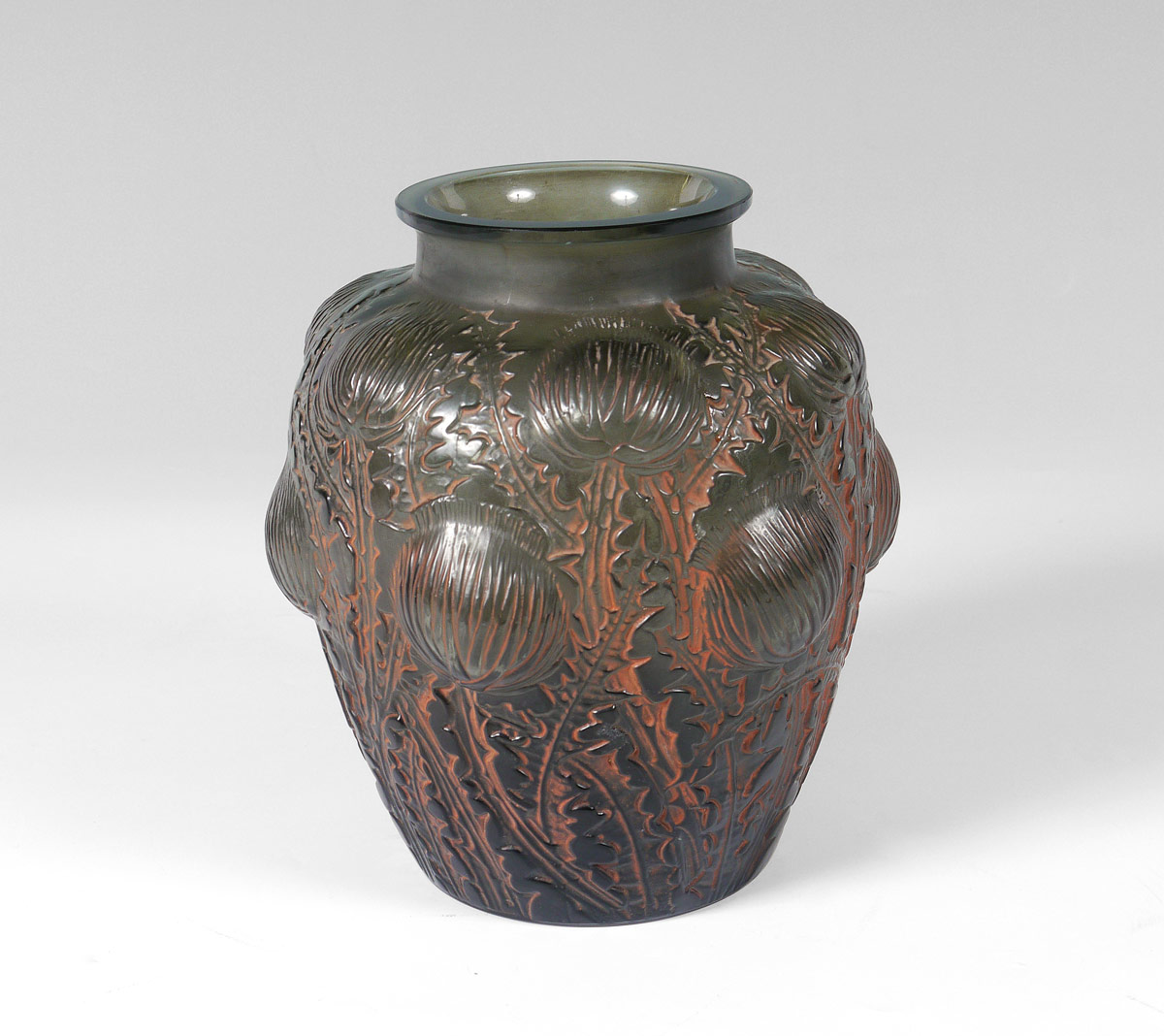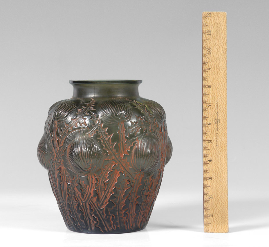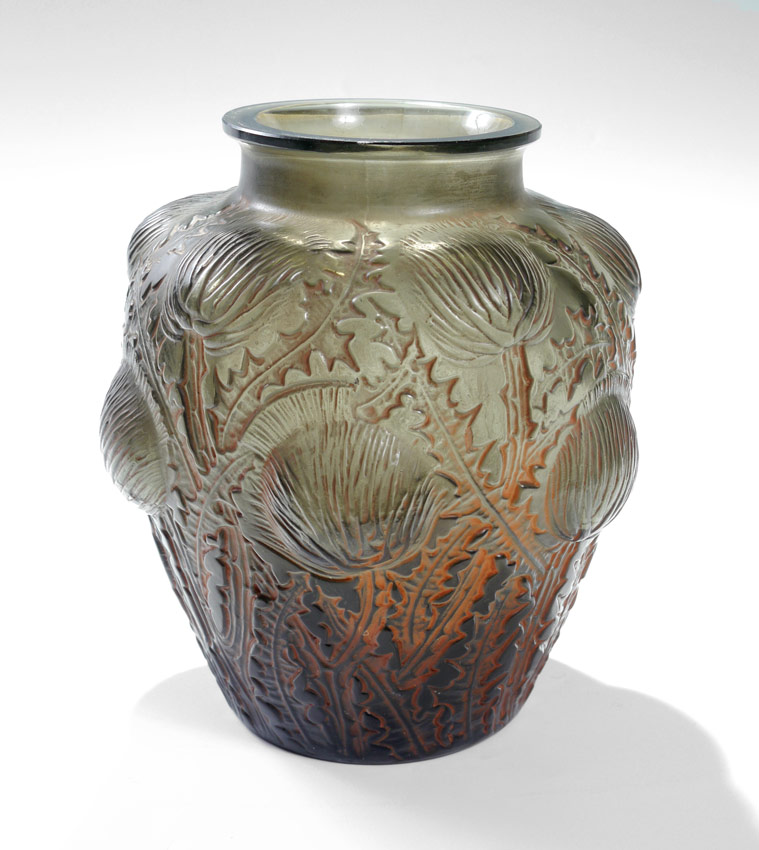 R. LALIQUE DOMREMY VASE: Topaz glass in a thistle design with orange patinated finish. Impressed R. Lalique, inscribed Lalique France. Ca. 1926. Height 8 1/4''.