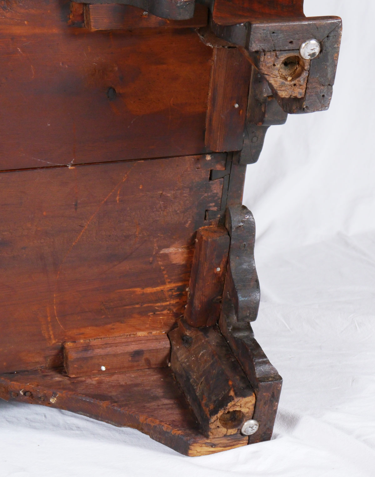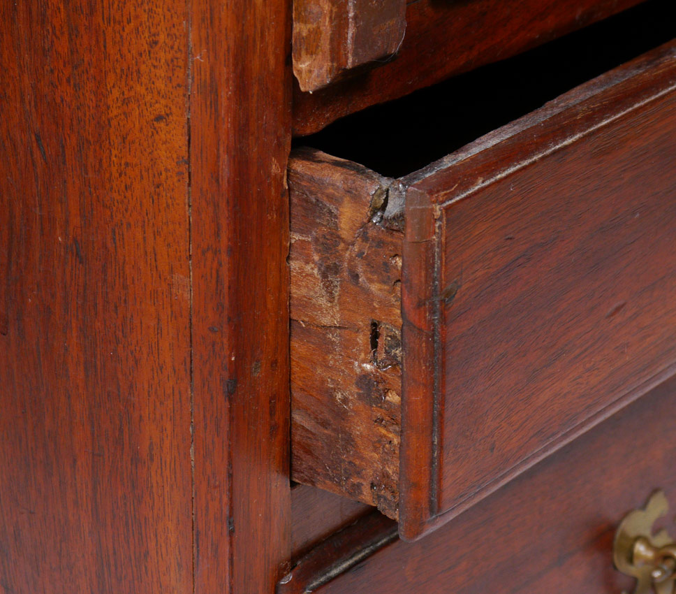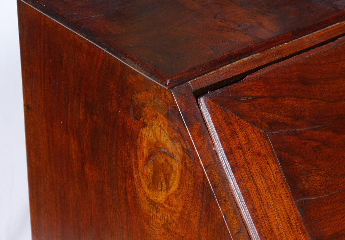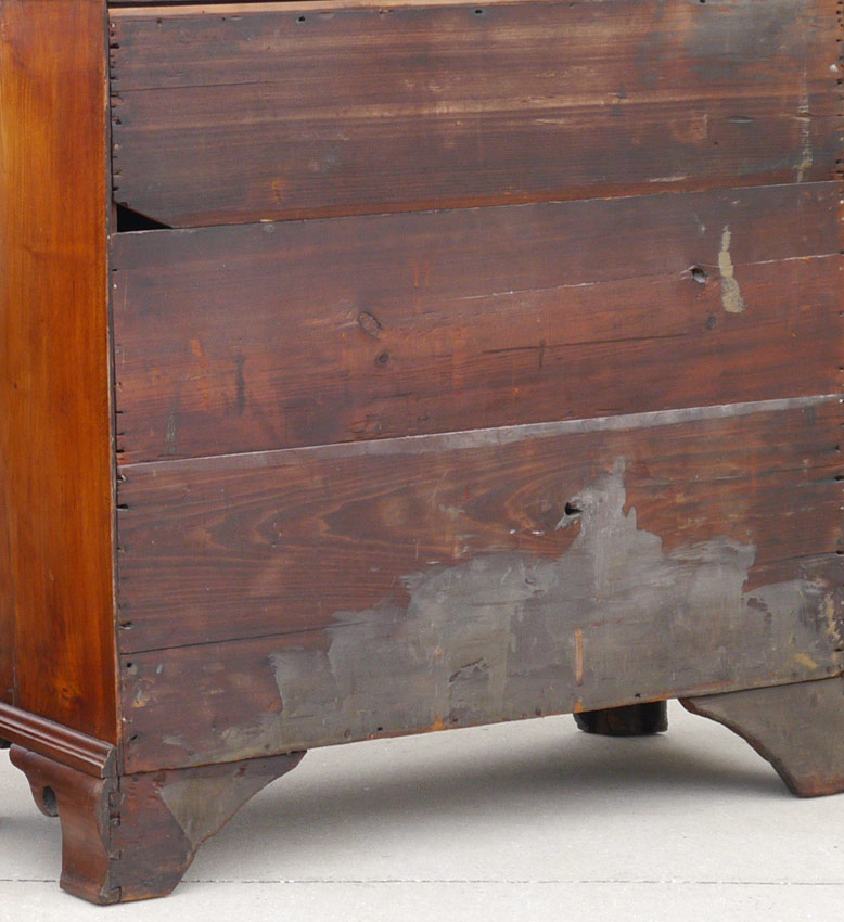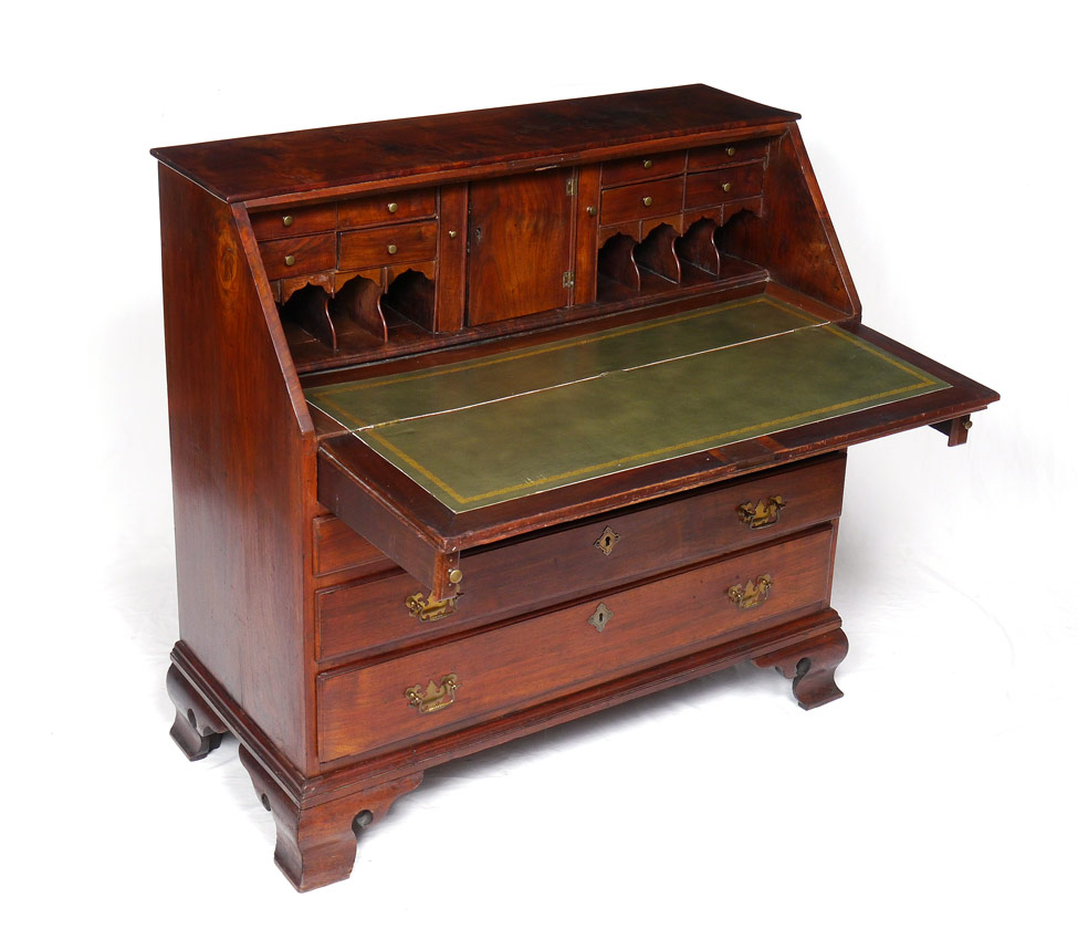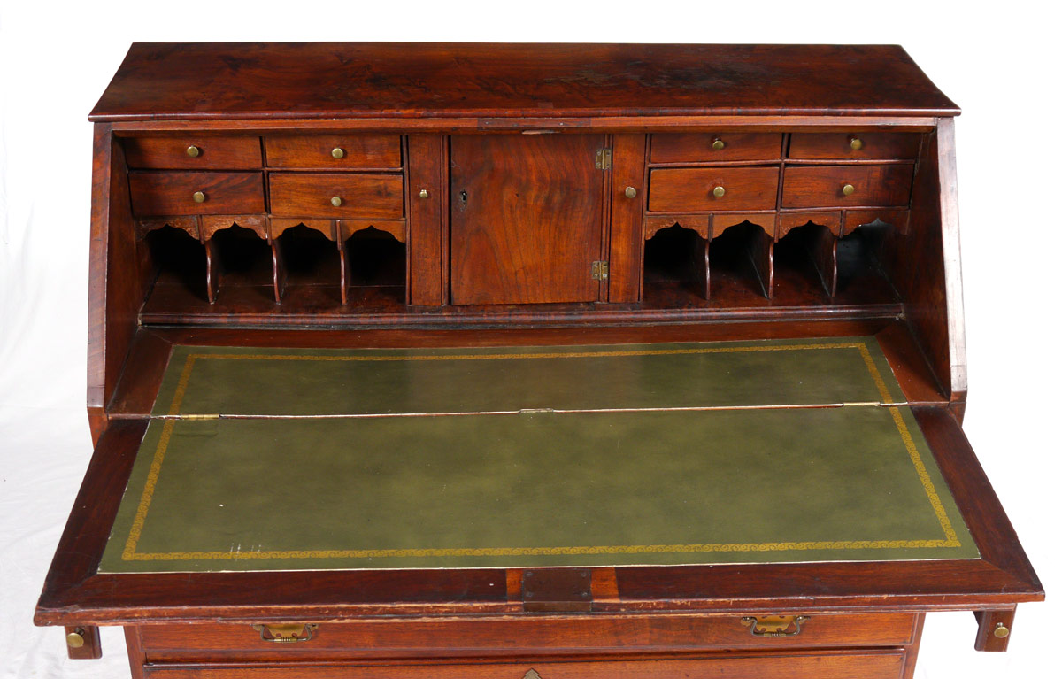 PERIOD CHERRY FALL FRONT SECRETARY DESK: Late 18th to early 19th century fall front with embossed green leather writing surface, internal drawers, door and pigeon holes. 4 graduated full length drawers. Ogee bracket feet. 41 3/4'' h. x 44 1/2'' x 20 1/2''.