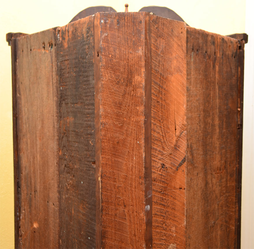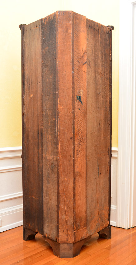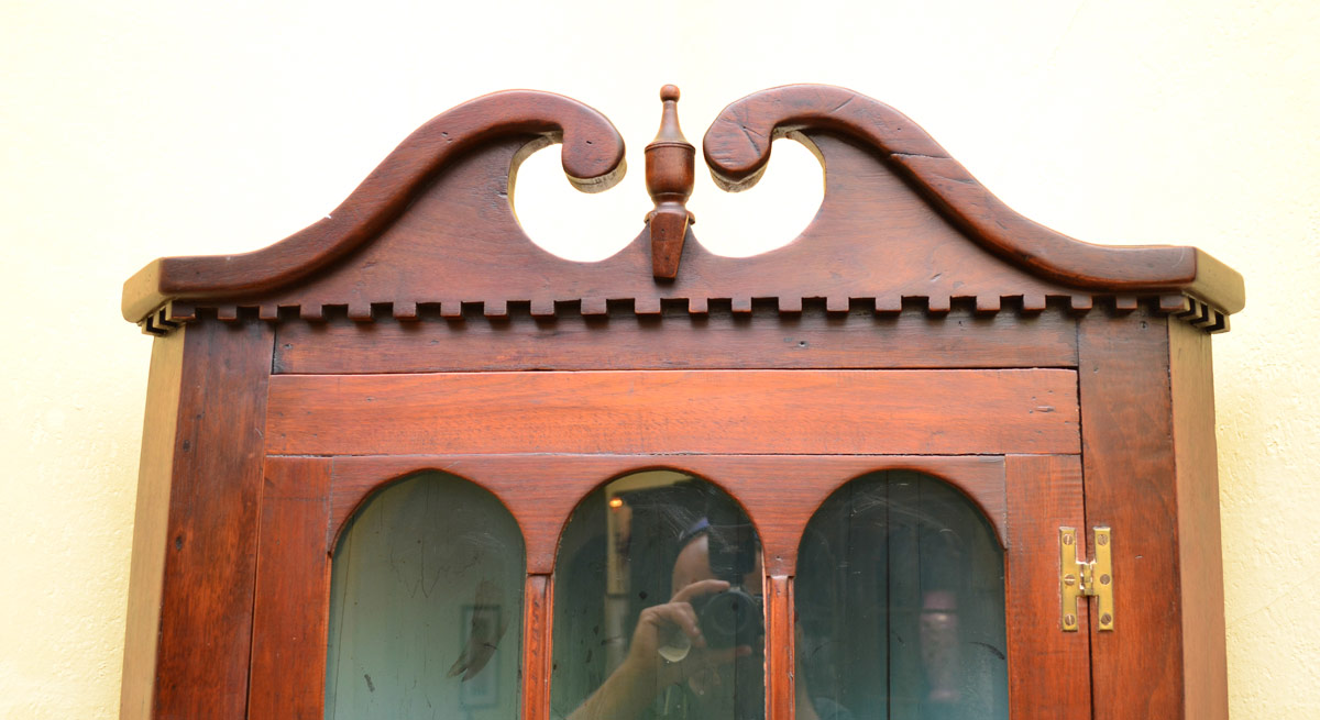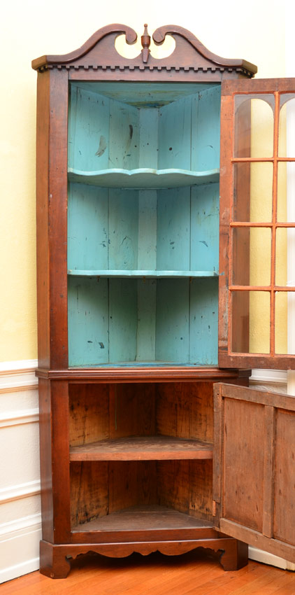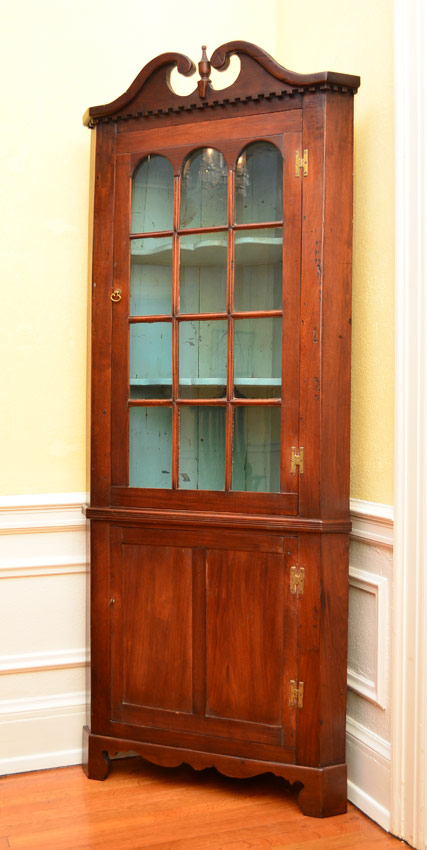 EARLY 19TH CENTURY CHERRY CORNER CUPBOARD: Broken arch pediment with urn finial, dentil molding. Top with 12 panel glass front door, blue paint decorated interior with 2 shaped shelves. Base with single interior shelf, shaped skirt and feet. 76 1/2'' h. x 30'' x 16 1/4''.