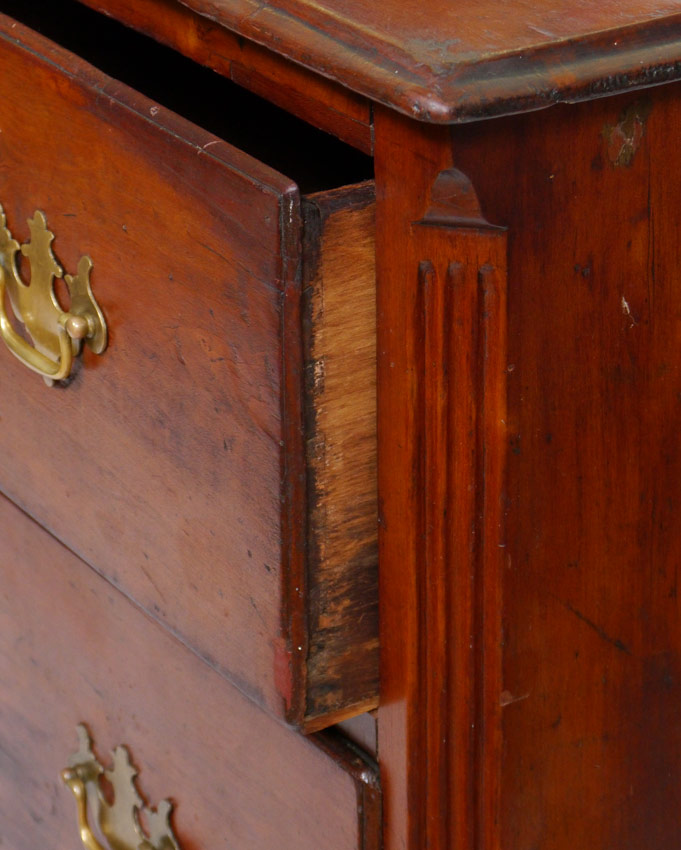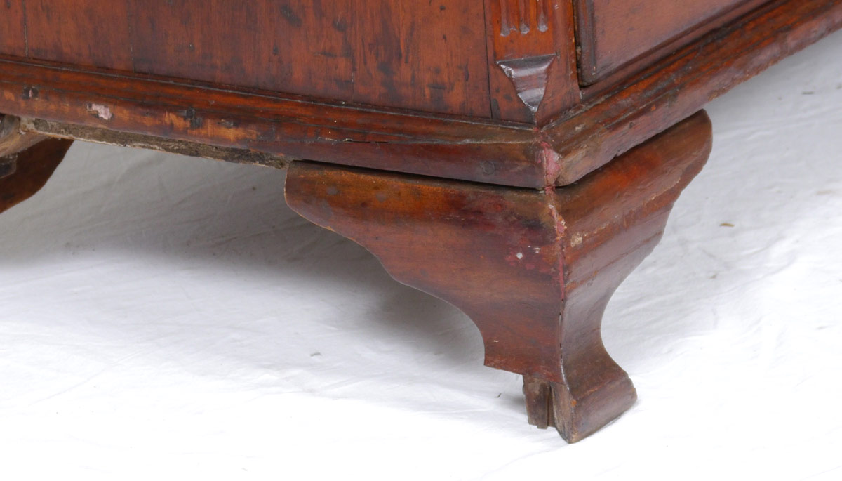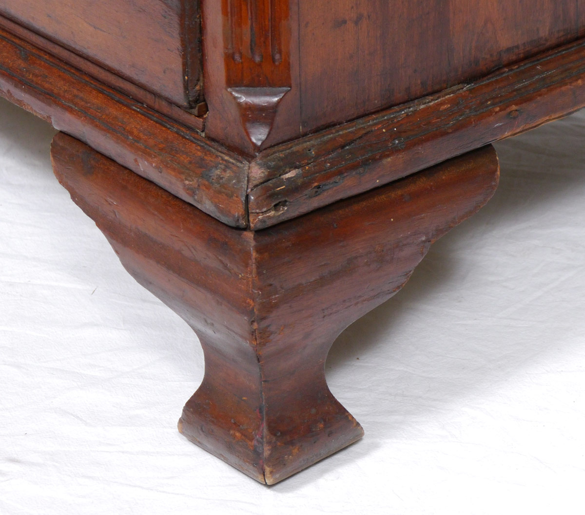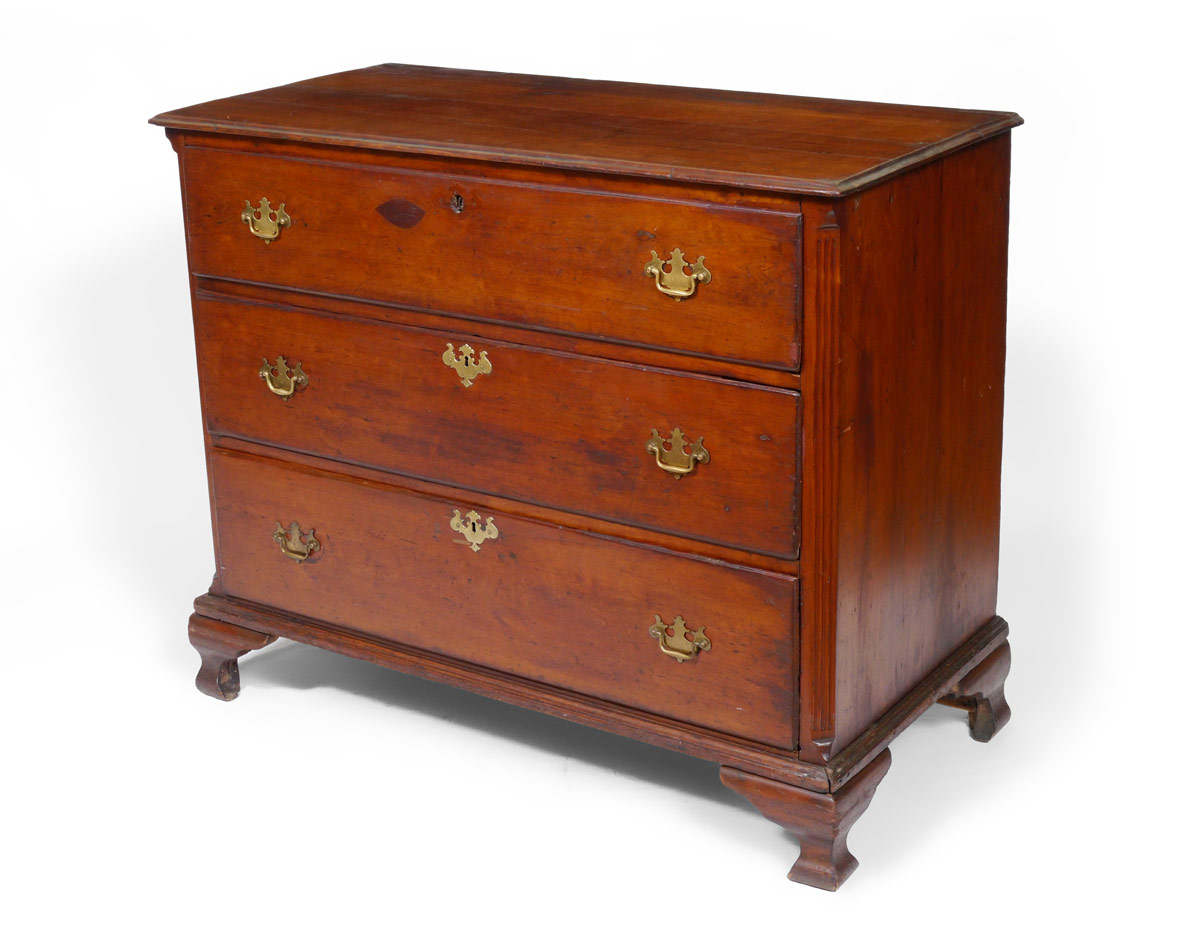 PERIOD CHERRY CHEST OF DRAWERS: Late 18th to early 19th century cherry chest of drawers. 3 graduated drawers, bracket feet on reworked or replacement base. 38 1/2'' h. x 41'' x 23''.
