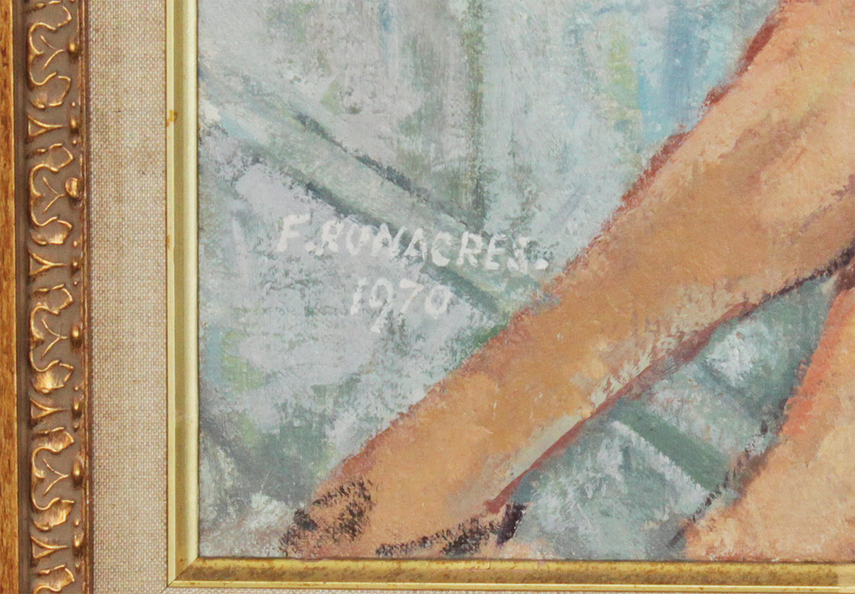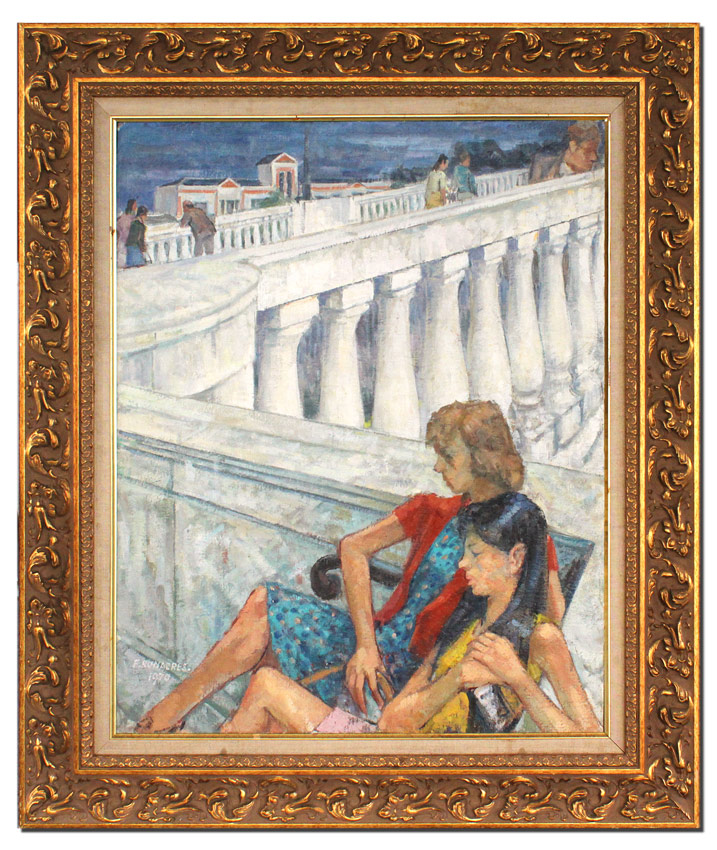 RUNACRES, Frank, (British, 1904-1974): Ladies on Bridge, Oil/Canvas Board, 30'' x 24'', signed lower left, dated 1970, encased in gilded frame 29'' x 33''.