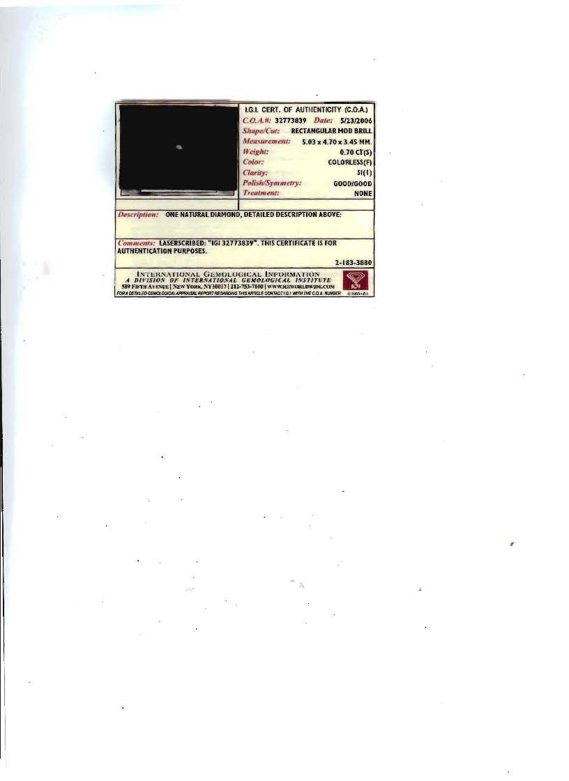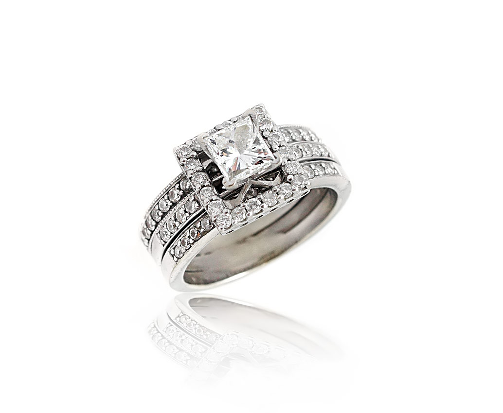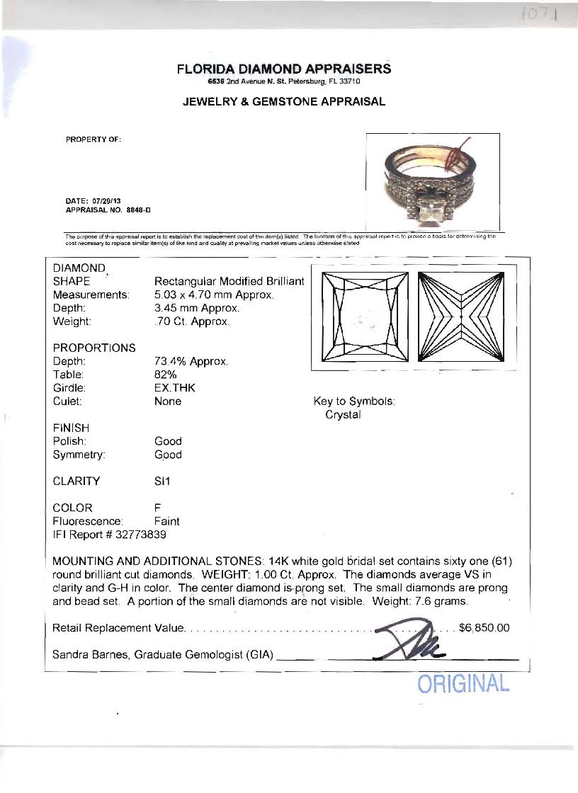 1.70 CTW PRINCESS CUT DIAMOND ENGAGEMENT / BRIDAL RING: 14K white gold ring centering an approx. .70 Ct. rectangular modified princess cut diamond rated SI1 clarity and F color. The diamond is laser scribed with the IGI report number 32773839. The mounting has an additional 61 round brilliant diamonds totaling approx. 1 Ct., averaging VS clarity and G-H color. Size 6. Sold with an IGI report and current Florida Diamond Appraisers GIA graduates appraisal for $6850.