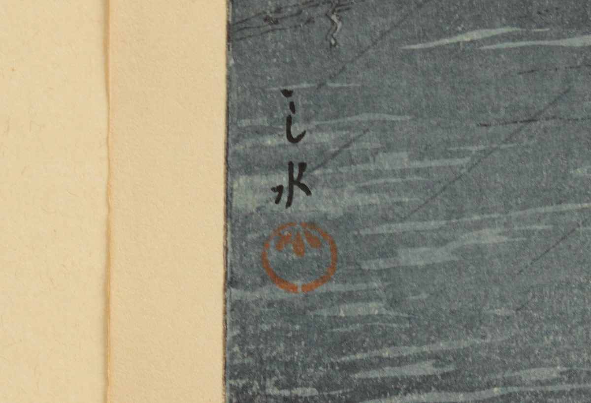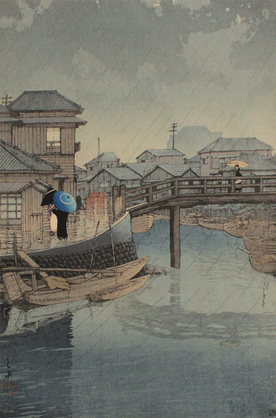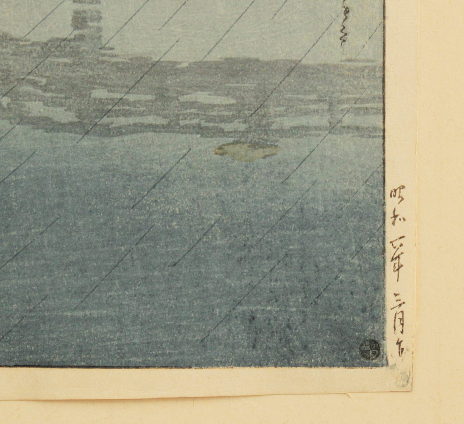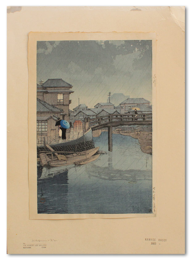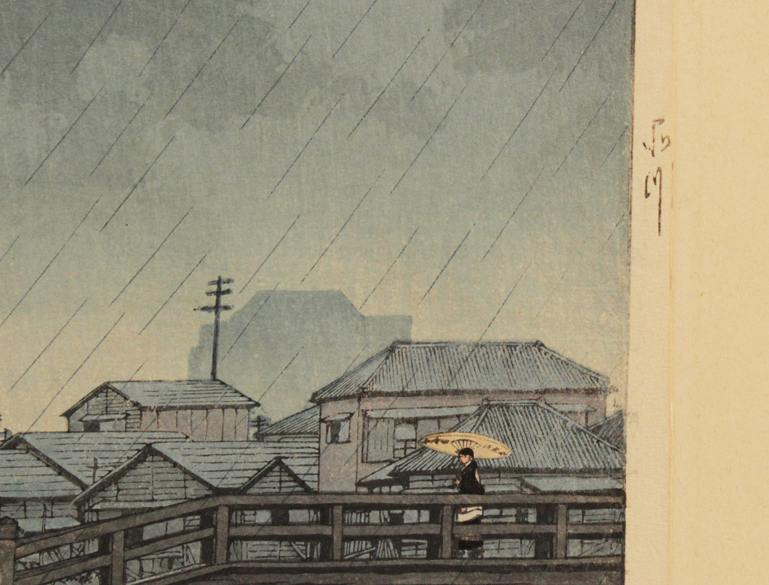KAWASE, Hasui, (Japanese, 1883-1957): ''Rainy Season at Ryoshi-machi, Shinagawa, 1931'', Color Japanese Woodblock Print, 15 1/4'' x 10 1/4'', markings in lower right, lower left, and upper right corner, framed 22'' x 16''.