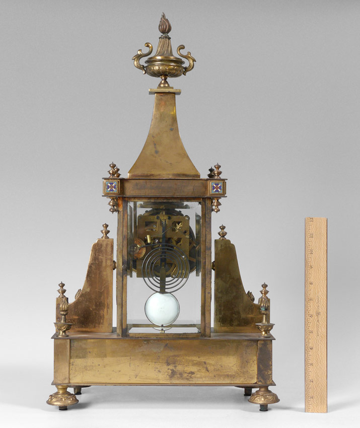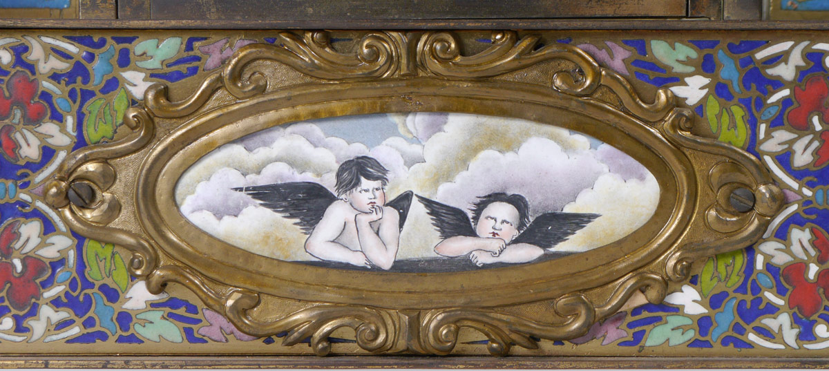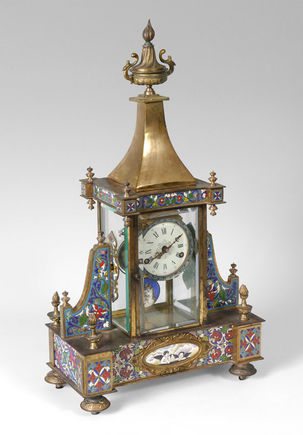 CHAMPLEVE FRENCH STYLE MANTLE CLOCK: Heavy brass case with flaming urn finial, beveled glass sides, champleve decorated buttresses, decorated base on 4 embossed feet. Lower enameled plaque depicting Raphael's cherubs. Modern Chinese time and strike movement with enameled pendulum. Overall 25 1/4'' h. x 14 1/2'' x 7''.