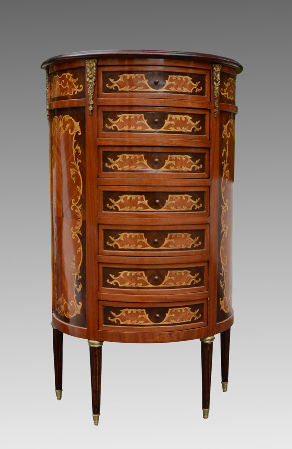 FRENCH STYLE DEMI FRONT LINGERIE CHEST: Seven drawers with inlaid decoration and ormolu mounts. Measures 48'' h. x 28 1/4'' w. x 14 1/4'' d.
