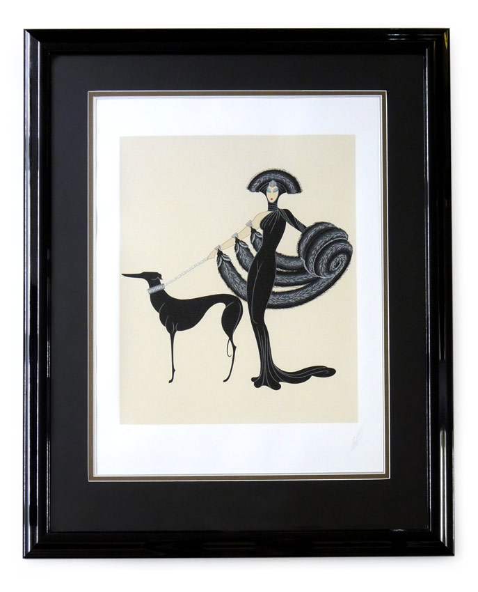 ERTE ''SYMPHONY IN BLACK'' SERIGRAPH: Signed lower right and numbered 90/300 lower left, image size 21 3/8'' x 17 1/4'', matted and framed 39 1/2'' x 31 3/4'', watermark lower right, S blindstamp lower left, not laid, 30'' x 22 1/2'' with margins.