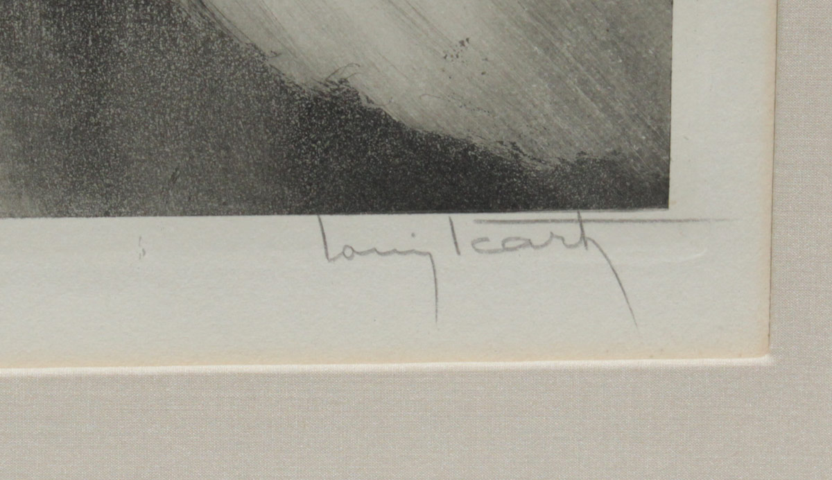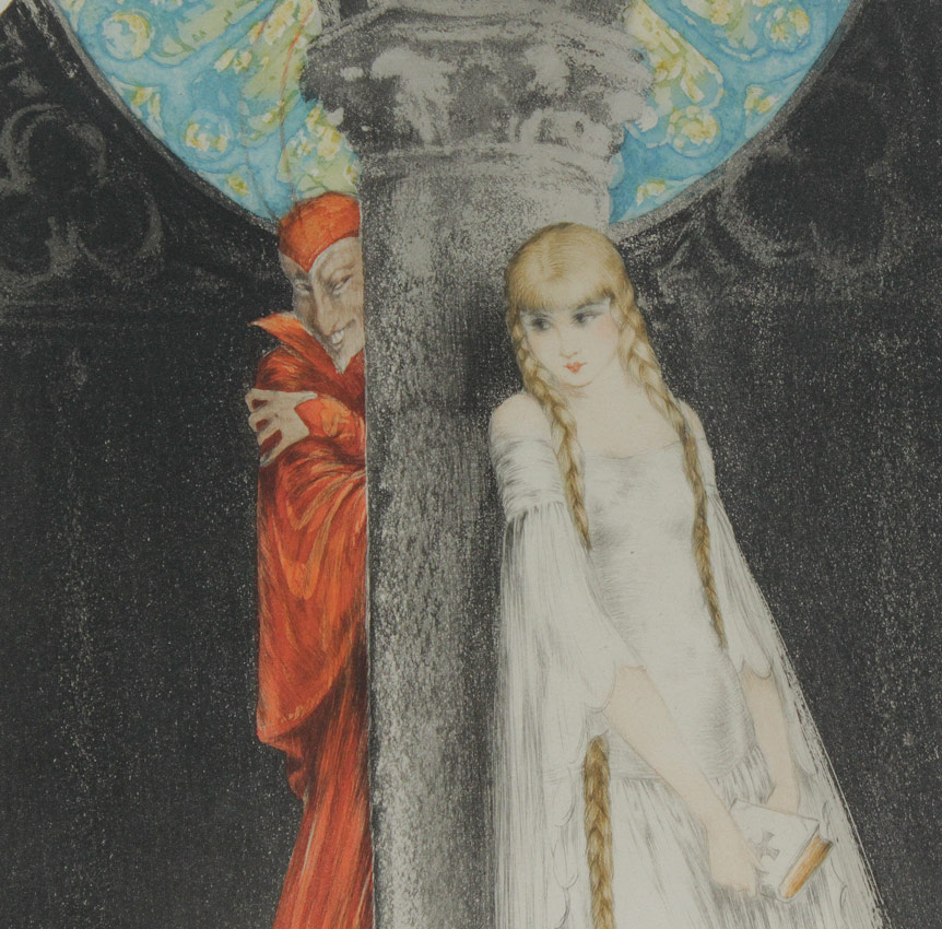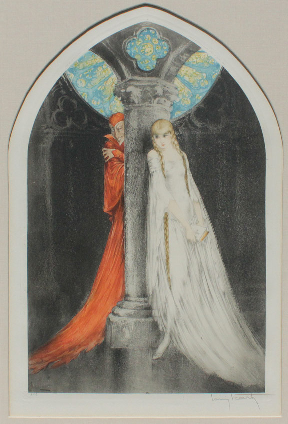 LOUIS ICART ETCHING ''FAUST'' PUBLISHED IN 1928 BY GRAVUEURS MODERNES: Sight size 23'' x 15'', pencil signed lower right, wind mill stamp lower left, marked in pencil E. 159, copyrighted information in upper right margin, encased in contemporary chrome frame 30 1/4'' x 21''.