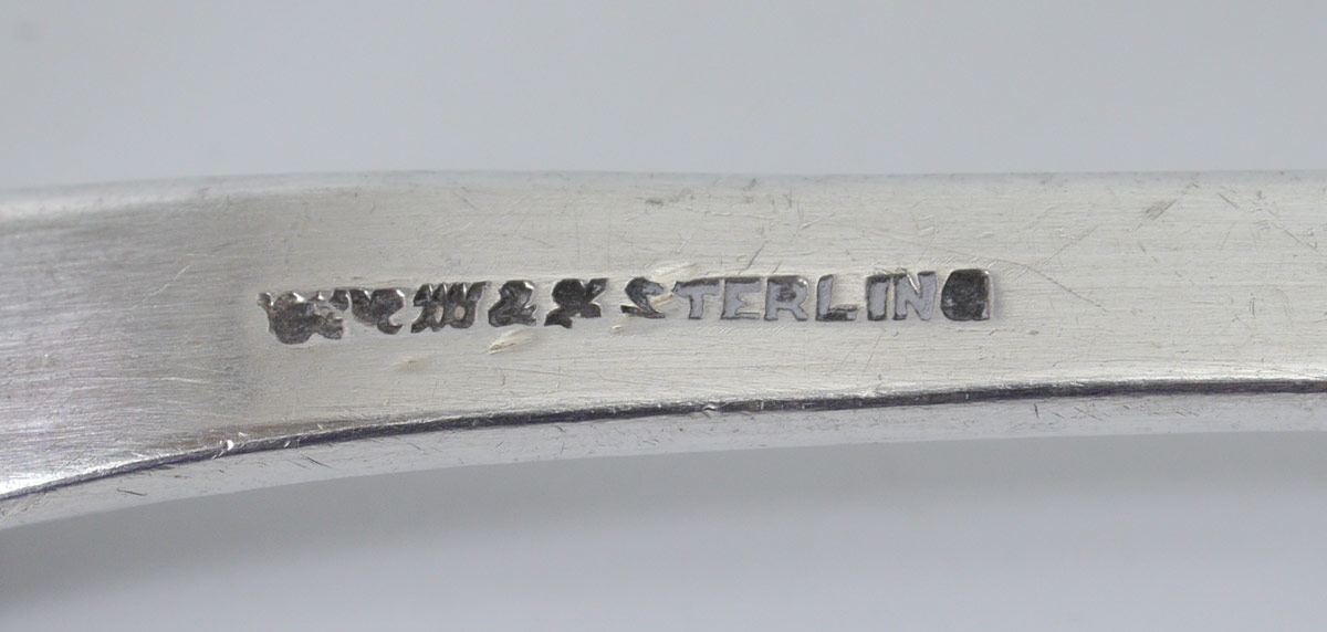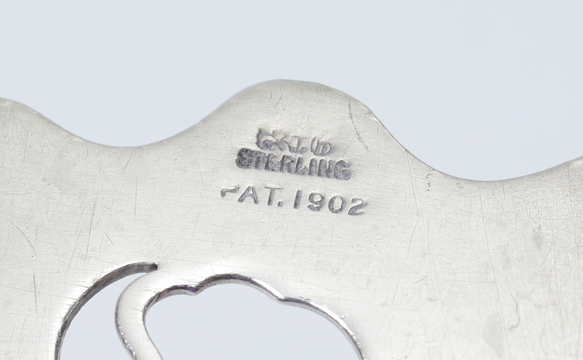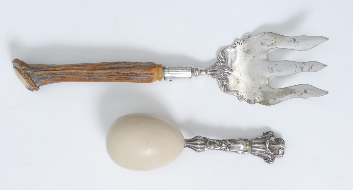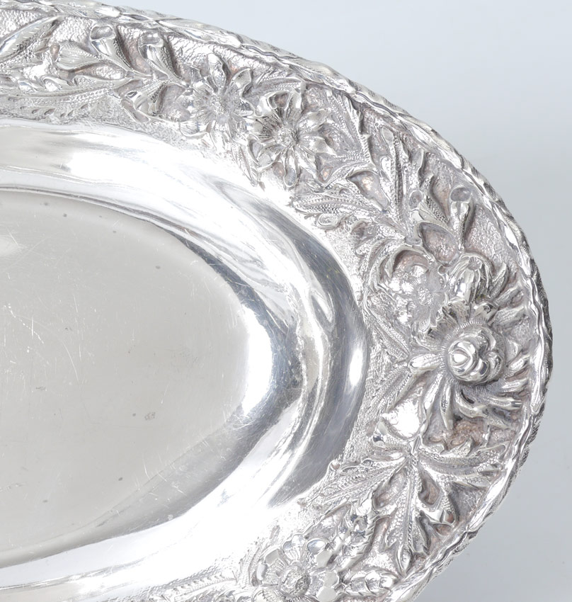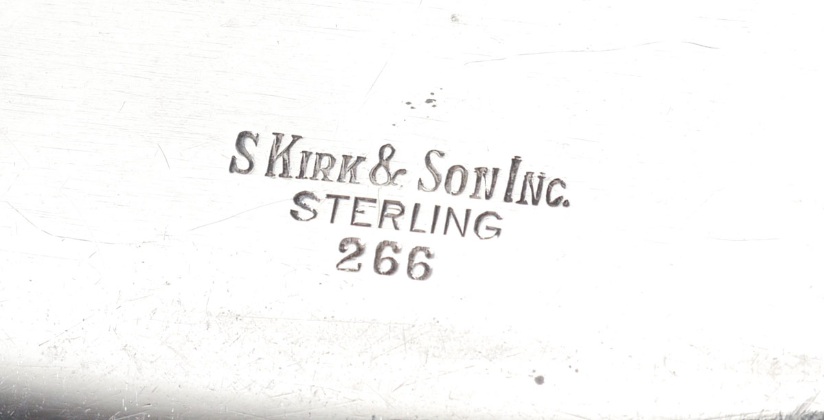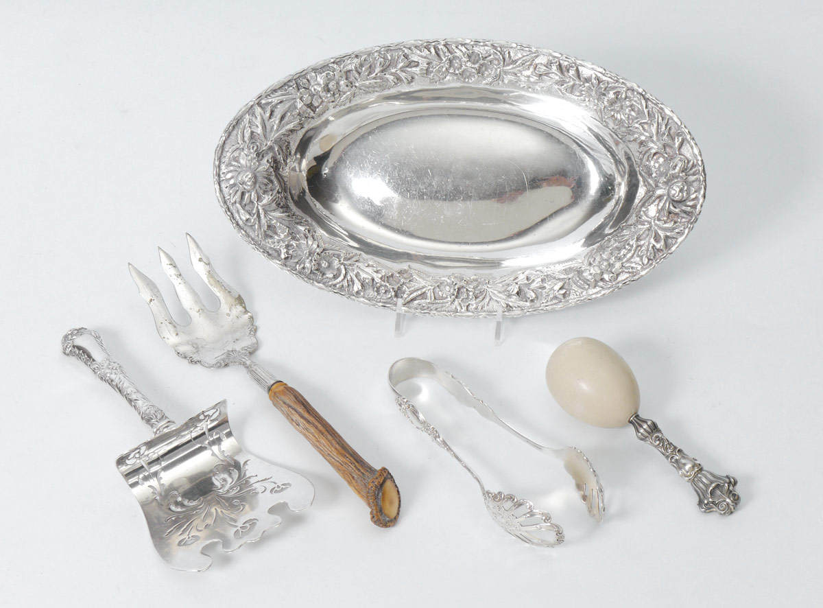 STERLING REPOUSSE TRAY & SERVING PIECES: 5 pieces total to include 1) S. Kirk & Son floral repousse rim tray, marked Hand Decorated, S. Kirk & Sons Inc, Sterling, 266. 12 3/4'' x 7 1/4''. 2) Wallace ice tongs with pierced bowls, 7'' l. 3) Nickel silver meat fork with faux antler handle, 10 1/2''. 4) Silverplate asparagus server, 9''. 5) Silverplate handle sock darner, 6'' l. Approx. 15.3 troy oz.