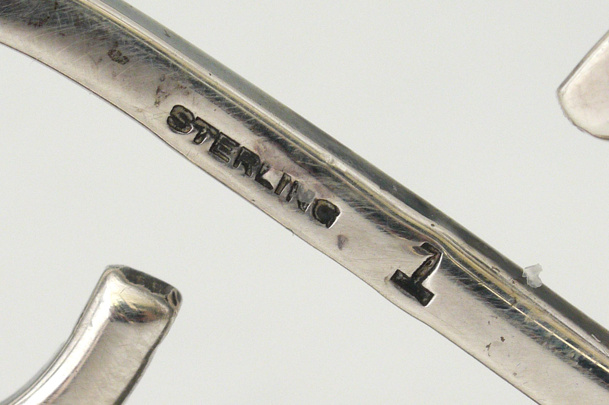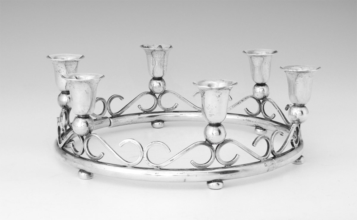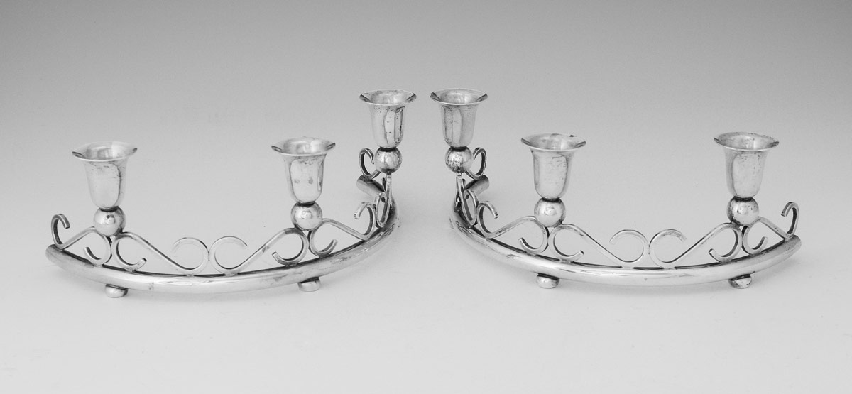 CARTIER HANDMADE STERLING 6 LIGHT CANDLESTAND: 6 light with scroll motif, 2 half circles combine to form unique full circle ring of candles. Marked Cartier Handmade, Sterling 1. Each section 3 1/2'' h. x 9 1/8'' x 4 3/4''. Approx. 16.4 troy oz.
