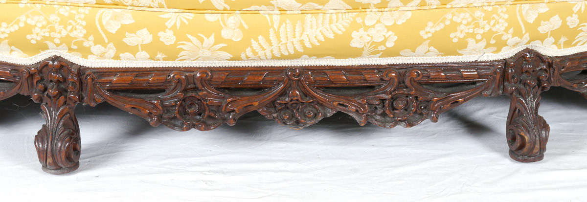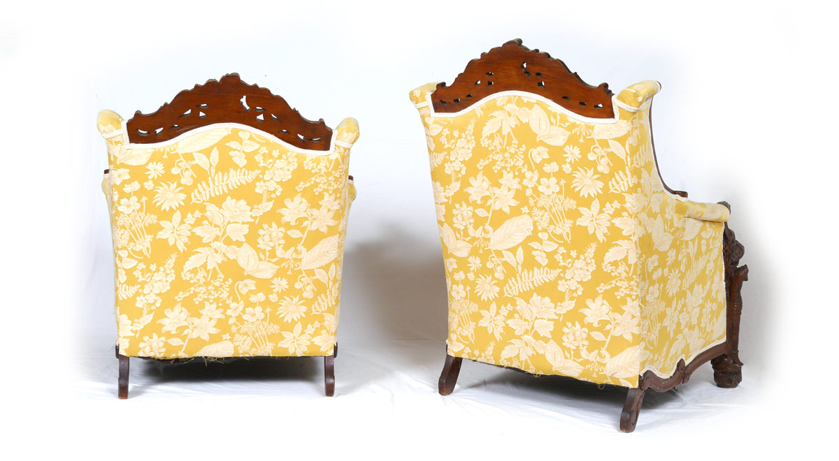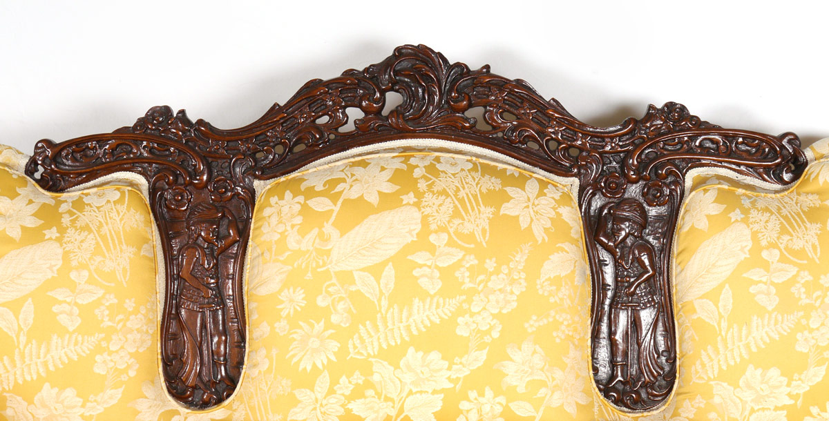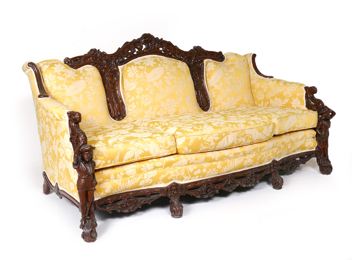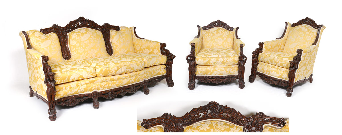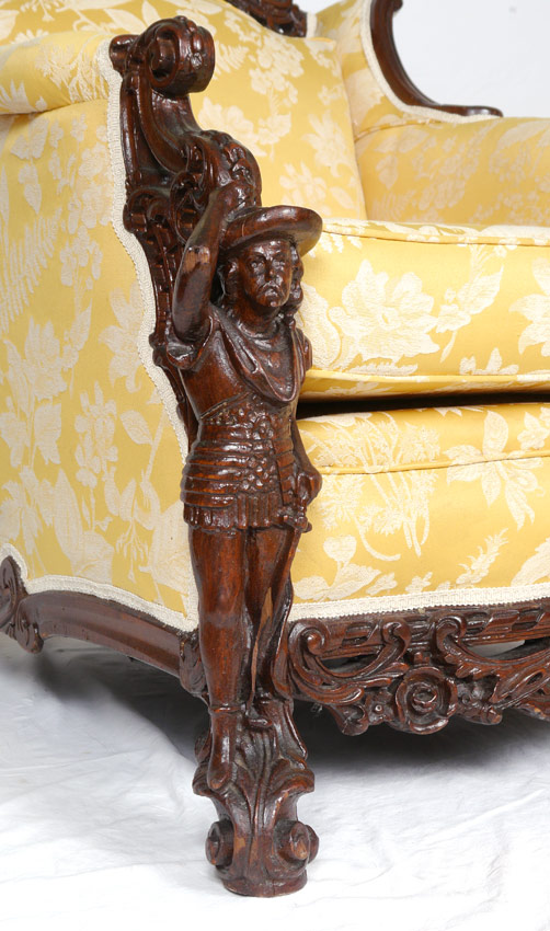 3 PIECE FIGURAL CARVED PARLOR SET: Profusely carved with figural conquistador or explorer arm supports on all, figural explorers on back of sofa. Patterned yellow upholstery. Sofa 40 1/2'' h. x 79'' x 42'', father arm chair 42 3/4'' h. x 33'' x 32 1/2'', mother arm chair 38'' h. x 41'' x 34''.