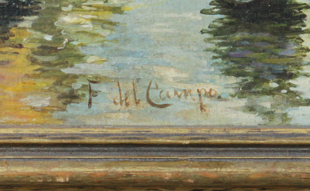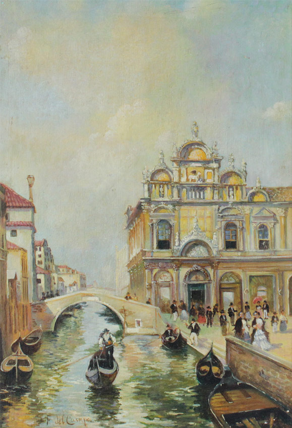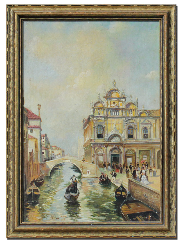 VENETIAN CANAL SCENE PAINTING AFTER DEL CAMPO: Oil/Wood Panel, 19 1/8'' x 13 1/4'', spuriously signed lower left, carved and gilded frame with minor wear 21 3/4'' x 16''.