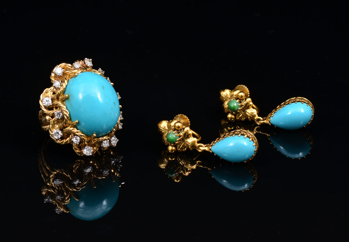 TURQUOISE & DIAMOND RING AND EARRINGS: 18K yellow gold ring centering a large cabochon cut turquoise framed in rope twist set with brilliant and single cut diamonds totaling approx. .75 Ct., VS in clarity and H-I in color. Size 6. Weight: 17.8 grams. The earrings are 14K with cabochon cut turquoise. French screw backs. All stones are prong set. 14K Weight: 6.8 grams.