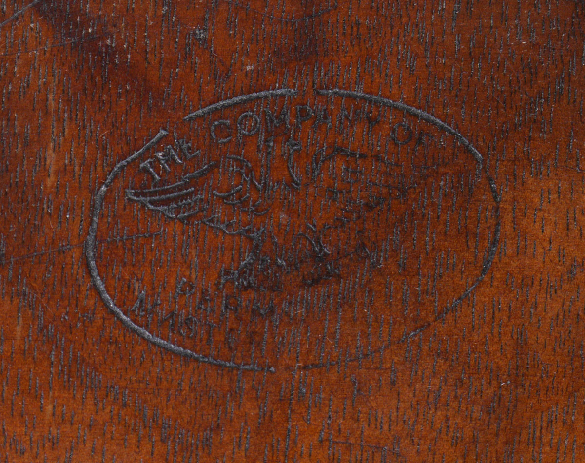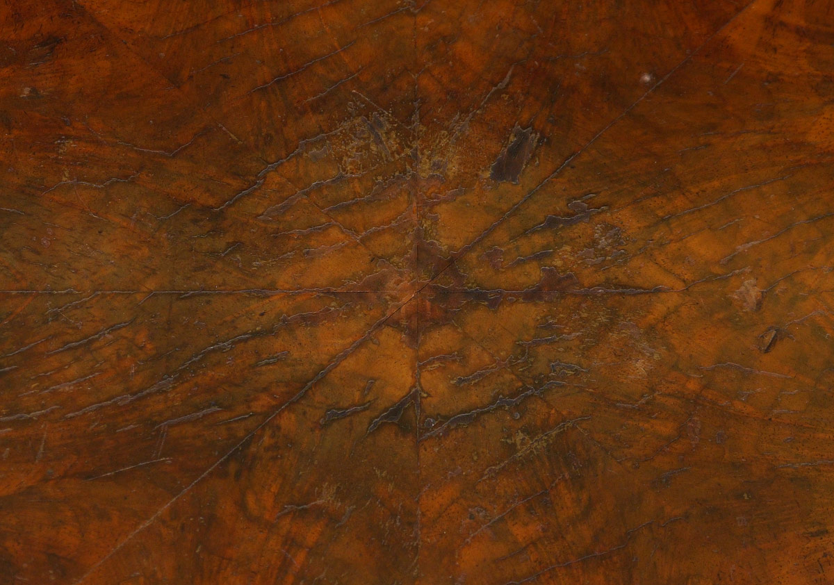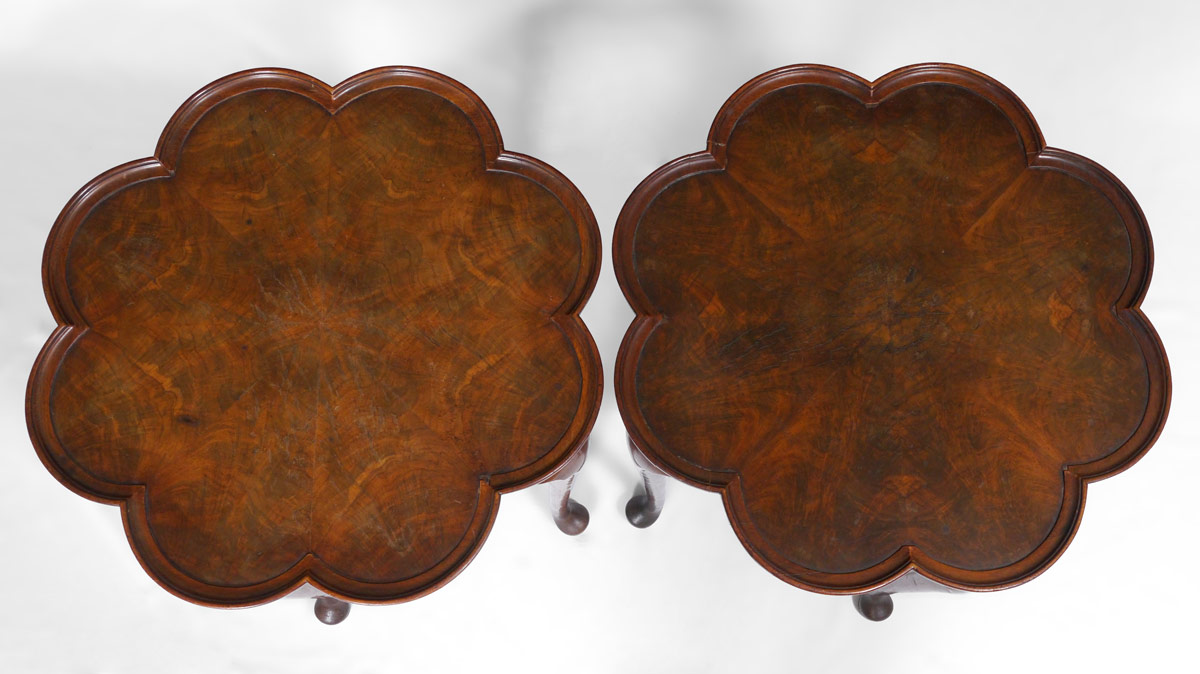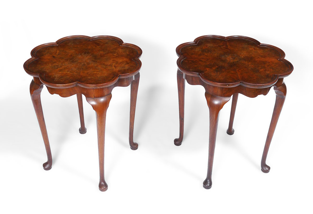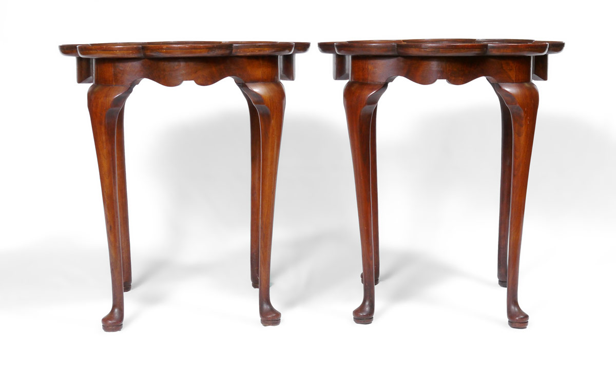 PAIR MASTER CRAFTSMAN BURL WALNUT SIDE TABLES: For W & J Sloane Company, 8 sided shaped burl walnut veneer top, shaped skirt, Queen Anne legs ending in pad feet. Partial The Company of Master Craftsman mark underneath 26 1/4'' h. x 24 1/4''.