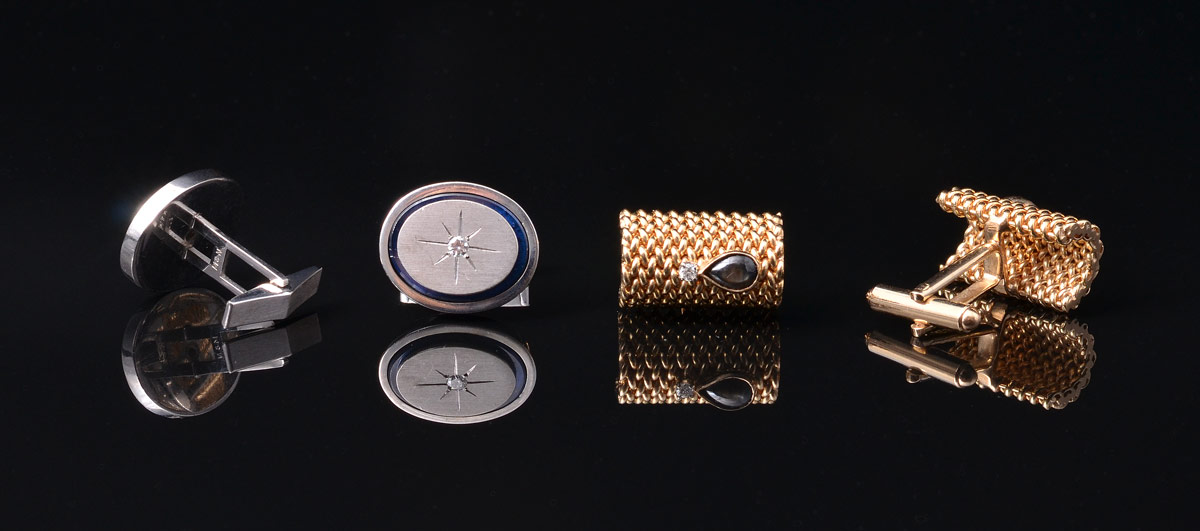 2 SETS OF 14K GOLD CUFFLINKS: 1) Yellow gold with black star sapphire and diamond. 2) Oval shaped white gold centering a diamond. Total diamond weigh: .25 Ct. Star sapphire weight: 2.50 Ct. Gold weight 39.4 grams.