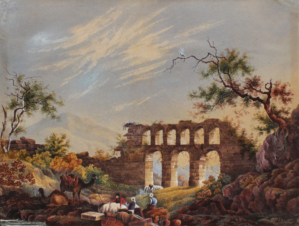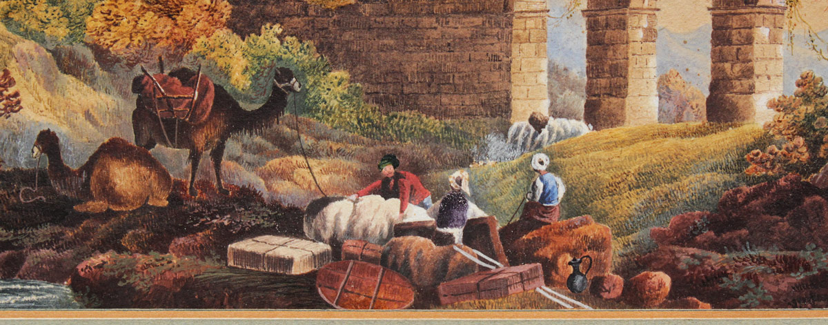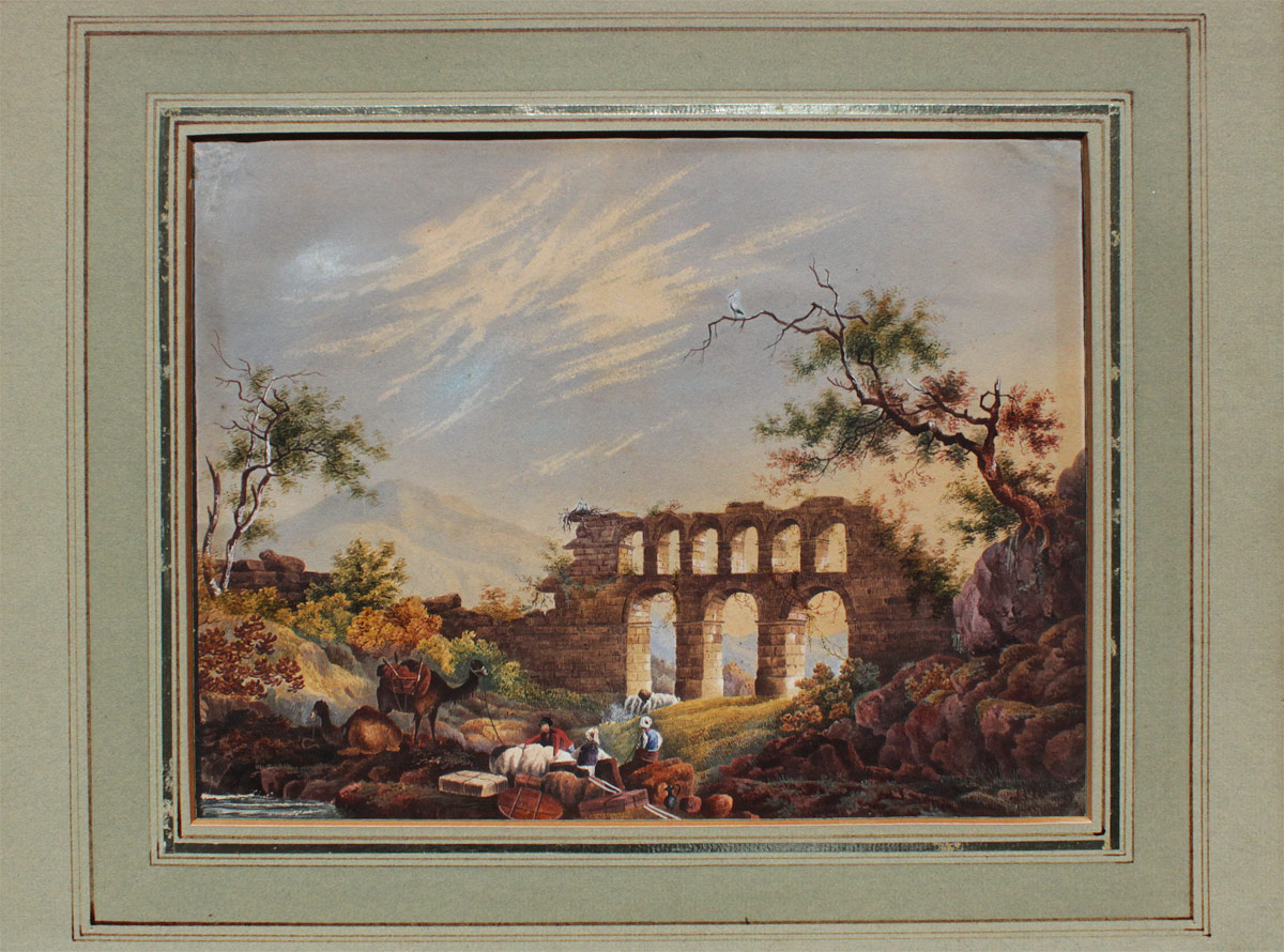 EXCEPTIONAL DETAILED 19TH CENTURY WATERCOLOR OF ARABS TRAVELING IN A LANDSCAPE WITH RUINS: Watercolor, Sight size 8 1/2'' x 11'', no visible signature, worn frame 13 3/4'' x 18''.