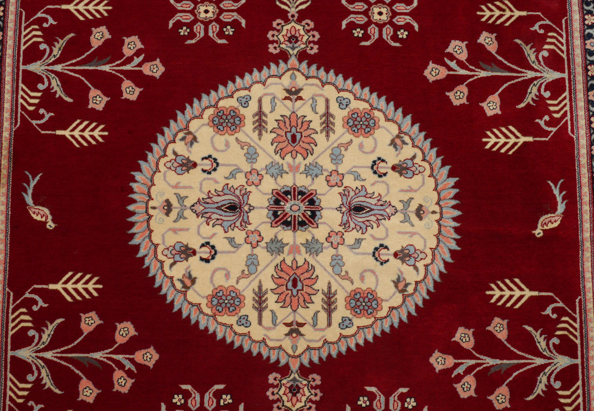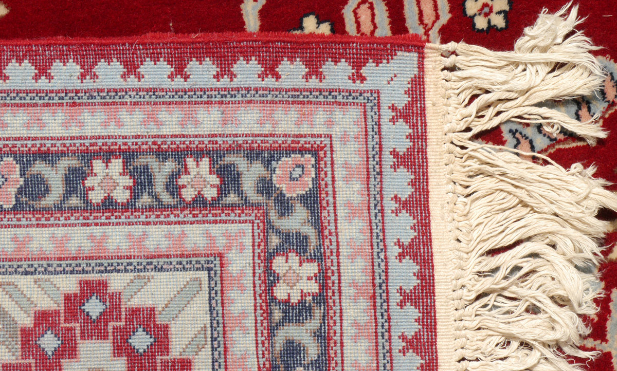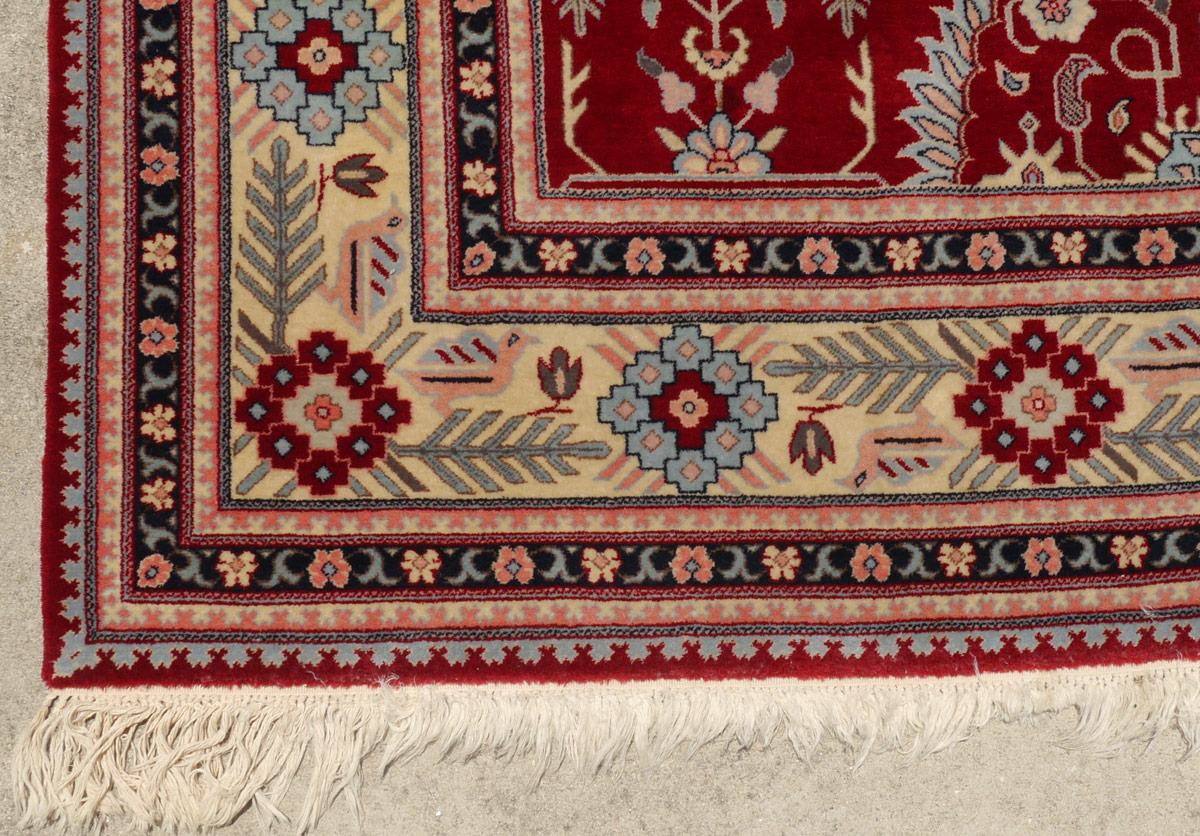 APPROX. 20-35YR. OLD INDO PERSIAN HAND KNOTTED WOOL RUG, 8' x 10': This rug has an interesting juxtaposition of geometric and curvilinear design motifs. The striking red field has a large round white ground central medallion and two half round outlines of medallions, one on either end of the field. The central medallion has design motifs of pastel flowers, leaves, and palmettes, while the two half medallions have more geometric diamond shaped palmettes with angular vines and leaves. The rest of the field has some complete plants, birds, and geometric designs done in pastel colors. The white ground border helps to frame the field and make the velvety looking red center look very rich and inviting.