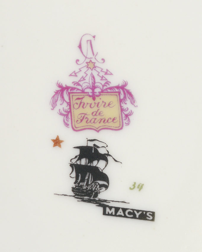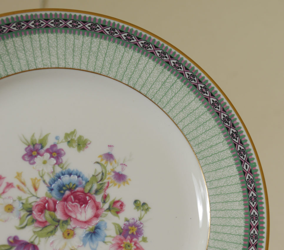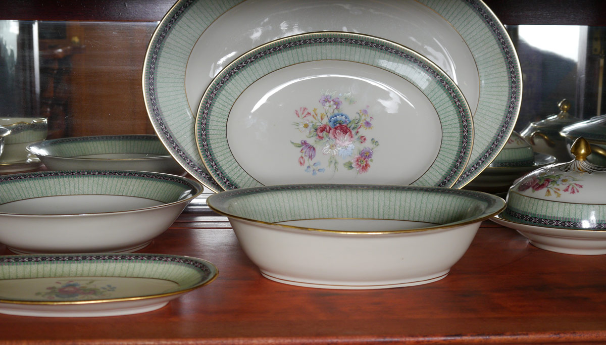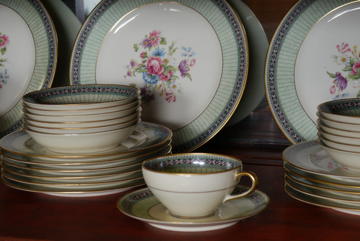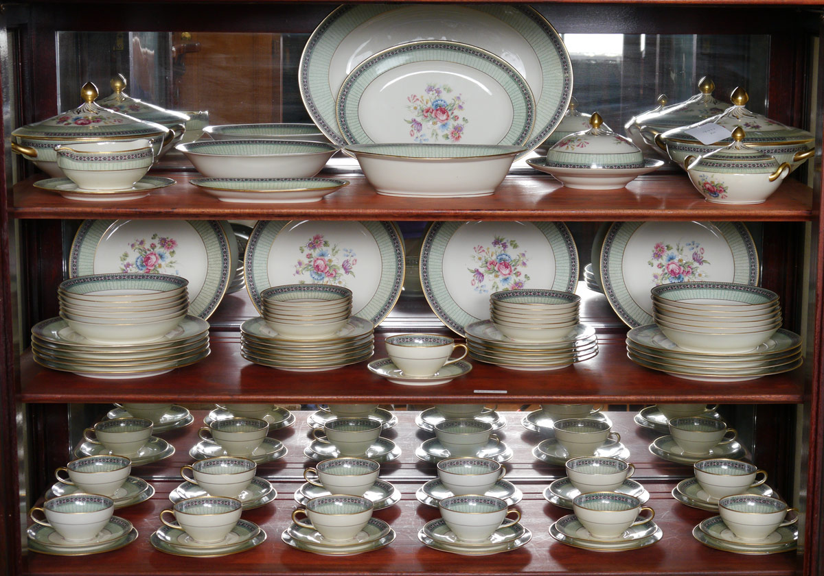 CHARLES AHRENFELDT FRENCH LIMOGES FINE CHINA: Approx. 95 pieces to include 13 dinner plates (9 3/4''), 11 salad plates, 12 soup bowls, 12 bread, 12 dessert bowls. 12 cups, 13 saucers, domed butter with insert, 2 covered vegetable, oval vegetable, round vegetable. relish, covered sugar, and 2 platters (12 1/2'' and 16''). Retailed through Macy's.