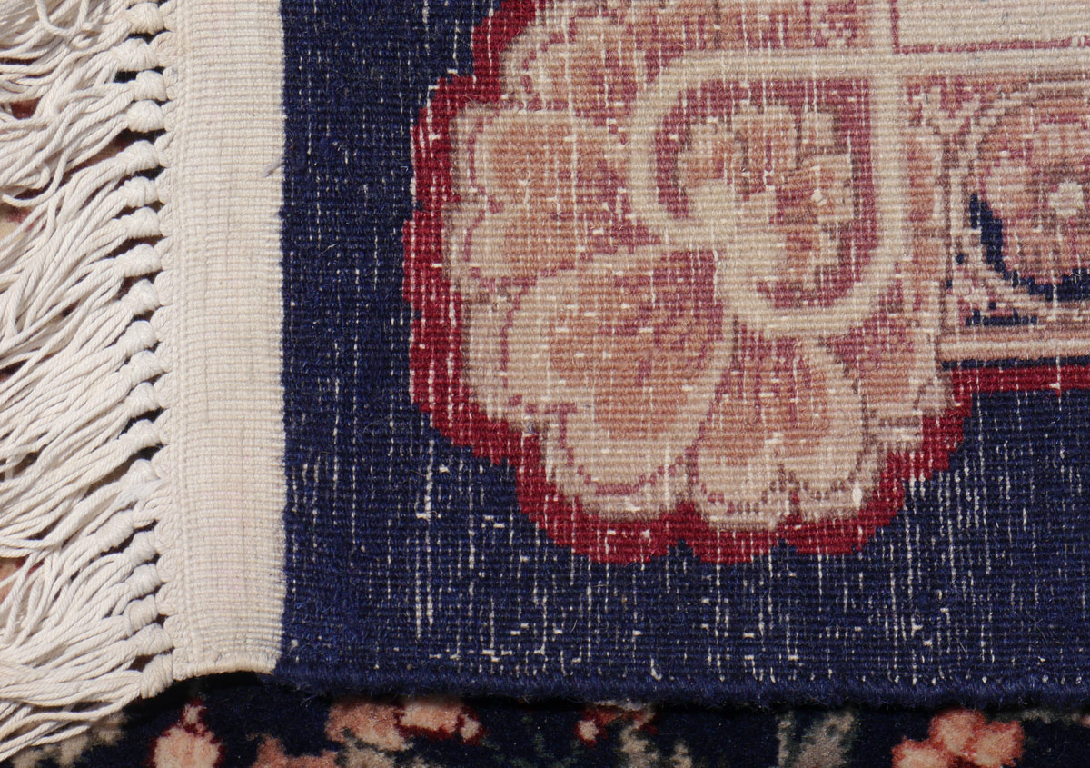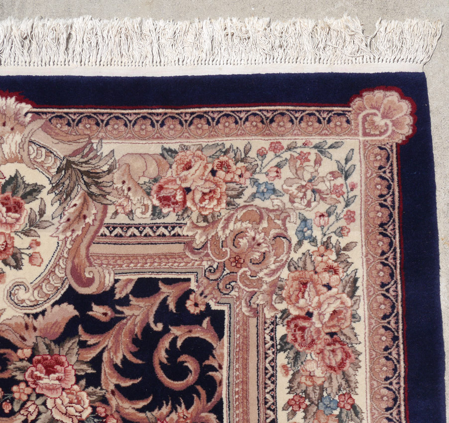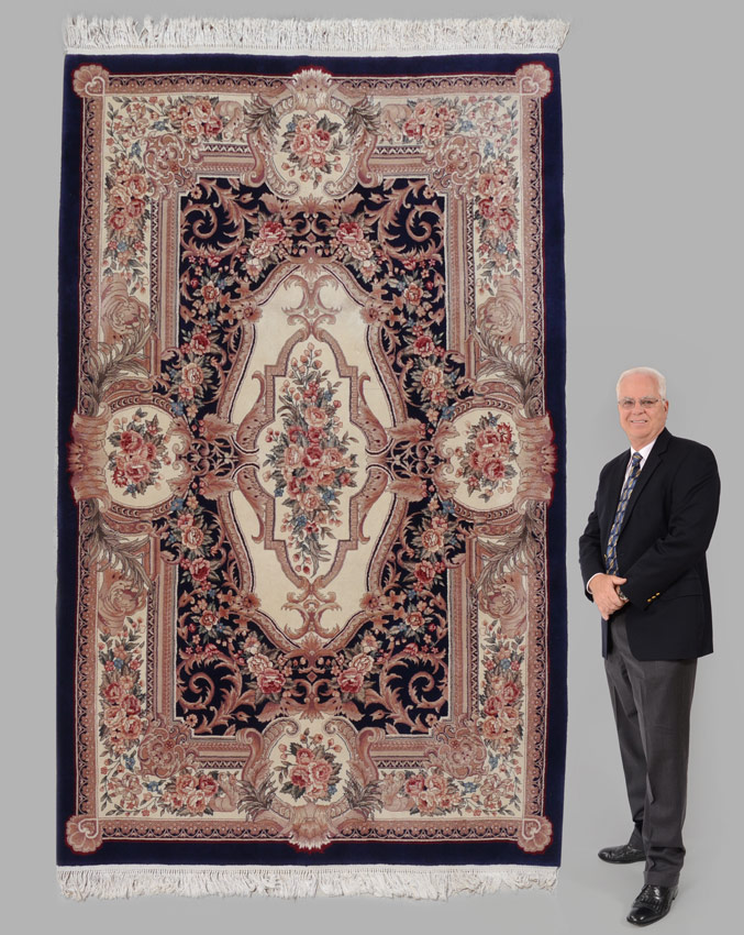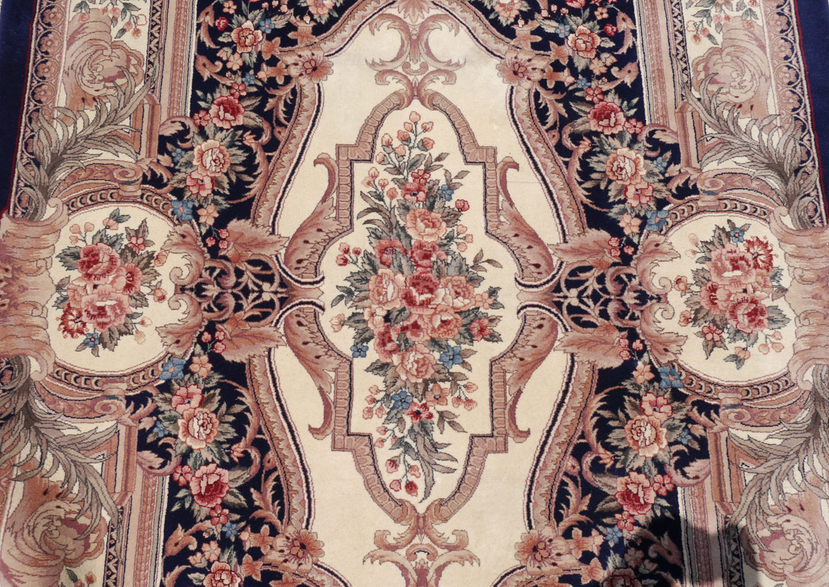 HAND KNOTTED WOOL, 20-30 YRS OLD, SINO-PERSIAN AUBUSSON DESIGN RUG, 5' 10'' x 8' 11'': This rug has an attractive Aubusson pattern that was woven in China using Persian knots. The black background of the central field has a large white ground oval medallion that has four smaller white medallions one on each side. These smaller medallions go from the field into the white ground border of the rug and like the main medallion are outlined with a pinkish beige ribbon like edge. In the center of each medallion are found sprays of realistically drawn roses in shades of pink and red. These same flowers are also found in the field of the rug intertwined with leafy vines in the same pinkish beige as the edges. The outer border of the rug is a solid black. Condition is good.
