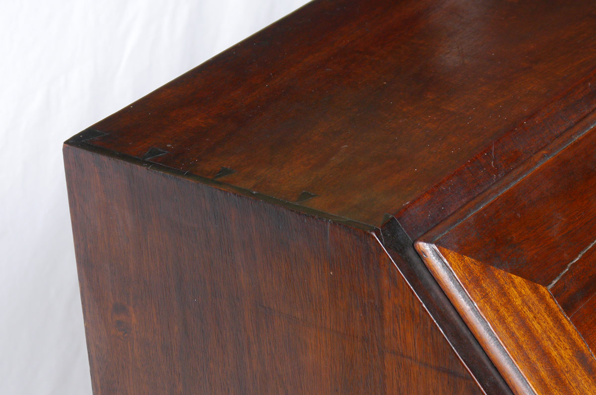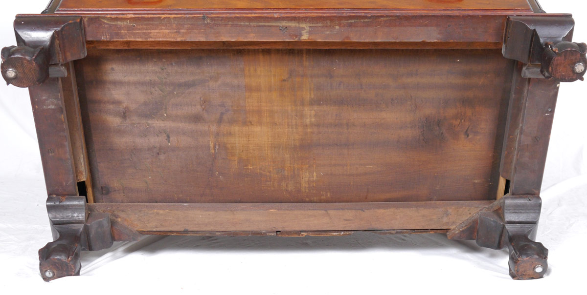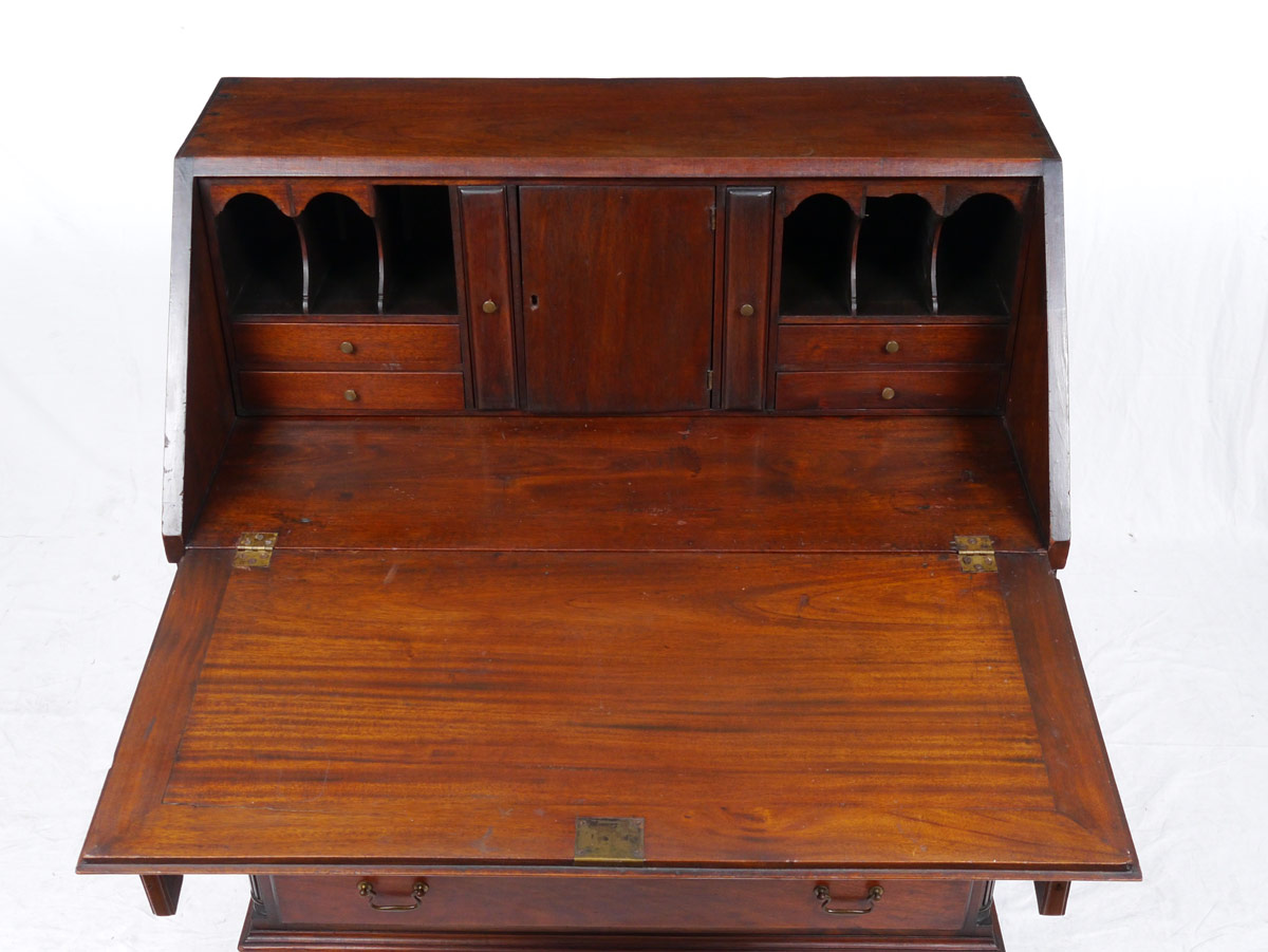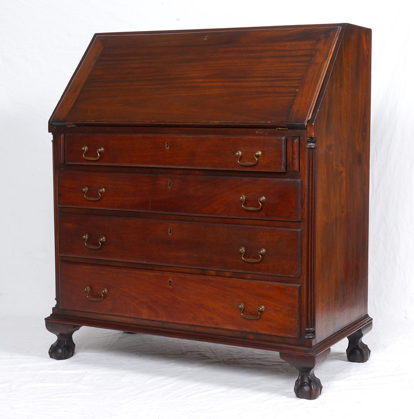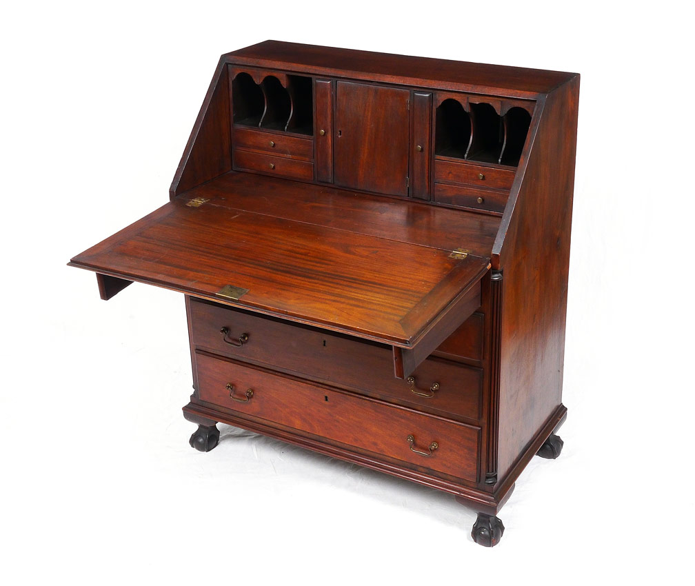 19TH CENTURY MAHOGANY DROP FRONT DESK: Early 19th century slant front with internal drawers, doors and pigeon holes with shaped valences. 4 graduated drawers, claw and ball feet. 42 1/2'' h. x 37 3/4'' x 19 1/2''.