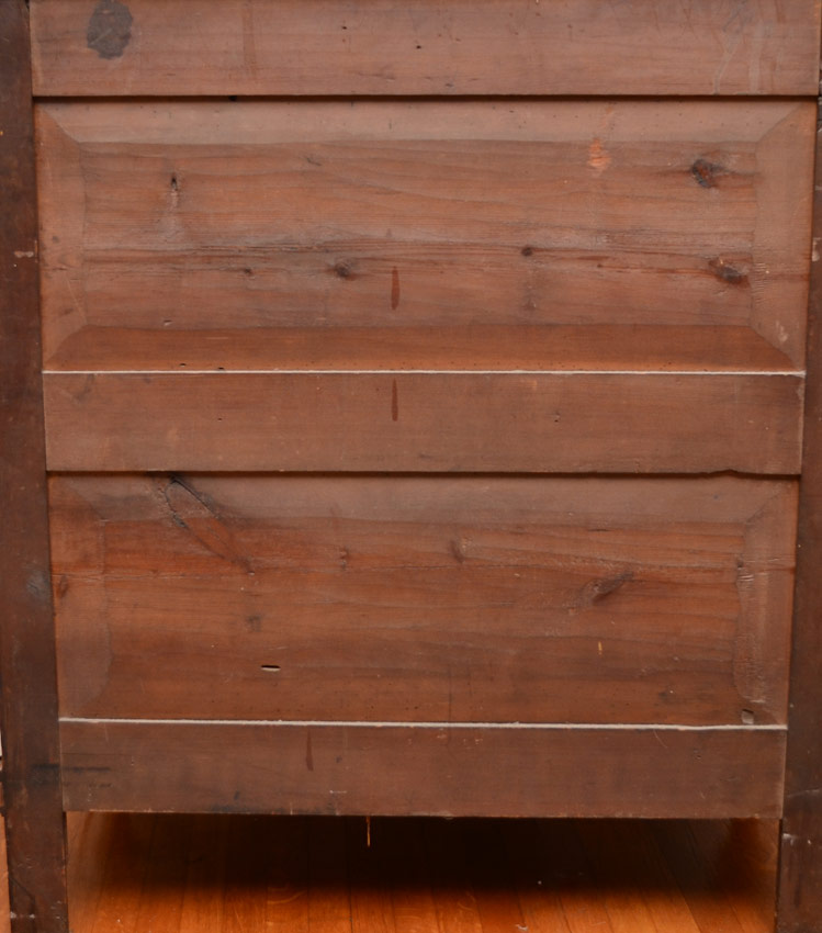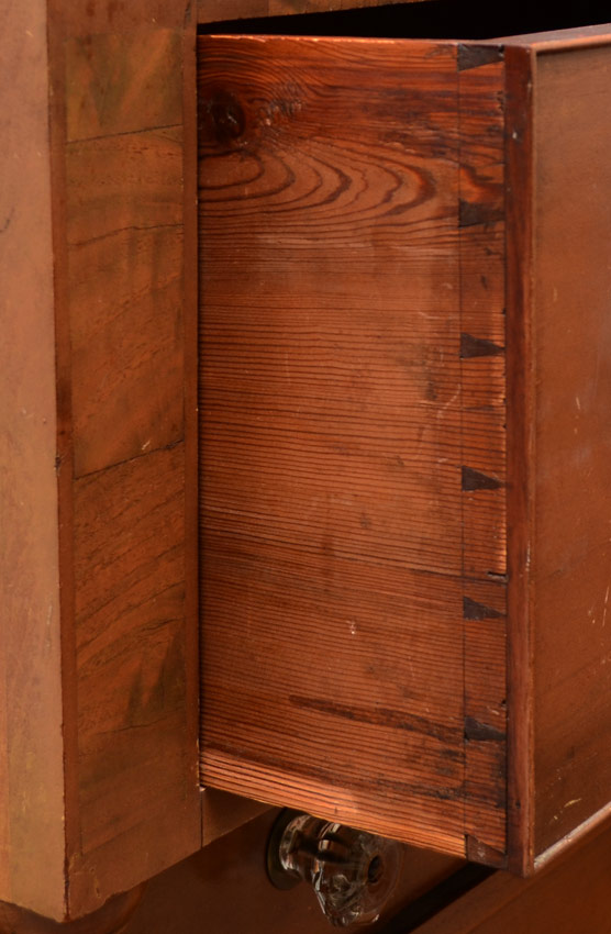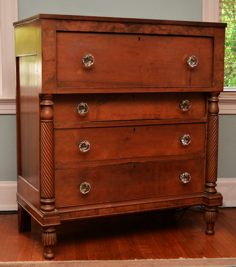 EARLY EMPIRE CHEST OF DRAWERS: Deep top drawer over 3 drawers, carved half column stiles, carved front feet. Replacement Lucite pulls. 48'' h. x 42 3/4'' x 22 1/2''.