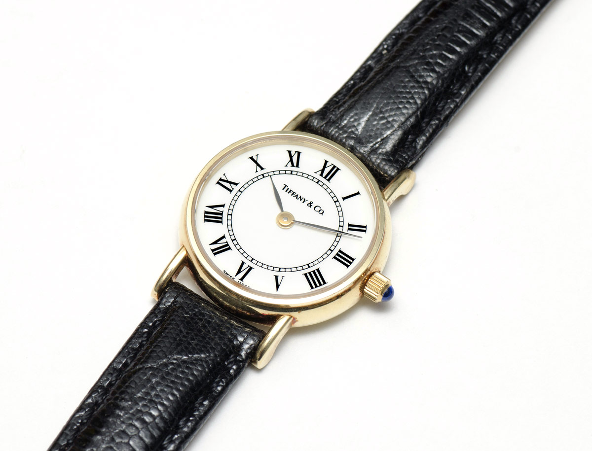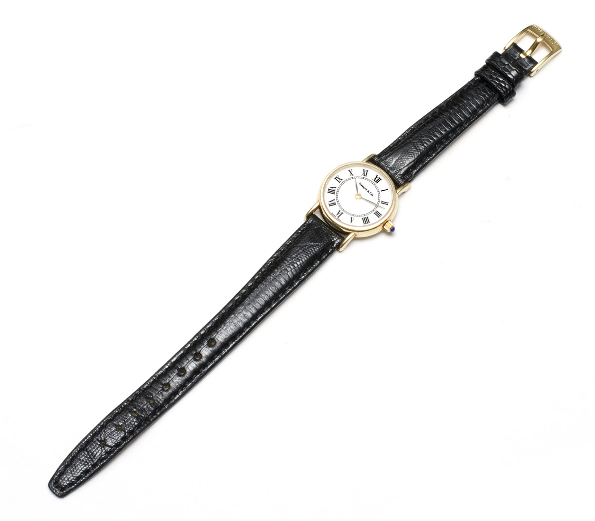 14K TIFFANY & CO LADIES WRISTWATCH: 14K yellow gold watch, Swiss quartz movement in working order. Serial number 990280944. The dial, lizard leather band and buckle are all signed Tiffany & Co. Roman numerals on the dial. Sapphire crown. Length: 7 3/4''