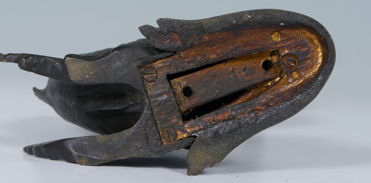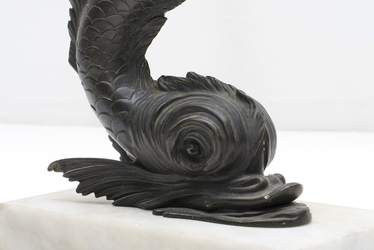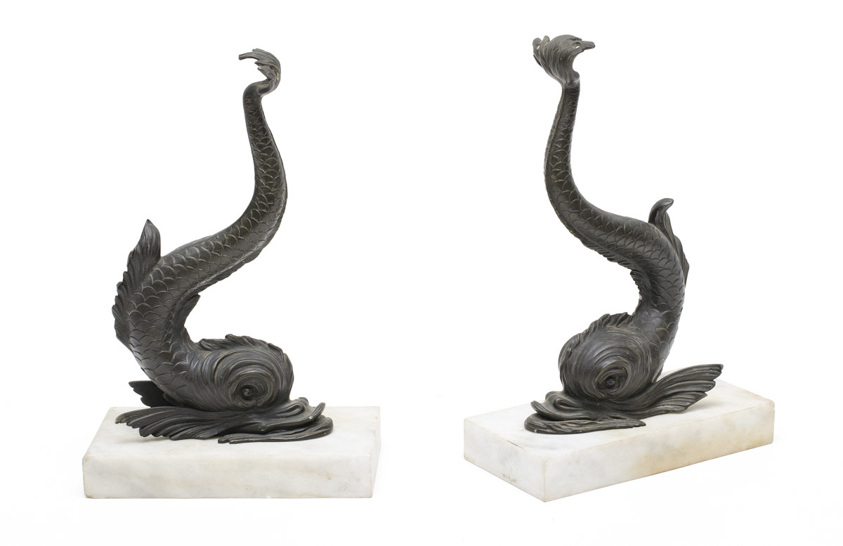 PAIR BRONZE FIGURAL DOLPHINS: Cast bronze figural dolphin with marble bases, could be used as bookends or doorstops. Dolphins not affixed to bases. Dolphin measures 10 3/4'' x 6'' x 2 3/4'', marble 1 1/4'' x 8'' x 4''.