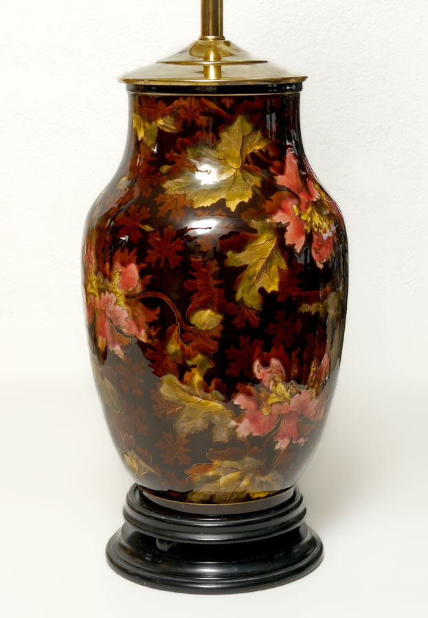 KELLER & GUERIN FRENCH PORCELAIN LAMP: Barrel form body covered with intricate flowers with gilt highlights, bears hand painted mark on bottom from firm of Keller & Guerin of Luneville, France, circa early 1900's, on wood base. Overall 29 3/4'' h. x 7 1/4''. Sold with cloth shade 12'' h. x 16''.