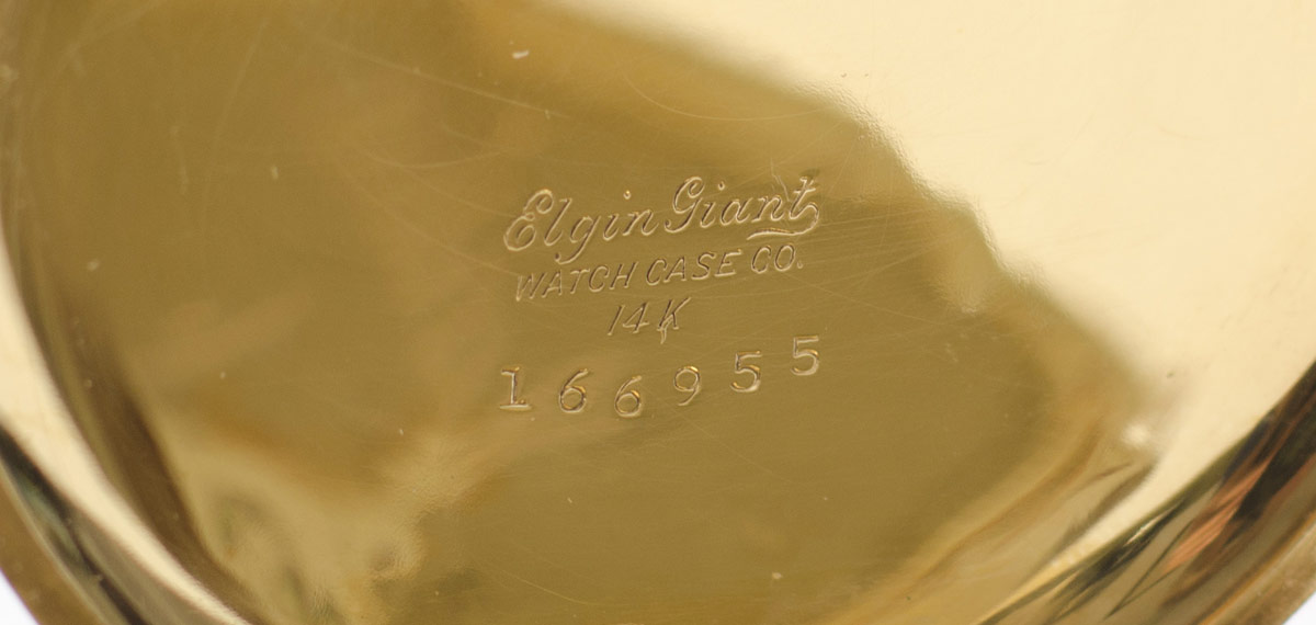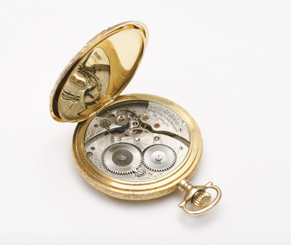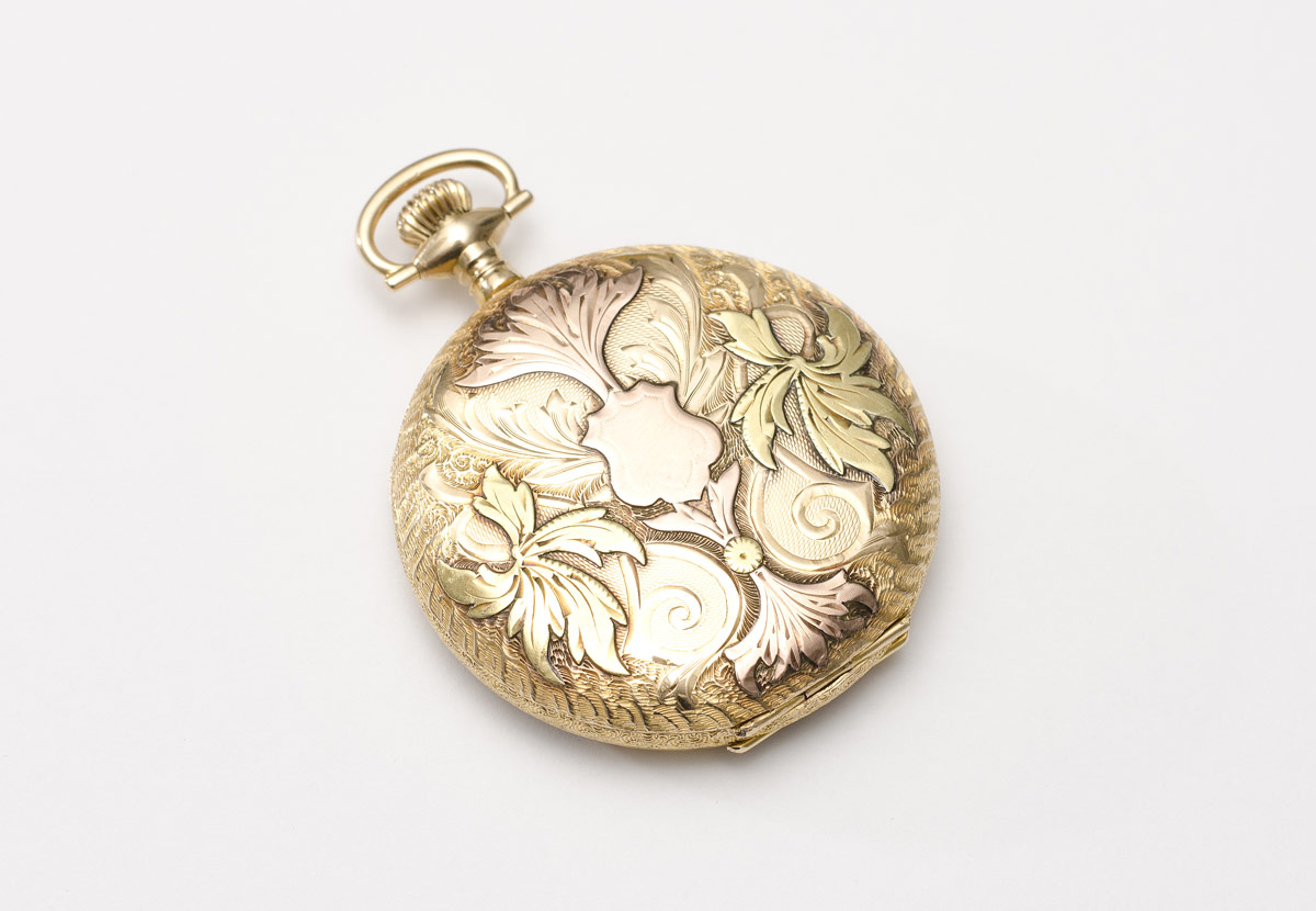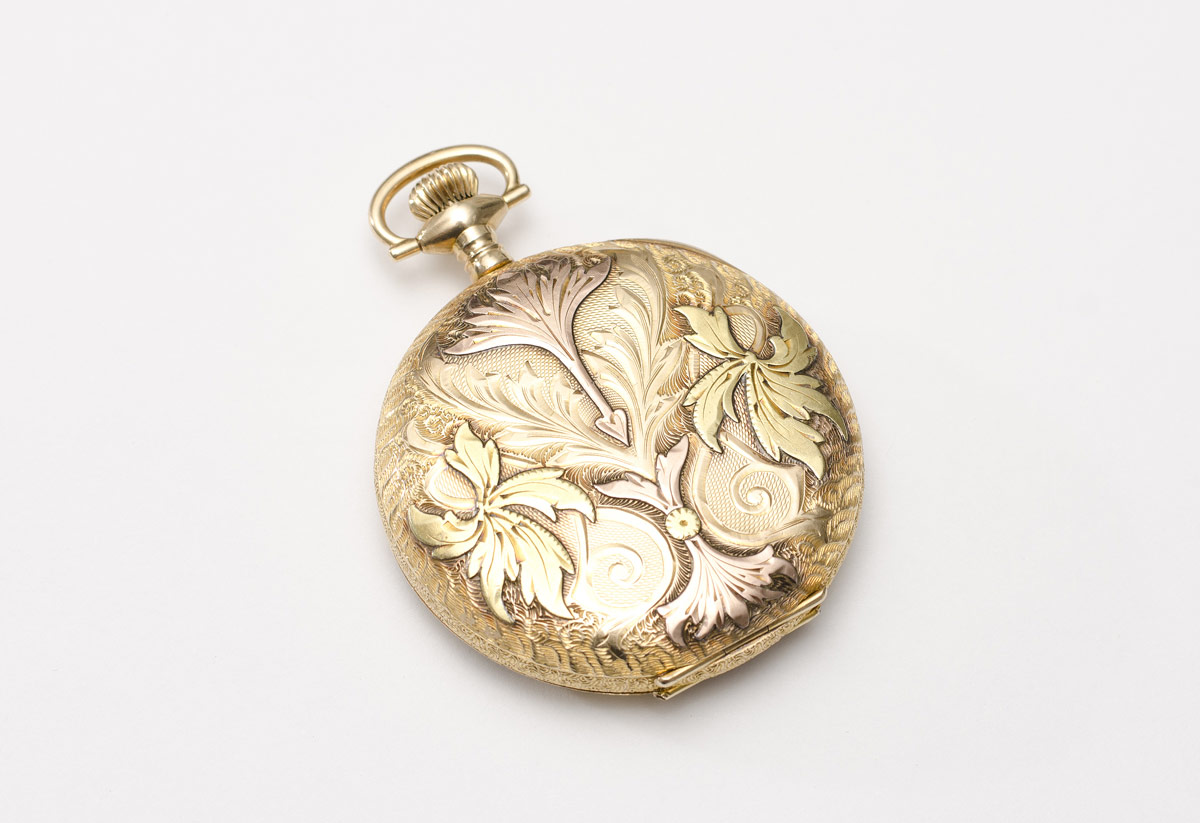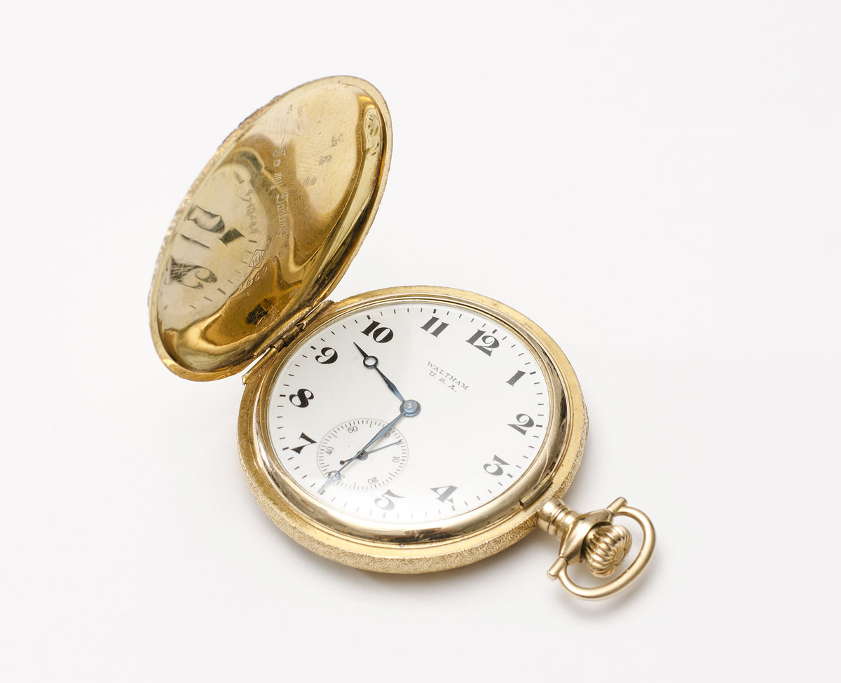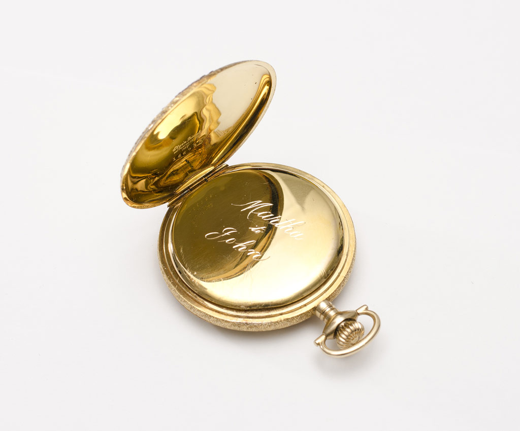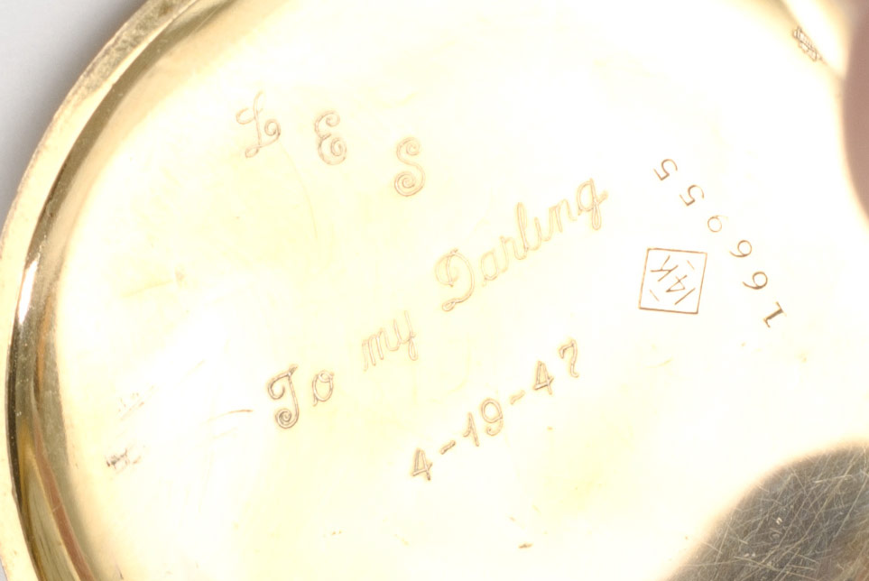 WALTHAM GOLD POCKET WATCH: Ornate 14K rose and yellow gold hunter's case with interior inscription ''To My Darling 4-19-47''. 15 jewel movement in working order. Size 12. 73.6 grams all inclusive.