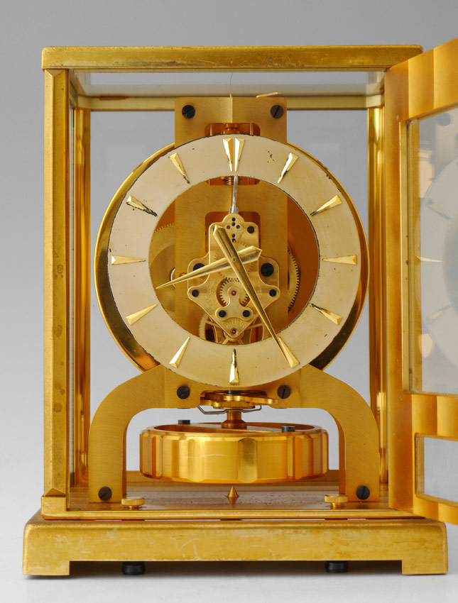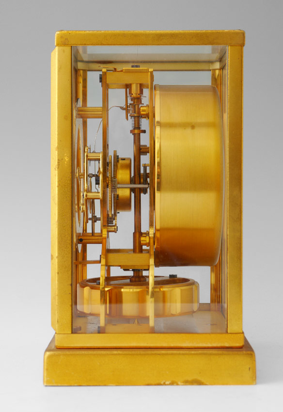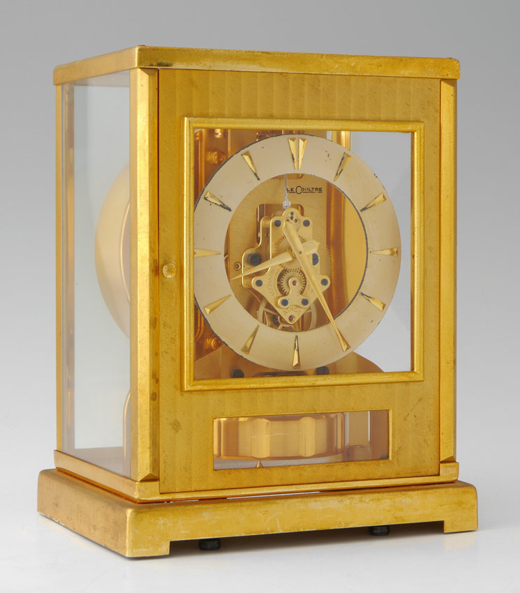 1950'S MODEL 522 LECOULTRE ATMOS CLOCK: Serial number 66500 dates to the mid 1950's, brass case with glass sides, brass front door with 2 glass windows. 15 jewel movement. Measures 9'' h. x 7'' x 5 1/4''.