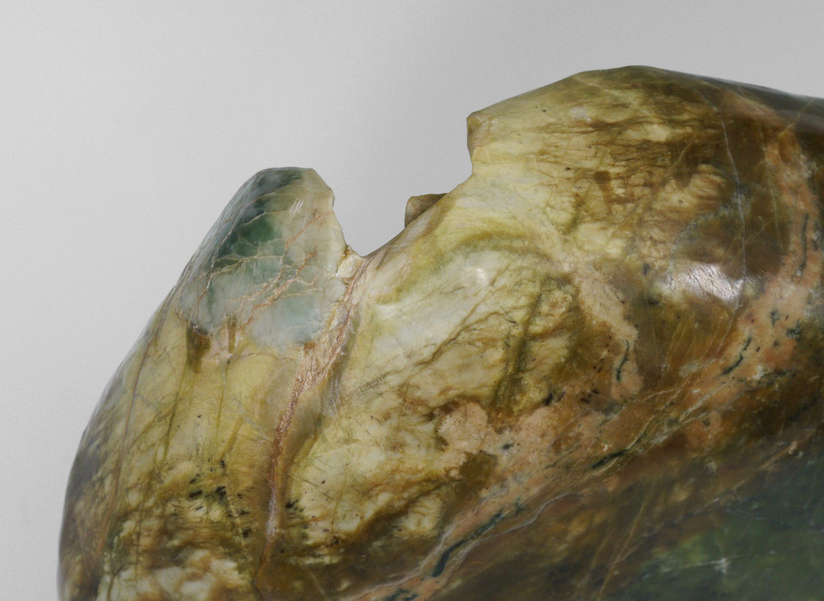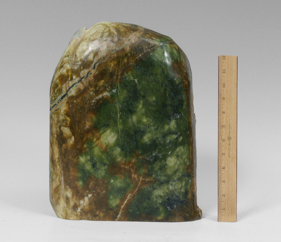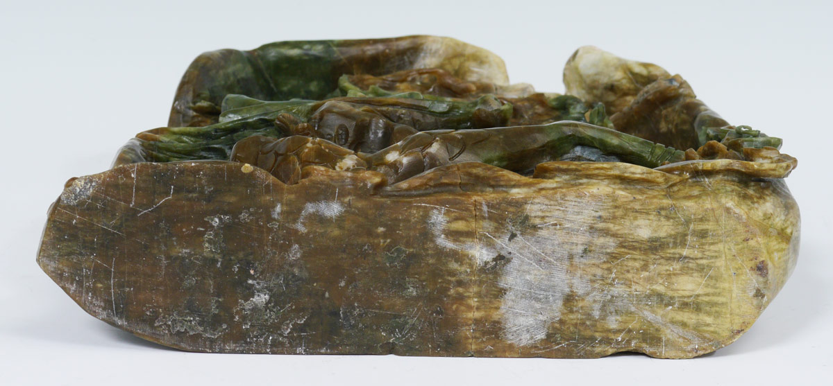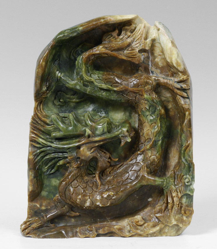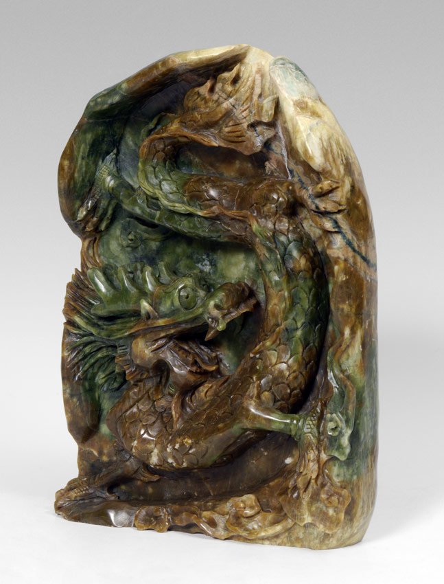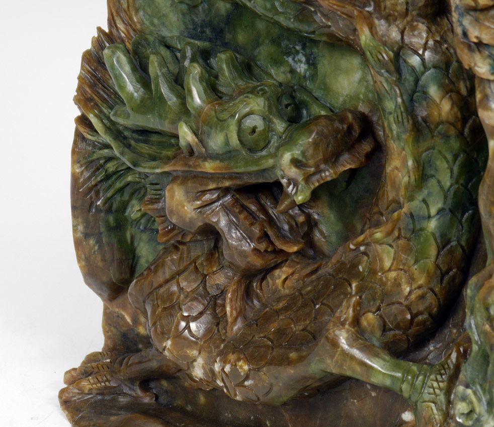 LARGE CARVED CHINESE HARD STONE FIGURAL DRAGON PLAQUE: A mottled hard stone with tans, browns and greens. Measures 14 1/2'' h. x 11 1/2'' x 3''.
