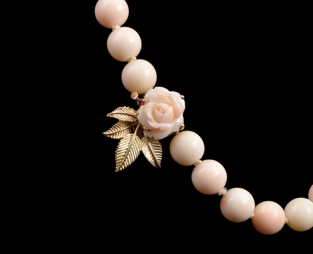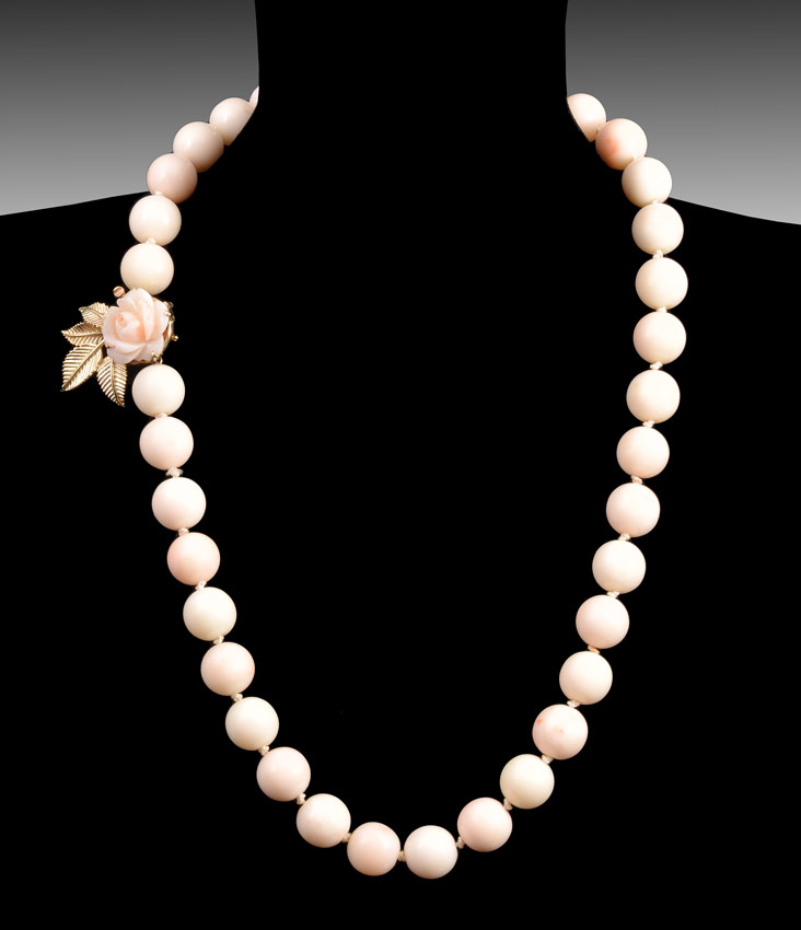 ANGEL SKIN CORAL BEAD NECKLACE: An 18'' strand of 10 MM coral beads with a 14K yellow gold and carved coral flower clasp.