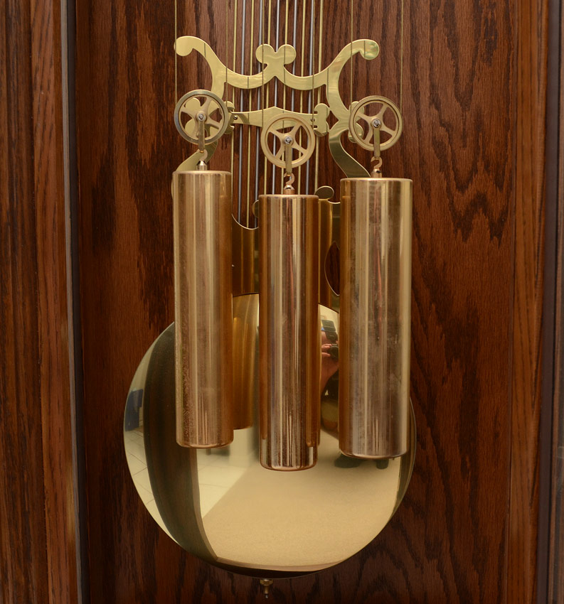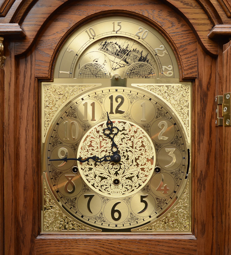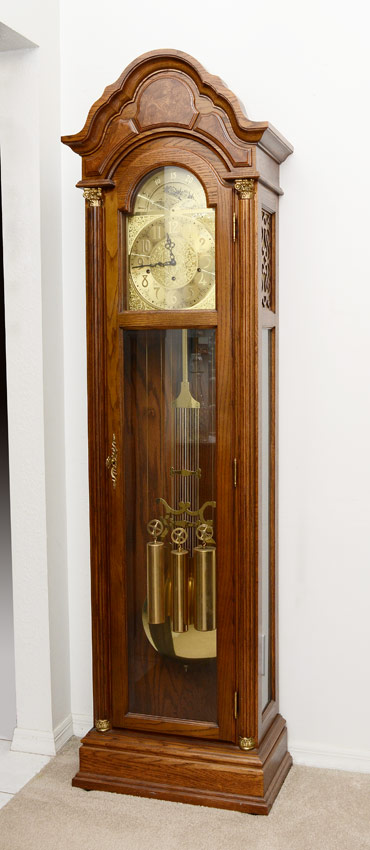 PEARL TRIPLE CHIME GRANDFATHER CLOCK: Wood case with burl veneer accents. Embossed brass face with moonphase and triple chime selector. Case with fluted half columns with brass accents. 79 1/2'' h. x 22 1/2'' x 12 1/4''.
