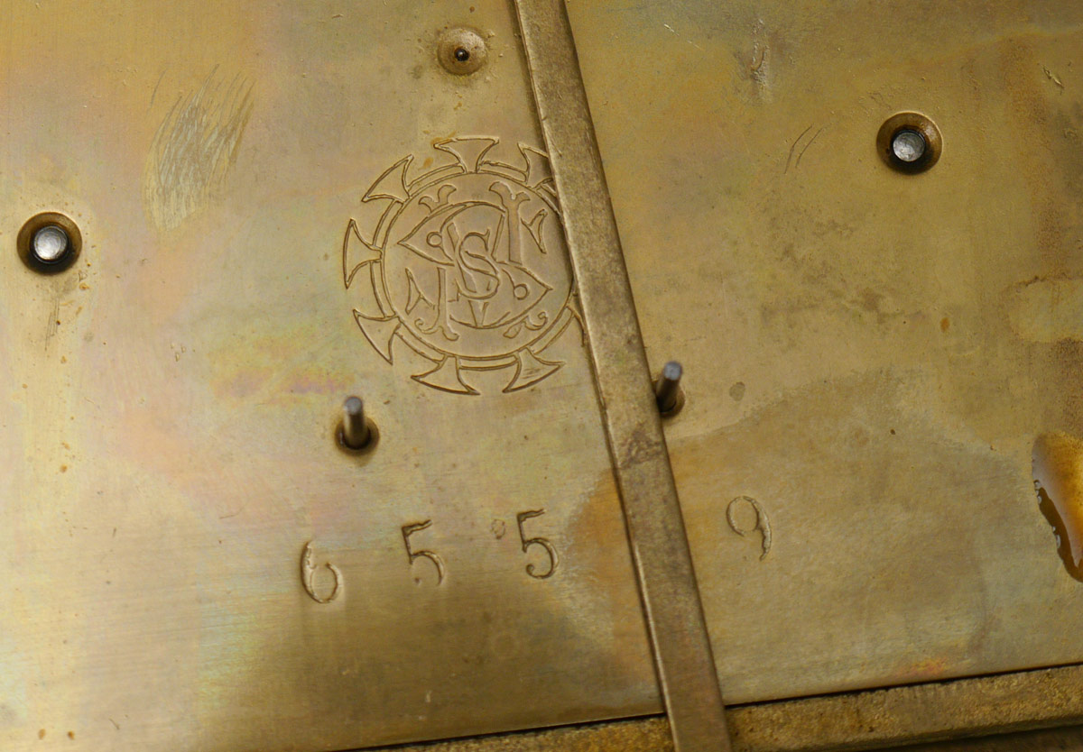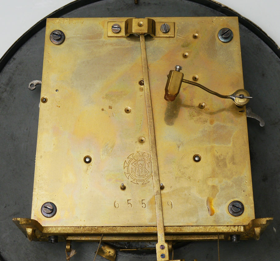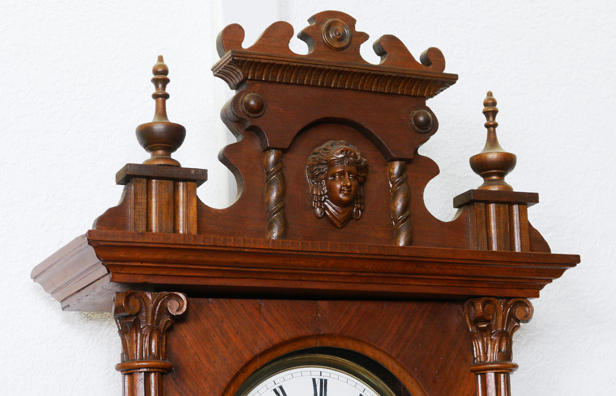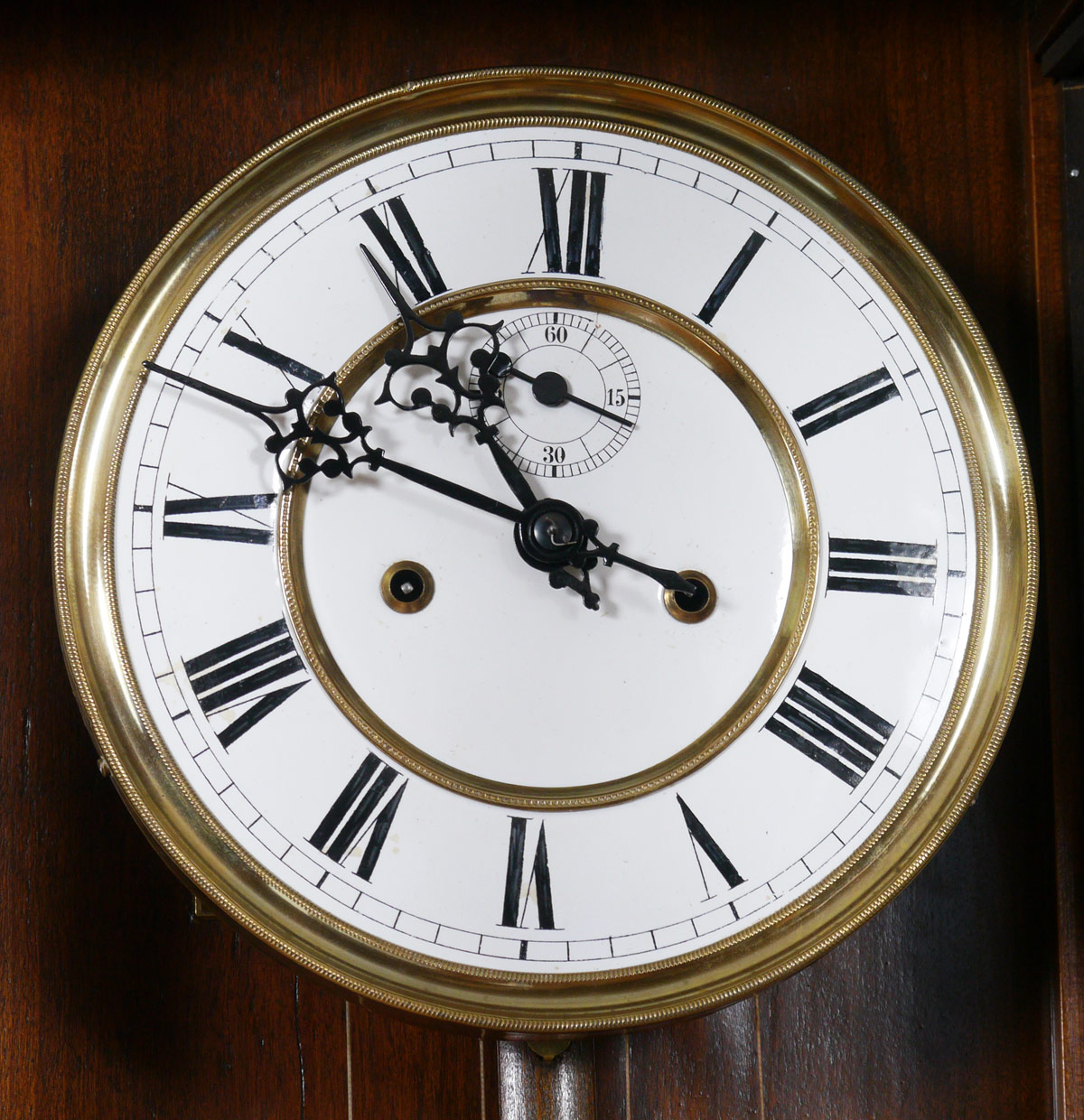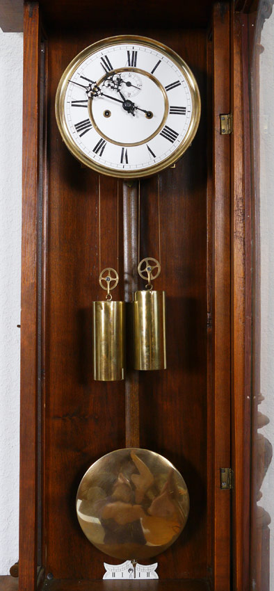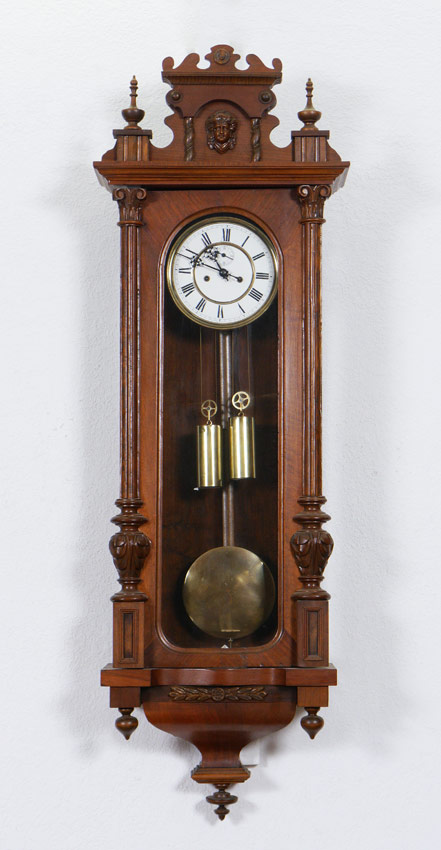 DUAL WEIGHT VIENNA REGULATOR WALL CLOCK: Removable pediment with applied decoration and masqueron. Walnut case, porcelain dial with Roman numerals and second dial. German Schlenker time and strike movement, S in medallion and serial number 65539 marked on works. Overall 48'' h. x 16'' x 6 3/4''.