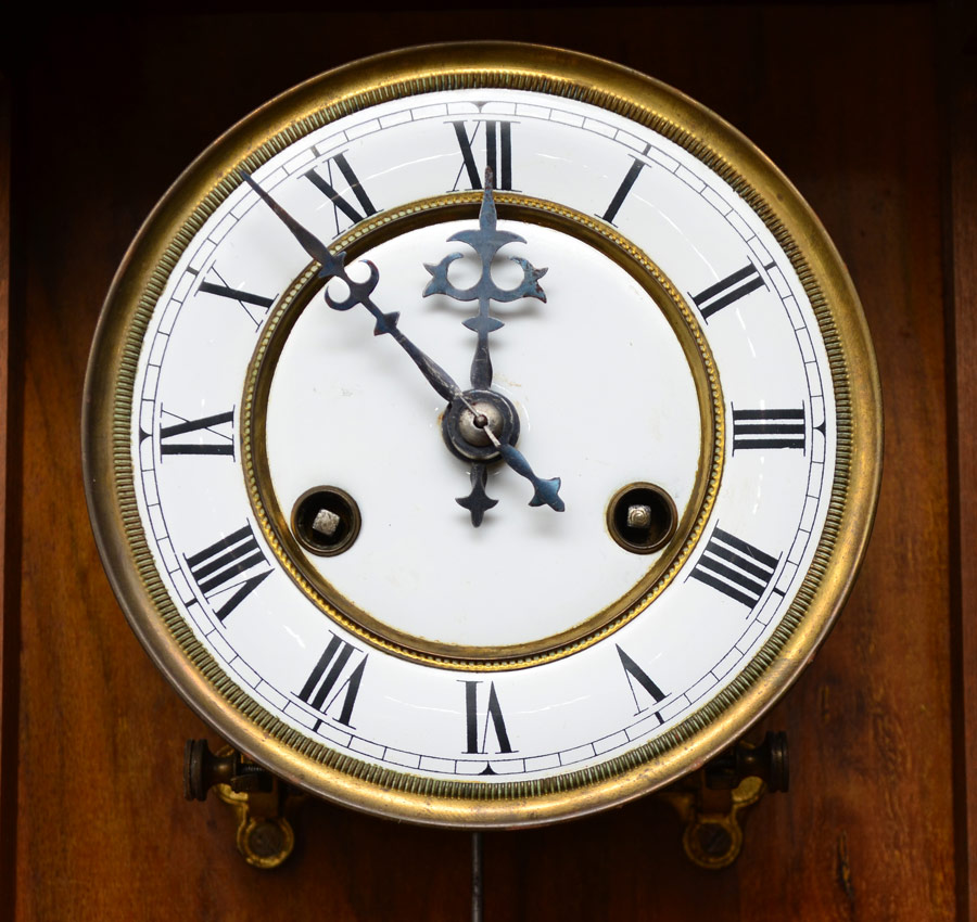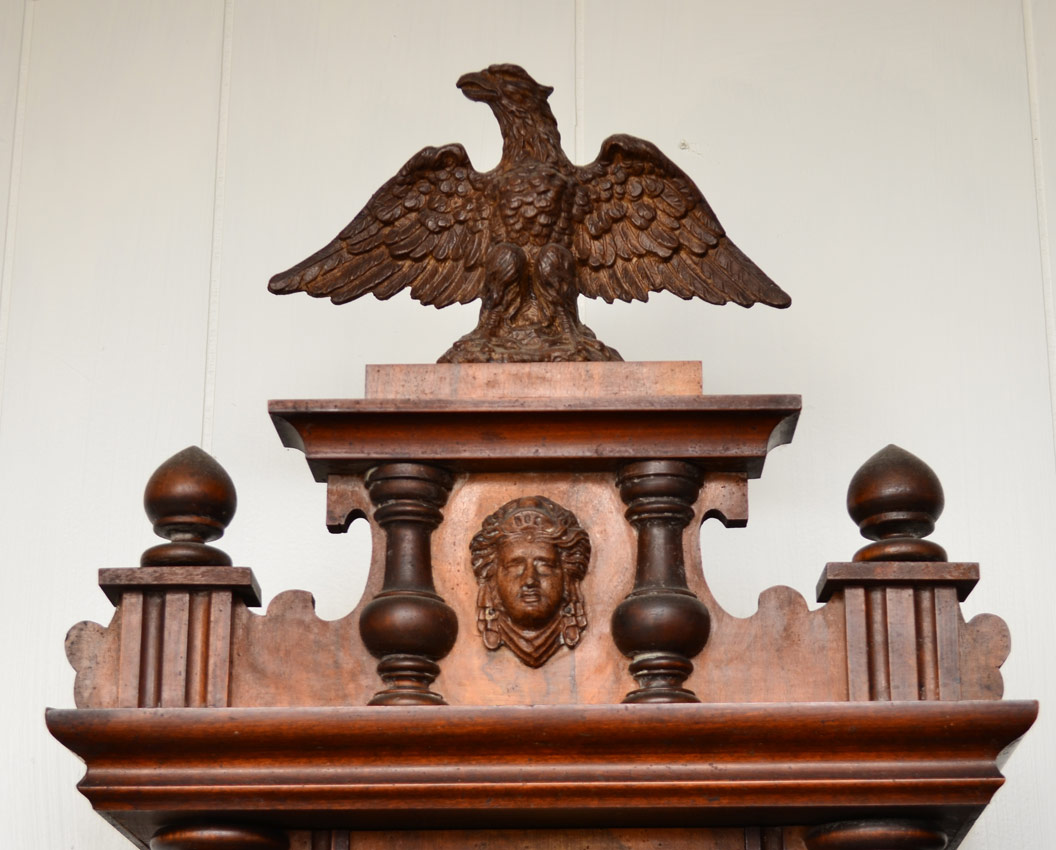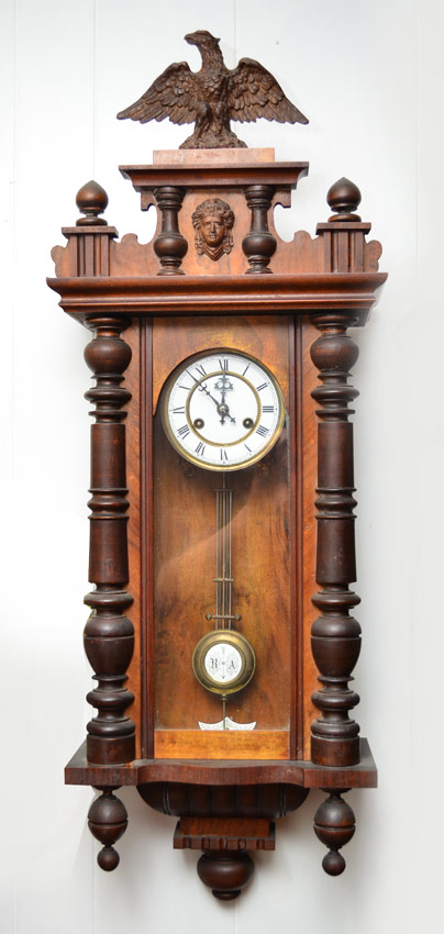 KIENZLE WALNUT VIENNA REGULATOR WALL CLOCK: Architectural pediment with full eagle finial, applied decoration. Walnut case. Porcelain dial with Roman numerals. Kienzle key and pendulum, time and strike movement marked with clock with wings. Overall 40'' h. x 15'' x 7''.